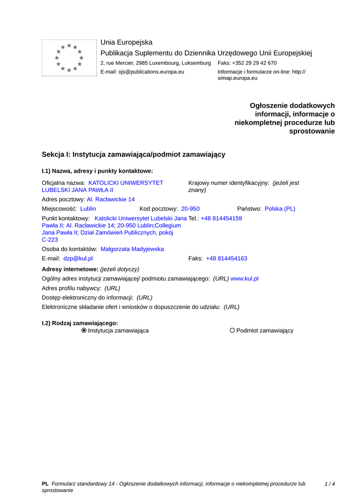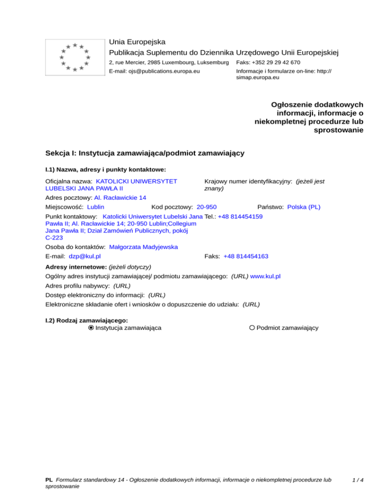 Unia Europejska Publikacja Suplementu do Dziennika Urzędowego Unii Europejskiej 2, rue Mercier, 2985 Luxembourg, Luksemburg Faks: +352 29 29 42 670 E-mail: [email protected] Informacje i formularze on-line: http:// simap.europa.eu Ogłoszenie dodatkowych informacji, informacje o niekompletnej procedurze lub sprostowanie Sekcja I: Instytucja zamawiająca/podmiot zamawiający I.1) Nazwa, adresy i punkty kontaktowe: Oficjalna nazwa: KATOLICKI UNIWERSYTET LUBELSKI JANA PAWŁA II Krajowy numer identyfikacyjny: (jeżeli jest znany) _____ Adres pocztowy: Al. Racławickie 14 Miejscowość: Lublin Kod pocztowy: 20-950 Państwo: Polska (PL) Punkt kontaktowy: Katolicki Uniwersytet Lubelski Jana Tel.: +48 814454159 Pawła II; Al. Racławickie 14; 20-950 Lublin;Collegium Jana Pawła II; Dział Zamówień Publicznych, pokój C-223 Osoba do kontaktów: Małgorzata Madyjewska E-mail: [email protected] Faks: +48 814454163 Adresy internetowe: (jeżeli dotyczy) Ogólny adres instytucji zamawiającej/ podmiotu zamawiającego: (URL) www.kul.pl Adres profilu nabywcy: (URL) _____ Dostęp elektroniczny do informacji: (URL) _____ Elektroniczne składanie ofert i wniosków o dopuszczenie do udziału: (URL) _____ I.2) Rodzaj zamawiającego: Instytucja zamawiająca Podmiot zamawiający PL Formularz standardowy 14 - Ogłoszenie dodatkowych informacji, informacje o niekompletnej procedurze lub sprostowanie 1/4 Sekcja II: Przedmiot zamówienia II.1.1) Nazwa nadana zamówieniu: Dostawa wraz z montażem mebli na potrzeby wyposażenia budynku Interdyscyplinarnego Centrum Badań Naukowych KUL, budynku Biotechnologii KUL oraz budynku Centrum Transferu Wiedzy KUL II.1.2) Krótki opis zamówienia lub zakupu: (podano w pierwotnym ogłoszeniu) Przedmiotem zamówienia jest dostawa wraz z montażem mebli na potrzeby wyposażenia budynku Interdyscyplinarnego Centrum Badań Naukowych KUL, budynku Biotechnologii KUL oraz budynku Centrum Transferu Wiedzy KUL z podziałem na części: □ Część 1 - DOSTAWA WRAZ Z MONTAŻEM MEBLI NA POTRZEBY WYPOSAŻENIA PORTIERNI I SZATNI W BUDYNKU ICBN W RAMACH REALIZACJI PROJEKTU „BUDOWA I WYPOSAŻENIE INTERDYSCYPLINARNEGO CENTRUM BADAŃ NAUKOWYCH KUL”, zgodnie z Załącznikiem nr 1.1 do SIWZ; □ Część 2 - DOSTAWA WRAZ Z MONTAŻEM MEBLI NA POTRZEBY WYPOSAŻENIA SALI KONFENRECYJNEJ NR 0.08 W BUDYNKU ICBN W RAMACH REALIZACJI PROJEKTU „BUDOWA I WYPOSAŻENIE INTERDYSCYPLINARNEGO CENTRUM BADAŃ NAUKOWYCH KUL”, zgodnie z Załącznikiem nr 1.2 do SIWZ; □ Część 3 - DOSTAWA WRAZ Z MONTAŻEM MEBLI NA POTRZEBY WYPOSAŻENIA HOLU W BUDYNKU ICBN W RAMACH REALIZACJI PROJEKTU „BUDOWA I WYPOSAŻENIE INTERDYSCYPLINARNEGO CENTRUM BADAŃ NAUKOWYCH KUL”, zgodnie z Załącznikiem nr 1.3 do SIWZ; □ Część 4 - DOSTAWA WRAZ Z MONTAŻEM MEBLI NA POTRZEBY WYPOSAŻENIA HOLU W BUDYNKU BIOTECHNOLOGII KUL, zgodnie z Załącznikiem nr 1.4 do SIWZ; □ Część 5 - DOSTAWA WRAZ Z MONTAŻEM MEBLI NA POTRZEBY WYPOSAŻENIA BUDYNKU CENTRUM TRANSFERU WIEDZY KUL, W RAMACH REALIZACJI PROJEKTU „CENTRUM TRANSFERU WIEDZY KUL”, zgodnie z Załącznikiem nr 1.5 do SIWZ; Montaż obejmuje rozpakowanie, wniesienie, zamontowanie, ustawienie, przekazanie mebli do użytkowania bezpośrednim odbiorcom oraz utylizację materiałów opakowaniowych. Zamawiający dopuszcza składania ofert częściowych. Szczegółowy opis parametrów technicznych oraz wymagań Zamawiającego dotyczących poszczególnych elementów składających się na przedmiot zamówienia został zawarty w Załącznikach nr 1.1-1.5 do SIWZ. II.1.3) Wspólny Słownik Zamówień (CPV) Główny przedmiot Dodatkowe przedmioty Słownik główny 39100000 39150000 39113000 39151000 39130000 39112000 39113100 39110000 Słownik uzupełniający (jeżeli dotyczy) PL Formularz standardowy 14 - Ogłoszenie dodatkowych informacji, informacje o niekompletnej procedurze lub sprostowanie 2/4 Sekcja IV: Procedura IV.1)Rodzaj procedury (podano w pierwotnym ogłoszeniu) Otwarta Ograniczona Ograniczona przyspieszona Negocjacyjna Negocjacyjna przyspieszona Dialog konkurencyjny Negocjacyjna z uprzednim ogłoszeniem Negocjacyjna bez uprzedniego ogłoszenia Negocjacyjna z publikacją ogłoszenia o zamówieniu Negocjacyjna bez publikacji ogłoszenia o zamówieniu Udzielenie zamówienia bez uprzedniej publikacji ogłoszenia o zamówieniu w Dzienniku Urzędowym Unii Europejskiej IV.2)Informacje administracyjne IV.2.1)Numer referencyjny: (podano w pierwotnym ogłoszeniu) AZP-240/PN-p207/11/2015 IV.2.2)Dane referencyjne ogłoszenia w przypadku ogłoszeń przesłanych drogą elektroniczną: Pierwotne ogłoszenie przesłane przez eNotices TED eSender Login: ENOTICES_SZKOTT Dane referencyjne ogłoszenia: 2015-090299 rok i numer dokumentu IV.2.3)Ogłoszenie, którego dotyczy niniejsza publikacja: Numer ogłoszenia w Dz.U.: 2015/S 132-242728 z dnia: 11/07/2015 (dd/mm/rrrr) IV.2.4)Data wysłania pierwotnego ogłoszenia: 07/07/2015 (dd/mm/rrrr) PL Formularz standardowy 14 - Ogłoszenie dodatkowych informacji, informacje o niekompletnej procedurze lub sprostowanie 3/4 Sekcja VI: Informacje uzupełniające VI.1) Ogłoszenie dotyczy: Procedury niepełnej Sprostowania Informacji dodatkowych VI.2) Informacje na temat niepełnej procedury udzielenia zamówienia: Postępowanie o udzielenie zamówienia zostało przerwane Postępowanie o udzielenie zamówienia uznano za nieskuteczne Zamówienia nie udzielono Zamówienie może być przedmiotem ponownej publikacji VI.3) Informacje do poprawienia lub dodania : VI.3.1) Zmiana oryginalnej informacji podanej przez instytucję zamawiającą Publikacja w witrynie TED niezgodna z oryginalną informacją, przekazaną przez instytucję zamawiającą Oba przypadki VI.3.2) W ogłoszeniu pierwotnym W odpowiedniej dokumentacji przetargowej (więcej informacji w odpowiedniej dokumentacji przetargowej) W obu przypadkach (więcej informacji w odpowiedniej dokumentacji przetargowej) VI.3.3) Tekst, który należy poprawić w pierwotnym ogłoszeniu Miejsce, w którym