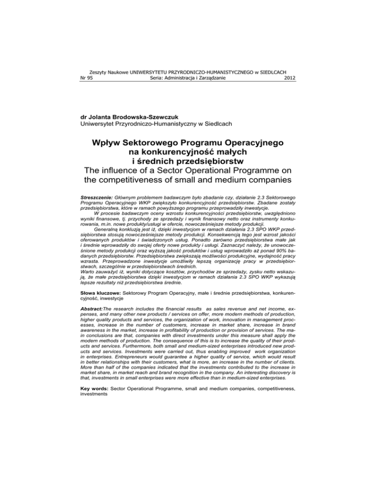 Zeszyty Naukowe UNIWERSYTETU PRZYRODNICZO-HUMANISTYCZNEGO w SIEDLCACH Nr 95 Seria: Administracja i Zarz dzanie 2012 dr Jolanta Brodowska-Szewczuk Uniwersytet Przyrodniczo-Humanistyczny w Siedlcach Wp yw Sektorowego Programu Operacyjnego na konkurencyjno!" ma ych i !rednich przedsi#biorstw The influence of a Sector Operational Programme on the competitiveness of small and medium companies Streszczenie: G ównym problemem badawczym by o zbadanie czy, dzia anie 2.3 Sektorowego Programu Operacyjnego WKP zwi!kszy o konkurencyjno"# przedsi!biorstw. Zbadane zosta y przedsi!biorstwa, które w ramach powy$szego programu przeprowadzi y inwestycje. W procesie badawczym oceny wzrostu konkurencyjno"ci przedsi!biorstw, uwzgl!dniono wyniki finansowe, tj. przychody ze sprzeda$y i wynik finansowy netto oraz instrumenty konkurowania, m.in. nowe produkty/us ugi w ofercie, nowocze"niejsze metody produkcji. Generaln% konkluzj% jest i$, dzi!ki inwestycjom w ramach dzia ania 2.3 SPO WKP przedsi!biorstwa stosuj% nowocze"niejsze metody produkcji. Konsekwencj% tego jest wzrost jako"ci oferowanych produktów i "wiadczonych us ug. Ponadto zarówno przedsi!biorstwa ma e jak i "rednie wprowadzi y do swojej oferty nowe produkty i us ugi. Zaznaczy# nale$y, $e unowocze"nione metody produkcji oraz wy$sz% jako"# produktów i us ug wprowadzi o a$ ponad 90% badanych przedsi!biorstw. Przedsi!biorstwa zwi!kszaj% mo$liwo"ci produkcyjne, wydajno"# pracy wzrasta. Przeprowadzone inwestycje umo$liwi y lepsz% organizacj! pracy w przedsi!biorstwach, szczególnie w przedsi!biorstwach "rednich. Warto zauwa$y# i$, wyniki dotycz%ce kosztów, przychodów ze sprzeda$y, zysku netto wskazuj%, $e ma e przedsi!biorstwa dzi!ki inwestycjom w ramach dzia ania 2.3 SPO WKP wykazuj% lepsze rezultaty ni$ przedsi!biorstwa "rednie. S owa kluczowe: Sektorowy Program Operacyjny, ma e i !rednie przedsi"biorstwa, konkurencyjno!#, inwestycje Abstract:The research includes the financial results as sales revenue and net income, expenses, and many other new products / services on offer, more modern methods of production, higher quality products and services, the organization of work, innovation in management processes, increase in the number of customers, increase in market share, increase in brand awareness in the market, increase in profitability of production or provision of services. The main conclusions are that, companies with direct investments under this measure shall apply the modern methods of production. The consequence of this is to increase the quality of their products and services. Furthermore, both small and medium-sized enterprises introduced new products and services. Investments were carried out, thus enabling improved work organization in enterprises. Entrepreneurs would guarantee a higher quality of service, which would result in better relationships with their customers, what is more, an increase in the number of clients. More than half of the companies indicated that the investments contributed to the increase in market share, in market reach and brand recognition in the company. An interesting discovery is that, investments in small enterprises were more effective than in medium-sized enterprises. Key words: Sector Operational Programme, small and medium companies, competitiveness, investments 156 J. Brodowska-Szewczuk Wst#p Sektor ma ych i !rednich przedsi"biorstw napotyka w swojej dzia alno!ci na wiele barier i przeszkód. Jedn$ z nich jest problem braku !rodków do podj"cia inwestycji, które s$ niezb"dne do rozwoju firmy i konkurowania na rynku. Ze wzgl"du na wielko!#, specyfik" tych przedsi"biorstw barier$ jest dla nich dost"p do zewn"trznych %róde finansowania inwestycji. Jednym ze %róde finansowania inwestycji w ma ych i !rednich przedsi"biorstwach by o dzia anie 2.3 SPO WKP 2004-2006 „Wzrost konkurencyjno!ci ma ych i !rednich przedsi"biorstw poprzez inwestycje”. Dzia anie to cieszy o si" najwi"ksz$ popularno!ci$ w!ród innych dzia a& Sektorowego Programu Operacyjnego WKP, na to w a!nie dzia anie by o najwi"cej sk adanych wniosków przez przedsi"biorców. G ównym problemem badawczym by o zbadanie czy, dzia anie 2.3 Sektorowego Programu Operacyjnego WKP 2004-2006 wp yn" o na rozwój ma ych i !rednich i w konsekwencji zwi"kszy o konkurencyjno!# tych przedsi"biorstw. Metodologia badania W procesie badawczym oceny wzrostu konkurencyjno!ci przedsi"biorstw, uwzgl"dni am wyniki finansowe tj. przychody ze sprzeda'y i wynik finansowy netto oraz instrumenty konkurowania m.in. nowe produkty/us ugi w ofercie, nowocze!niejsze metody produkcji, wy'sza jako!# oferowanych produktów czy us ug itp. W ocenie wzrostu konkurencyjno!ci badanych przedsi"biorstw, uwzgl"dni am nast"puj$ce czynniki: unowocze!niona oferta produktowa, wprowadzenie nowych produktów czy us ug, nowocze!niejsze metody produkcji i/lub !wiadczenia us ug, wzrost jako!ci oferowanych produktów i/lub us ug, wzrost jako!ci sprzeda'y, poprawa relacji z klientem, zwi"kszona wydajno!# pracy lub zwi"kszenie mo'liwo!ci produkcyjnych, lepsza organizacja pracy, innowacyjno!# w procesach zarz$dzania, wzrost liczby klientów, wzrost udzia u w rynku, wzrost znajomo!ci marki na rynku, zwi"kszenie zasi"gu rynku, obni'enie kosztów /redukcja kosztów, wzrost rentowno!ci produkcji i/lub !wiadczenia us ug, wzrost przychodów ze sprzeda'y, wzrost zysku netto. Seria: Administracja i Zarz dzanie (22)2012 ZN nr 95 Wp!yw Sektorowego Programu Operacyjnego na konkurencyjno"#… 157 W procesie badawczym zebra am równie' informacje dotycz$ce samych przedsi"biorstw – beneficjentów dzia ania 2.3 SPO WKP, s$ to: rodzaj prowadzenia dzia alno!ci forma prawna przedsi"biorstwa liczba zatrudnionych w przedsi"biorstwie wielko!# rocznych obrotów procentowa wielko!# eksportu rok za o'enia przedsi"biorstwa województwo, w którym zlokalizowana jest firma. Zosta y równie' okre!lone g ówne problemy, jakie wskazuj$ przedsi"biorstwa. W badaniu uzyskane zosta y informacje na temat przeprowadzonych inwestycj