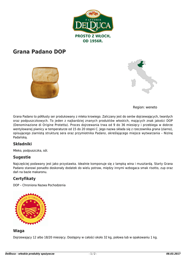 PROSTO Z WŁOCH, OD 1956R. Grana Padano DOP Region: weneto Grana Padano to półtłusty ser produkowany z mleka krowiego. Zaliczany jest do serów dojrzewających, twardych oraz podpuszczkowych. To jeden z najbardziej znanych produktów włoskich, mających znak jakości DOP (Denominazione di Origine Protetta). Proces dojrzewania trwa od 9 do 36 miesięcy i przebiega w dobrze wentylowanej piwnicy w temperaturze od 15 do 20 stopni C. Jego nazwa składa się z rzeczownika grana (ziarno), opisującego ziarnistą strukturę sera oraz przymiotnika Padano, określającego miejsce wytwarzania – Nizinę Padańską. Składniki Mleko, podpuszczka, sól. Sugestie Najczęściej podawany jest jako przystawka. Idealnie komponuje się z lampką wina i musztardą. Starty Grana Padano stanowi ponadto doskonały dodatek do wielu potraw, między innymi wzbogaca smak risotto, zup oraz dań na bazie makaronu. Certyfikaty DOP – Chroniona Nazwa Pochodzenia Waga Dojrzewający 12 albo 18/20 miesięcy. Dostępny w całości około 32 kg, połowa lub w opakowaniu 1 kg. DelDuca - włoskie produkty spożywcze -1/2- 08.03.2017 DelDuca - włoskie produkty spożywcze -2/2- 08.03.2017