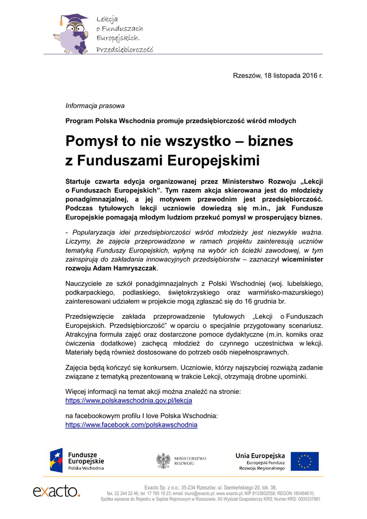 Rzeszów, 18 listopada 2016 r. Informacja prasowa Program Polska Wschodnia promuje przedsiębiorczość wśród młodych Pomysł to nie wszystko – biznes z Funduszami Europejskimi Startuje czwarta edycja organizowanej przez Ministerstwo Rozwoju „Lekcji o Funduszach Europejskich”. Tym razem akcja skierowana jest do młodzieży ponadgimnazjalnej, a jej motywem przewodnim jest przedsiębiorczość. Podczas tytułowych lekcji uczniowie dowiedzą się m.in., jak Fundusze Europejskie pomagają młodym ludziom przekuć pomysł w prosperujący biznes. - Popularyzacja idei przedsiębiorczości wśród młodzieży jest niezwykle ważna. Liczymy, że zajęcia przeprowadzone w ramach projektu zainteresują uczniów tematyką Funduszy Europejskich, wpłyną na wybór ich ścieżki zawodowej, w tym zainspirują do zakładania innowacyjnych przedsiębiorstw – zaznaczył wiceminister rozwoju Adam Hamryszczak. Nauczyciele ze szkół ponadgimnazjalnych z Polski Wschodniej (woj. lubelskiego, podkarpackiego, podlaskiego, świętokrzyskiego oraz warmińsko-mazurskiego) zainteresowani udziałem w projekcie mogą zgłaszać się do 16 grudnia br. Przedsięwzięcie zakłada przeprowadzenie tytułowych „Lekcji o Funduszach Europejskich. Przedsiębiorczość” w oparciu o specjalnie przygotowany scenariusz. Atrakcyjna formuła zajęć oraz dostarczone pomoce dydaktyczne (m.in. komiks oraz ćwiczenia dodatkowe) zachęcą młodzież do czynnego uczestnictwa w lekcji. Materiały będą również dostosowane do potrzeb osób niepełnosprawnych. Zajęcia będą kończyć się konkursem. Uczniowie, którzy najszybciej rozwiążą zadanie związane z tematyką prezentowaną w trakcie Lekcji, otrzymają drobne upominki. Więcej informacji na temat akcji można znaleźć na stronie: https://www.polskawschodnia.gov.pl/lekcja na facebookowym profilu I love Polska Wschodnia: https://www.facebook.com/polskawschodnia Exacto Sp. z o.o.; 35-234 Rzeszów; ul. Siemieńskiego 20, lok. 38, fax. 22 244 22 46, tel. 17 785 19 23; email: [email protected]; www.exacto.pl; NIP 8133602558; REGON 180484610; Spółka wpisana do Rejestru w Sądzie Rejonowym w Rzeszowie; XII Wydział Gospodarczy KRS; Numer KRS: 0000337961 oraz na stronie Biura Prasowego: http://lekcjeofe.newslink.pl/ Projekt realizowany jest z funduszy Programu Polska Wschodnia 2014-2020. ** Biuro akcji edukacyjnej: Natalia Sieradzka, Exacto sp. z o.o. e-mail. [email protected] tel. 17 785 19 23 ** Program Polska Wschodnia 2014-2020 (PO PW) to instrument wsparcia rozwoju społecznogospodarczego 5 województw: lubelskiego, podlaskiego, podkarpackiego, świętokrzyskiego i warmińsko-mazurskiego. Jego środki – 2 mld euro z Europejskiego Funduszu Rozwoju Regionalnego – przeznaczone są na rozwój innowacyjnej przedsiębiorczości oraz na ważne, z punktu widzenia spójności i dostępności terytorialnej makroregionu, inwestycje w komunikację miejską, drogi i kolej. Exacto Sp. z o.o.; 35-234 Rzeszów; ul. Siemieńskiego 20, lok. 38, fax. 22 244 22 46, tel. 17 785 19 23; email: [email protected]; www.exacto.pl; NIP 8133602558; REGON 180484610; Spółka wpisana do Rejestru w Sądzie Rejonowym w Rzeszowie; XII Wydział Gospodarczy KRS; Numer KRS: 0000337961