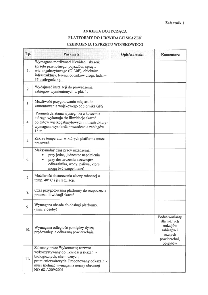 Zalącznik 1 ANKIETA DOTYCZĄCA PLATFORMY DO LIKWIDACJI SKAŻEŃ UZBROJENIA I SPRZĘTU WOJSKOWEGO Opis/wartosci -P Wymagane możliwości likwidacji skażeń: sprzętu przenośnego, pojazdów, sprzętu wielkogabarytowego (CI3OE), obiektów infastruktury, terenu, odcinków drogi, ludzi 35 osób/godzinę. 1. Komentarz — Wydajność instalacji do prowadzenia zabiegów wymienionych w pkt. 1. 2 Możliwość przygotowania miejsca do zamontowania wojskowego odbiornika GPS. Promień działania wysięgnika z koszem z którego wykonuje się likwidację skażeń obiektów wielkogabarytowych i infastruktury wymagana wysokość prowadzenia zabiegów 15m. 4. Zakres temperatur w których platforma może pracować Maksymalny czas pracy urządzenia: . przy jednej jednostce napełnienia • przy dostarczeniu z zewnątrz odkażalnika, wody, paliwa, które mogą być_uzupełniane) 6. Możliwość dostarczenia cieczy roboczej o temp. 40° C ijej regulacji. Czas przygotowania platformy do rozpoczęcia procesu likwidacji skażeń. 8 Wymagana obsada do obsługi platformy. (min. 2 osoby) Podać warianty dla różnych rodzajów zabiegów i różnych powierzchni, obiektów . Wymagana odległość pomiędzy dyszą prądownicy a odkazaną powierzchnią. Zalecany przez Wykonawcę roztwór wykorzystywany do likwidacji skażeń: biologicznych, chemicznych, promieniotwórczych. Proponowany odkażalnik musi spełniać wymagania normy obronnej NO-68-A209:200 1 - I1 . iL; Pirametr.- Lp. 12. 13. 14. Możliwość zastosowania w instalacji następujących odkażalników: • Uniwersalnego Odkażalnika Proszkowego (UOP) wprowadzonego na wyposażenia Sił Zbrojnych RP Polecenie Nr 47 z 20 stycznia 2010 Szefa Inspektoratu Wsparcia Sił Zbrojnych, . pakietu_z_proszkiem_SF-M6/2 Czy sterowanie położeniem kosza może być wykonywane: a) zkosza b) zdalnie przez operatora przy użyciu przenośnego pulpitu sterującego c) z wykorzystaniem pulpitu sterującego znajduj ąceao się na i,ojeździe Możliwość zamontowania urządzenia na podwoziu 3 osiowym Jelcz S662D.43 lub podwoziu 4 osiowym Jelcz P862D.43 w przypadku przekroczenia ładowności podwozia 3 osiowego. 15 Pojemność zbiornika z wodą lub cieczą roboczą 16 Masa instalacji (bez samochodu i wysięgnika), Masa całkowita platformy wraz częścią samochodową i uzupełnieniowymi czynnikami roboczymi 17. Gabaryty instalacji 18. Wymagane wyposażenie dodatkowe: a) radiotelefon przewoźny (Motorola GM-360) b) radiotelefon Motorola GP-340 (dla wszystkich członków obsługi) c) Laryngofon do Motoroli GP-340 lub inne równoważne rozwiązanie zapewniające rozmowę bez angażowania rąk (dla wszystkich członków obsługi) d) radiostacja pokładowe yHF Radwar PRC 9310 AP e) siatka maskująca wprowadzona na wyposażenie Sił Zbrojnych RP 19 Możliwość transportu lotniczego samolotem C13OE 20. Możliwość transportu przy pojeździe wyposażenia indywidualnego żołnierza (broń, oporządzenie, środki ochrony przed skażeniem, woda pitna, racje żywnościowe na 1 dobę) Opis/wartosci Komentarz