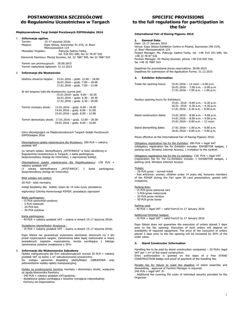 POSTANOWIENIA SZCZEGÓŁOWE do Regulaminu Uczestnictwa w Targach Międzynarodowe Targi Gołębi Pocztowych EXPOGołębie 2016 1. Informacje ogólne: Termin: 15-17 stycznia 2016r. Miejsce: Expo Silesia, Sosnowiec 41-219, ul. Braci Mieroszewskich 124 Menedżer Projektu: Patrycja Zadros-Tarka, tel. 510 031 690, fax 32 78 87 526 Kierownik Pawilonu: Maciej Szumiec, tel. 32 7887 505, fax 32 7887 524 Termin cen promocyjnych: 30.09.2015 Termin nadsyłania zgłoszeń: 31.12.2015 2. Informacje dla Wystawców Godziny otwarcia targów: 15.01.2016 – godz. 12.00 – 18.00 16.01.2016 – godz. 7.00 – 18.00 17.01.2016 – godz. 7.00 – 13.00 W dni targowe hala dla Wystawców czynna jest: 15.01.2016– godz. 8.00 – 18.30 16.01.2016 – godz. 6.30 – 18.30 17.01.2016 – godz. 6.30 – 20.00 Termin montażu stoisk: 13.01.2016 – godz. 8.00 – 16.00 14.01.2016 – godz. 8.00 – 21.00 15.01.2016 – godz. 8.00 – 12.00 SPECIFIC PROVISIONS to the full regulations for participation in the fair International Fair of Racing Pigeons 2016 1. General Data: Date: 15-17 January 2016 Venue: Expo Silesia Exhibition Centre in Poland, Sosnowiec (40-219), ul. Braci Mieroszewskich 124 Project Manager: Ms. Patrycja Zadros-Tarka, tel. +48 510 031 690, fax +48 32 78 87 526 Pavilion Manager: Mr Maciej Szumiec, phone +48 510 030 326, fax +48 32 7887 524 Deadlines for promotional prices reservations: 30.09.2015 Deadlines for submission of the Application Forms: 31.12.2015 2. Exhibitor Information Trade fair opening hours: Pavilion opening hours for Exhibitors: 15.01. 2016 - 8.00 a.m. – 6.30 p.m. 16.01. 2016 - 6.30 a.m. – 6.30 p.m. 17.01.2016 – 6.30 a.m. – 8.00 p.m. Stand construction dates: 13.01.2016 - 8.00 a.m. – 4.00 p.m. 14.01.2016 - 8.00 a.m. – 9.00 p.m. 15.01.2016 – 8.00 a.m. – 12 noon Stand dismantling dates: 17.01.2016 – 1.00 p.m. – 8.00 p.m. 18.01.2016 – 8.00 a.m. – 4.00 p.m. Termin demontażu stoisk: 17.01.2016 – godz. 13.00 – 20.00 18.01.2016 – godz. 8.00 – 16.00 Ceny obowiązujące na Międzynarodowych Targach Gołębi Pocztowych EXPOGołębie 2016 Obowiązkowa opłata rejestracyjna dla Wystawcy: 200 PLN + należny podatek VAT (w ramach opłaty: identyfikatory „WYSTAWCA” w ilości określonej w Regulaminie Uczestnictwa w Targach, 1 karta parkingowa, bezprzewodowy dostęp do Internetu), 1 zaproszenie koktajl. Obowiązkowa opłata rejestracyjna dla Współwystawcy: 130 PLN + należny podatek VAT (1 sztukę identyfikatora „WYSTAWCA”, 1 karta parkingowa, bezprzewodowy dostęp do Internetu). Bilet wstępu (od osoby): 20 PLN - bilet normalny wstęp bezpłatny dla: kobiet, dzieci do 14 roku życia, posiadaczy legitymacji Członka Honorowego PZHGP, posiadaczy zaproszeń Bilety parkingowe: - 15 PLN samochód osobowy - 5 PLN motocykl - 20 PLN bus - 50 PLN autobus Prices effective at the International Fair of Racing Pigeons 2016: Obligatory registration fee for the Exhibitor: 200 PLN + legal VAT (obligatory registration fee for Exhibitor includes: EXHIBITOR badges, 1 parking card, Wireless Internet Access), 1 invitation to the cocktail. Obligatory registration fee for the Co-exhibitor: 130 PLN + legal VAT (registration fee for the Co-Exhibitor include: 1 EXHIBITOR badges, 1 parking card, Wireless Internet Access) Tickets: - 20 PLN gross – normal ticket - free entrance: women, children under 14 years old, honorary members of the PZHGP during the Fair upon ID card presentation, guests with invitations. Parking fees: - 15 PLN gross personal cars - 5 PLN gross motorcycle - 20 PLN gross minibus - 50 PLN gross buses Parking card: - 40 PLN + legal VAT – valid from15 to 17 January 2016 Karta parkingowa: - 40 PLN + należny podatek VAT – ważna w dniach 15-17 stycznia 2016r. Additional Exhibitor badges: - 15 PLN + legal VAT – valid from15 to 17 January 2016 Dodatkowy identyfikator Wystawca : - 15 PLN + należny podatek VAT – ważny w dniach 15-17 stycznia 2016r. Expo Silesia does not guarantee the execution of orders placed 3 days prior to the fair opening. Execution of such orders will depend on availability of required equipment. The price of the execution of orders placed 3 days prior to the fair opening will be increased by 30% of the order value. Expo Silesia nie gwarantuje wykonania zamówień złożonych na 3 dni przed rozpoczęciem targów. Zamówienia takie będą realizowane w miarę posiadanych zapasów wyposażenia, kwota wynikająca z takiego zamówienia zostanie zwiększona o 30%. 3. 15.01.2016 – 12 noon – 6.00 p.m. 16.01.2016 - 7.00 a.m. – 6.00 p.m. 17.01.2016 – 7.00 a.m. – 1.00 p.m. Informacje dla Wykonawców Zabudowy Opłata manipulacyjna dla firm zabudowujących wynosi 20 PLN + należny podatek VAT za każdy 1 m2 zabudowywanej powierzchni. Do wstępu uprawnia bezpłatny identyfikator ZABUDOWA oraz potwierdzenie wpłaty opłaty manipulacyjnej. Opłaty za przekroczenie terminu montażu i demontażu stoisk; wyłącznie za zgodą Kierownika Pawilonu - 240 PLN + należny podatek VAT/godzinę; - dodatkowa opłata wynikająca z kosztów wynajęcia indywidualnej Ochrony od Organizatora. 3. Stand Constructor Information Handling fee to be paid by stand construction companies – 20 PLN+ legal VAT per 1 m² of the stand construction. Entry authorization is granted on the basis of a free STAND CONSTRUCTION badge and proof of payment of the handling fee. Penalty fee for failure to meet the deadline of stand assembly and dismantling - approval of Pavilion Manager is required: 240 PLN + legal VAT /h - Additional fee covering the costs of individual security provided by the Organizer 1