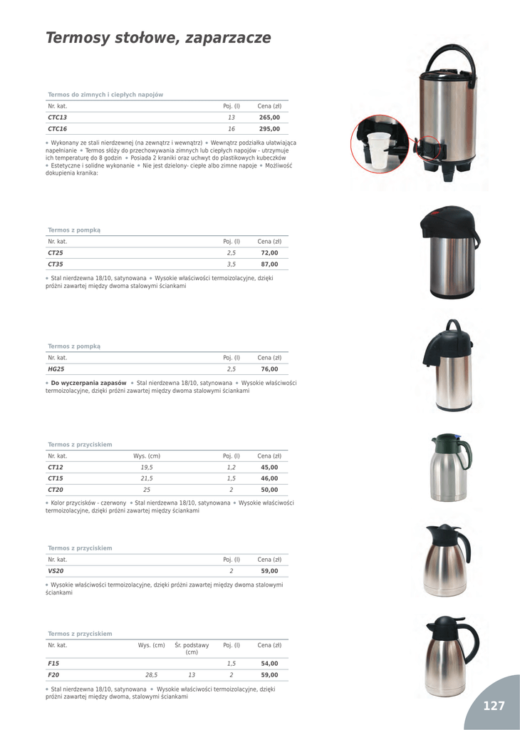 Termosy stołowe, zaparzacze Termos do zimnych i ciepłych napojów Nr. kat. Poj. (l) Cena (zł) CTC13 13 265,00 CTC16 16 295,00 Wykonany ze stali nierdzewnej (na zewnątrz i wewnątrz) Wewnątrz podziałka ułatwiająca napełnianie Termos słóży do przechowywania zimnych lub ciepłych napojów - utrzymuje ich temperaturę do 8 godzin Posiada 2 kraniki oraz uchwyt do plastikowych kubeczków Estetyczne i solidne wykonanie Nie jest dzielony- ciepłe albo zimne napoje Możliwość dokupienia kranika: Termos z pompką Nr. kat. Poj. (l) Cena (zł) CT25 2,5 72,00 CT35 3,5 87,00 Stal nierdzewna 18/10, satynowana Wysokie właściwości termoizolacyjne, dzięki próżni zawartej między dwoma stalowymi ściankami Termos z pompką Nr. kat. Poj. (l) Cena (zł) HG25 2,5 76,00 Stal nierdzewna 18/10, satynowana Wysokie właściwości Do wyczerpania zapasów termoizolacyjne, dzięki próżni zawartej między dwoma stalowymi ściankami Termos z przyciskiem Nr. kat. Wys. (cm) Poj. (l) Cena (zł) CT12 19,5 1,2 45,00 CT15 21,5 1,5 46,00 CT20 25 2 50,00 Kolor przycisków - czerwony Stal nierdzewna 18/10, satynowana termoizolacyjne, dzięki próżni zawartej między ściankami Wysokie właściwości Termos z przyciskiem Nr. kat. VS20 Poj. (l) Cena (zł) 2 59,00 Wysokie właściwości termoizolacyjne, dzięki próżni zawartej między dwoma stalowymi ściankami Termos z przyciskiem Nr. kat. Wys. (cm) Śr. podstawy (cm) F15 F20 28,5 13 Poj. (l) Cena (zł) 1,5 54,00 2 59,00 Wysokie właściwości termoizolacyjne, dzięki Stal nierdzewna 18/10, satynowana próżni zawartej między dwoma, stalowymi ściankami 127 Zaparzacz Nr. kat. Śr. (cm) Wys. (cm) Moc (cm) Poj. (cm) Cena (zł) A-104/065 23 45 230V/1500W 6,5 1550,00 A-104/012 27,5 54 230V/1500W 12 1800,00 A-104/015 27,5 60 230V/1500W 15 2000,00 Wykonany w całości ze stali nierdzewnej Półautomatyczny, bardzo wysokiej jakości zaparzacz do kawy Nie wymaga podłączenia wody 2 lata gwarancji na części zamienne Podgrzewacz do piwa, wina Nr. kat. Śr. (cm) Wys. (cm) Moc Poj. (l) Cena (zł) X-A150 36 50 1800W/230V 27 579,00 Pokryty emalią na zew. i wew. Powierzchnia emaliowana odporna na działanie kwasów, Podstawa, uchwyty jest idealna do podgrzewania napojów alkoholowych, które nie tracą wtedy swoich walorów smakowych Można również używać do ponczu, kawy, herbaty, do zagotowywania owoców warzyw i mięsa oraz gotowania i podtrzymywania w wysokiej temperaturze zup (przy zastosowaniu specjalnego wkładu) Grzałka z termostatem 0-100°C i zawór spustowy wykonane z tworzywa wysokiej jakości Serwetki dwuwarstwowe Kolor 38 x 38 cm biały GS-11712 Cena netto (zł) 128 39,00 Op. 5 x 50 5 x 50