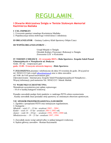 REGULAMIN I Otwarte Mistrzostwa Śmigla w Tenisie Stołowym Memoriał Kazimierza Maślaka I CEL IMPREZY 1. Uczczenie pamięci zmarłego Kazimierza Maślaka 2. Popularyzacja tenisa stołowego wśród dzieci i młodzieży II ORGANIZATOR – Gminny Ludowy Klub Sportowy Orlęta Czacz III WSPÓŁORGANIZATORZY – Urząd Miejski w Śmiglu Ośrodek Kultury Fizycznej i Rekreacji w Śmiglu Zrzeszenia LZS w Kościanie IV TERMIN I MIEJSCE –12–wrzesnia 2015 r. Hala Sportowa Zespołu Szkól Ponad Gimnazjalnych w Nietążkowie ul. Dudycza Godz. 10- tej – rozpoczęcie gier godz. 12.00 - Uroczyste otwarcie imprezy –Hala Sportowa V ZGŁOSZENIA pisemne i telefoniczne do dnia 10 września do godz. 20-ej pod nr tel. 505421215 lub e-mail [email protected] oraz w dniu zawodów od 9.00 do 9.45 przed losowaniem gier. Zakwaterowanie : Internat przy Zespole Szkół Ponadgimnazjalnych Nietążkowo . Więcej informacji, pod numerem Tel. 505421215 Marek Maślak VI WARUNKI UCZESTNICTWA Warunkiem uczestnictwa jest opłata wpisowego: - 10 zł w każdej kategorii wiekowej Ponadto zawodnik podaje ilość punktów w rankingu PZTS celem rozstawienia . Każdy zawodnik musi posiadać strój sportowy ze zmiennym obuwiem sportowym. VII SPOSÓB PRZEPROWADZENIA ZAWODÓW 1. Zgodnie z przepisami PZTS oraz niniejszym regulaminem. 2. Kategorie : Młodzik – wiek 12 – 13 lat - urodzeni 2003 – 2004 , Kadet – wiek 14 – 15 lat - urodzeni 2001 i 2002 rok, Junior – wiek 16 – 18 lat - - urodzeni 1998, 1999 i 2000 rok, Młodzieżowiec – 19 – 21 lat - urodzeni 1997, 1996 3. Zawodnik może wziąć udział tylko w jednej kategorii wiekowej . 4. Sędzia główny zawodów –Roman Kaczmarek VIII NAGRODY I WYRÓŻNIENIA 1. W kategoriach wiekowych za zajęcie I do III miejsca puchary oraz nagrody rzeczowe. 2. Nagrody specjalne: dla najmłodszych zawodników (dziewczynka i chłopiec) . 3. Nagroda wyróżnienia dla zawodniczki i zawodnika z regionu Śmigla. 4. Nagrody do losowania wśród wszystkich uczestników na zakończeniu rozgrywek w każdym dniu imprezy. IX POZOSTAŁE POSTANOWIENIA REGULAMINOWE 1. Organizator zabezpiecza szatnie tylko na potrzeby przebrania. 2.Organizator nie odpowiada za rzeczy pozostawione w szatni i na terenie obiektu. 3. Organizator nie odpowiada za wszelkiego rodzaju urazy powstałe podczas imprezy. 4. Przyjazd na własny koszt. Organizator GLKS ,,Orlęta’’ Czacz Marek Maślak
