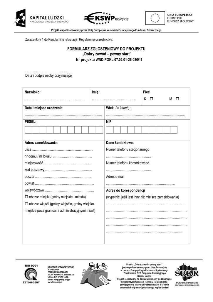 Projekt współfinansowany przez Unię Europejską w ramach Europejskiego Funduszu Społecznego Załącznik nr 1 do Regulaminu rekrutacji i Regulaminu uczestnictwa. FORMULARZ ZGŁOSZENIOWY DO PROJEKTU „Dobry zawód – pewny start” Nr projektu WND-POKL.07.02.01-26-030/11 …………………………………….. Data i podpis osoby przyjmującej Nazwisko: Imię: Płeć ………..……………………………………… ………………………………….. K M Data i miejsce urodzenia: Wiek (w latach): ……………………………………………………………… …………………..…………………………………………… PESEL: NIP Adres zameldowania: Dane kontaktowe: ulica .................................................................... Numer telefonu stacjonarnego nr domu / nr lokalu ……………………………… …………………………………… miejscowość……………………………………… Numer telefonu komórkowego kod pocztowy …………………………………….. …………………………………… poczta ………………………………………….…. Adres e-mail powiat ………………………………………….….... ………………………………………………………. województwo ………………………………………. Adres do korespondencji obszar miejski (gminy miejskie i miasta) (wypełnić, jeśli jest inny niż miejsce zameldowania) obszar wiejski (gminy wiejskie, gminy wiejsko- ……………………………………………………………….. miejskie poza granicami administracyjnymi miast) ………………………………………………………………… ………………………………………………………………… ………………………………………………………………… ……………………………………………………………… KONECKIE STOWARZYSZENIE WSPIERANIA PRZEDSIĘBIORCZOŚCI 26-200 Końskie, ul. Staszica 2A, tel./fax. 041 375 14 55/56, e-mail: [email protected], www.kswp.org.pl Projekt „Dobry zawód – pewny start” jest współfinansowany przez Unię Europejską w ramach Europejskiego Funduszu Społecznego Poddziałanie 7.2.1 Programu Operacyjnego Kapitał Ludzki Projekt realizowany na podstawie umowy podpisanej ze Świętokrzyskim Biurem Rozwoju Regionalnego pełniącym rolę Instytucji Pośredniczącej 1 stopnia w ramach Programu Operacyjnego Kapitał Ludzki Projekt współfinansowany przez Unię Europejską w ramach Europejskiego Funduszu Społecznego Posiadam wykształcenie: Jestem zainteresowana/y udziałem w szkoleniu: wyższe Pracownik administracyjno-biurowy z obsługą pomaturalne komputera i elementami Savoir-vivre ponadgimnazjalne Sprzedawca z obsługą kasy fiskalnej BHP i gimnazjalne minimum sanitarnym podstawowe Pracownik magazynu z obsługą programu sprzedażowo- magazynowego Przedstawiciel handlowy z elementami telepracy i prawem jazdy kat „B” Pracownik małej gastronomi z elementami organizacji przyjęć okolicznościowych i carvingiem Preferowane miejsce odbywania zajęć: Skarżysko-Kamienna Końskie inne ( jakie)…………………………………. Czy zamierza się Pan/i starać o zwrot kosztów dojazdu? Tak Nie Czy sprawuje Pan/ Pani opiekę nad dzieckiem do lat 7 lub osobą zależną Tak Nie Doświadczenie zawodowe: Ostatnie miejsce pracy (Nazwa firmy, miejscowość)…………………………………………………………………….. …………………………………………………………………………………………………………………………………….. Ostatnio zajmowane stanowisko………………………………………..…………………………………………………….. Okres zatrudnienia w ostatnim miejscu pracy……………………………………………………………………………….. Forma zatrudnienia w ostatnim miejscu pracy………………………………………………………………………………. Staż pracy (w latach)…………………………………………………………………………………………………………... Zawód ……………………..…………………………………………………………………………………………………….. KONECKIE STOWARZYSZENIE WSPIERANIA PRZEDSIĘBIORCZOŚCI 26-200 Końskie, ul. Staszica 2A, tel./fax. 041 375 14 55/56, e-mail: [email protected], www.kswp.org.pl Projekt „Dobry zawód – pewny start” jest współfinansowany przez Unię Europejską w ramach Europejskiego Funduszu Społecznego Poddziałanie 7.2.1 Programu Operacyjnego Kapitał Ludzki Projekt realizowany na podstawie umowy podpisanej ze Świętokrzyskim Biurem Rozwoju Regionalnego pełniącym rolę Instytucji Pośredniczącej 1 stopnia w ramach Programu Operacyjnego Kapitał Ludzki Projekt współfinansowany przez Unię Europejską w ramach Europejskiego Funduszu Społecznego Oświadczam, że (proszę zaznaczyć wszystkie kategorie, które Pani / Pana dotyczą): Jestem osobą pozostającą bez zatrudnienia, zarejestrowaną w Urzędzie Pracy. Jestem osobą nieaktywną zawodowo¹. Jestem osobą długotrwale bezrobotną (pozostaję bez zatrudnienia przez okres co najmniej 12 kolejnych miesięcy w ciągu ostatnich 24 miesięcy poprzedzających dzień przystąpienia do projektu). Jestem osobą do 24 roku życia. Jestem osobą uczącą lub kształcącą się w systemie w dziennym. Jestem osobą niepełnosprawną . Źródło informacji o projekcie: plakaty ulotki prasa inne (jakie?) ………………………………………………………………………… znajomi Internet ¹osoby niepracujące, niezarejestrowane jako bezrobotne, korzystające z zasiłków lub świadczeń przedemerytalnych, emeryci, renciści Prosimy o zapoznanie się z poniższą tabelą, przedstawiającą kolejno