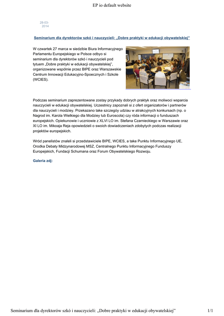 EP io default website 28-032014 Seminarium dla dyrektorów szkó i nauczycieli: „Dobre praktyki w edukacji obywatelskiej” W czwartek 27 marca w siedzibie Biura Informacyjnego Parlamentu Europejskiego w Polsce odbyo si seminarium dla dyrektorów szkó i nauczycieli pod tytuem „Dobre praktyki w edukacji obywatelskiej”, organizowane wspólnie przez BIPE oraz Warszawskie Centrum Innowacji Edukacyjno-Spoecznych i Szkole (WCIES). Podczas seminarium zaprezentowane zostay przykady dobrych praktyk oraz moliwoci wsparcia nauczycieli w edukacji obywatelskiej. Uczestnicy zapoznali si z ofert organizatorów i partnerów dla nauczycieli i modziey. Przekazano take szczegóy udziau w atrakcyjnych konkursach (np. o Nagrod im. Karola Wielkiego dla Modziey lub Euroscola) czy róda informacji o funduszach europejskich. Opiekunowie i uczniowie z XLVI LO im. Stefana Czarnieckiego w Warszawie oraz XI LO im. Mikoaja Reja opowiedzieli o swoich dowiadczeniach zdobytych podczas realizacji projektów europejskich. Wród panelistów znaleli si przedstawiciele BIPE, WCIES, a take Punktu Informacyjnego UE, Orodka Debaty Midzynarodowej MSZ, Centralnego Punktu Informacyjnego Funduszy Europejskich, Fundacji Schumana oraz Forum Obywatelskiego Rozwoju. Galeria zdj: Seminarium dla dyrektorów szkó i nauczycieli: „Dobre praktyki w edukacji obywatelskiej” 1/1