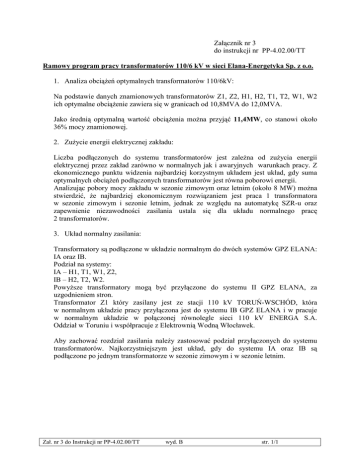 Załącznik nr 3 do instrukcji nr PP-4.02.00/TT Ramowy program pracy transformatorów 110/6 kV w sieci Elana-Energetyka Sp. z o.o. 1. Analiza obciąŜeń optymalnych transformatorów 110/6kV: Na podstawie danych znamionowych transformatorów Z1, Z2, H1, H2, T1, T2, W1, W2 ich optymalne obciąŜenie zawiera się w granicach od 10,8MVA do 12,0MVA. Jako średnią optymalną wartość obciąŜenia moŜna przyjąć 11,4MW, co stanowi około 36% mocy znamionowej. 2. ZuŜycie energii elektrycznej zakładu: Liczba podłączonych do systemu transformatorów jest zaleŜna od zuŜycia energii elektrycznej przez zakład zarówno w normalnych jak i awaryjnych warunkach pracy. Z ekonomicznego punktu widzenia najbardziej korzystnym układem jest układ, gdy suma optymalnych obciąŜeń podłączonych transformatorów jest równa poborowi energii. Analizując pobory mocy zakładu w sezonie zimowym oraz letnim (około 8 MW) moŜna stwierdzić, Ŝe najbardziej ekonomicznym rozwiązaniem jest praca 1 transformatora w sezonie zimowym i sezonie letnim, jednak ze względu na automatykę SZR-u oraz zapewnienie niezawodności zasilania ustala się dla układu normalnego pracę 2 transformatorów. 3. Układ normalny zasilania: Transformatory są podłączone w układzie normalnym do dwóch systemów GPZ ELANA: IA oraz IB. Podział na systemy: IA – H1, T1, W1, Z2, IB – H2, T2, W2. PowyŜsze transformatory mogą być przyłączone do systemu II GPZ ELANA, za uzgodnieniem stron. Transformator Z1 który zasilany jest ze stacji 110 kV TORUŃ-WSCHÓD, która w normalnym układzie pracy przyłączona jest do systemu IB GPZ ELANA i w pracuje w normalnym układzie w połączonej równolegle sieci 110 kV ENERGA S.A. Oddział w Toruniu i współpracuje z Elektrownią Wodną Włocławek. Aby zachować rozdział zasilania naleŜy zastosować podział przyłączonych do systemu transformatorów. Najkorzystniejszym jest układ, gdy do systemu IA oraz IB są podłączone po jednym transformatorze w sezonie zimowym i w sezonie letnim. Zał. nr 3 do Instrukcji nr PP-4.02.00/TT wyd. B str. 1/1