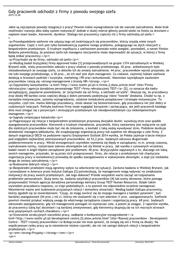 Gdy pracownik odchodzi z firmy z powodu swojego szefa 2015-12-28 Jakie są najczęstsze powody rezygnacji z pracy? Pewnie niskie wynagrodzenie lub złe warunki zatrudnienia. Może brak możliwości rozwoju albo słaby system motywacji? Jednak w dużej mierze główny powód siedzi na fotelu za drzwiami z napisem team leader, kierownik, dyrektor. Dlatego też pracownicy częściej niż z firmy odchodzą od szefa. <p>Prawdopodobnie szefowie nie usłyszą tego od zwalniających się pracowników, którzy znajdą wiele innych argumentów. Część z nich jest tylko konsekwencją zupełnie innego problemu, polegającego na złych relacjach z bezpośrednim przełożonym. O trudnym współżyciu z szefostwem powstało wiele anegdot, powiedzeń, a nawet filmów. Badania potwierdzają, że postawa szefa lub managera rzeczywiście może doprowadzić do sytuacji, w której z firmy będą znikać pracownicy.</p> <p>Przychodzi się do firmy, odchodzi od szefa</p> <p>Według badań brytyjskiej firmy Approved Index [1] przeprowadzonych na grupie 1374 zatrudnionych w Wielkiej Brytanii osób, wielu pracowników odeszło z pracy właśnie z powodu przełożonego. 42 proc. ankietowanych było niezadowolonych ze swojego szefa, co skłoniło ich do zmiany zatrudnienia. 44 proc. pracowników wprost przyznało, że nie lubi swojego przełożonego, a 30 proc., że ich szef jest złym managerem. Co ciekawe, najmniej lubiani szefowie działają w branżach podróże i turystyka, marketing i PR oraz rachunkowość. Natomiast największym zaufaniem pracowników cieszą się <strong>managerowie z branży HR</strong>.</p> <p>Zapytaliśmy konsultantów <a href="http://www.testhr.pl/pl/o-firmie,2,show,article.html" title="Firma rekrutacyjna i agencja doradztwa personalnego TEST">firmy rekrutacyjnej TEST</a> [2], co oznacza dla kadry zarządzającej, popularne powiedzenie, że "przychodzi się od firmy, a odchodzi od szefa". Okazuje się, że pracodawcy oraz działy HR bardzo coraz częściej dbają o dobro personelu podejmując różne "twarde" działania. Chodzi tu np. o narzędzia motywacyjne, systemy wynagradzania, ustalone świadczenia pozapłacowe i strategie motywacyjne. To wszystko, czyli tzw. marka dobrego pracodawcy, może okazać się bezwartościowe, gdy pracodawca nie jest dobry w codziennych relacjach. Polityka kadrowa firmy może wyglądać korzystnie i zachęcająco, ale jeśli pracownik każdego dnia musi zmagać się z porywczym i stresującym przełożonym lub nieodpowiedzialnym czy niekompetentnym managerem.</p> <p>Sygnały zwiastujące katastrofę</p> <p>Pogarszające się relacje z bezpośrednim przełożonym przynoszą dwojakie skutki: wywołują stres oraz spadek zaangażowania pracowników. Kierownik o trudnym charakterze, pracoholik, który nastawiony jest wyłącznie na zysk dla niektórych pracowników może być nie do zniesienia, a kontakt z taką osobą wywoływać stres. Podobnie skutkuje działalność managera-lekkoducha, źle zrządzającego organizacją pracy lub zupełnie nie dbającego o cele firmy. Z danych organizacji OECD na podstawie raportu Employment Outlook 2014 wynika, że Polska zajmuje trzecie miejsce pod względem najbardziej zestresowanych pracowników. Aż 53,2 proc. badanych odczuwa długotrwałe poddenerwowanie w pracy. Wśród stresogennych czynników wymienia się błędy w zarządzaniu: m.in. presję czasową, wyśrubowane normy, rozszerzane zakresu obowiązków lub zły klimat w pracy. Jak wynika z cytowanych wcześniej badań nawet w Anglii błędne zarządzanie jest problemem: 40 proc. Brytyjczyków zapytanych o to, dlaczego nie lubią swoich managerów, przyznało, że są przez nich przepracowani. Stres, złe relacje z przełożonym lub chaotyczna organizacja pracy w konsekwencji prowadzą do spadku zaangażowania w wykonywane obowiązki, a stąd już niedaleka droga do zmiany zatrudnienia.</p> <p>Budowanie dobrych relacji </p> <p>Bezpośredni przełożeni mają ogromny wpływ na odwrócenie tej sytuacji. Zarówno badania w Wielkiej Brytanii, jak i prowadzone w Ameryce przez Instytut Gallupa [3] potwierdzają, że managerowie mogą wpływać na zwiększanie motywacji do pracy swoich przełożonych. Jak tego dokonać? Przede wszystkim warto zacząć od rozpoznania problemów personalnych. Służą temu np. badania satysfakcji pracowników [4] lub oceny okresowe, które pomaga przeprowadzić firmom agencja doradztwa personalnego Advisory Group TEST Human Resources. Dzięki takim wywiadom pracodawca rozpozna, co trapi podwładnych, a to pozwoli mu odpowiednio wcześnie zareagować. Niezmiernie ważne jest budowanie przyjaznych relacji i atmosfery otwartości. Według badań Gallupa pracownicy, którzy zgodzili się ze stwierdzeniem: "Czuję, że mogę zwrócić się do mojego managera z każdym pytaniem", byli bardziej zaangażowani (54 proc.) niż ci, którzy nie utożsamili się z tym zdaniem (1 proc. zaangażowanych). Szefowie powinni również przykuć większą uwagę do właściwego zarządzania czasem i organizacją pracy. 69 proc. badanych odczuwało zaangażowanie, gdy ich managerowie pomagali im wyznaczać cele, a potem je osiągać. Z raportów wynika, że pracownicy lubią być doceniani i są bardziej zmotywowani, gdy kierownicy skupiają się na ich mocnych stronach oraz pozytywnych cechach charakteru.</p> <p>Stworzenie atrakcyjnych warunków pracy, zadbanie o konkurencyjne wynagrodzenie i <a href="http://www.testhr.pl/pl/development-centre,22,show,article.html" title="Rozwój pracowników - Development Centre - TEST">rozwój pracowników</a> wcale nie musi sprawić, że zwiążą się oni z firmą na dłużej. Na współczesnym rynku pracy są to niezmiernie istotne czynniki, ale nic nie zastąpi dobrych relacji z bezpośrednim przełożonym.</p> <p><em><strong>Przypisy:</strong></em></p> <ul> Dobrze wiedzieć Opracodawcach.pl - Portal dla pracownika Utworzony: 08-03-2017 <li><em>[1] http://www.cipd.co.uk/pm/peoplemanagement/b/weblog/archive/2015/0