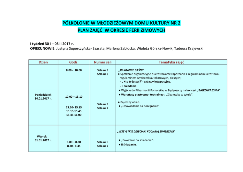PÓŁKOLONIE W MŁODZIEŻOWYM DOMU KULTURY NR 2 PLAN ZAJĘĆ W OKRESIE FERII ZIMOWYCH I tydzień 30 I – 03 II 2017 r. OPIEKUNOWIE: Justyna Superczyńska- Szarata, Marlena Zabłocka, Wioleta Górska-Nowik, Tadeusz Krajewski Dzień Poniedziałek 30.01.2017 r. Godz. Numer sali 8.00 - 10.00 Sala nr 9 Sala nr 2 10.00 – 13.10 13.10- 15.15 15.15-15.45 15.45-16.00 Sala nr 9 Sala nr 2 Tematyka zajęć „W KRAINIE BAŚNI” ● Spotkanie organizacyjne z uczestnikami: zapoznanie z regulaminem uczestnika, regulaminem wycieczek autokarowych, pieszych; - „ Kto ty jesteś?”- zabawy integracyjne, - II śniadanie. ● Wyjście do Filharmonii Pomorskiej w Bydgoszczy na koncert „BAJKOWA ZIMA”. ● Warsztaty plastyczno- teatralnept. „Z bajeczką w tytule”. ● Bajeczny obiad. ● „Opowiadanie na pożegnanie”. „WSZYSTKIE DZIECIAKI KOCHAJĄ ZWIERZAKI” Wtorek 31.01.2017 r. 8.00 – 8.30 8.30– 8.45 Sala nr 9 Sala nr 2 ● „Powitanie na śniadanie”. ● II śniadanie. 9.00– 10.00 ● Wyjście do MULTIKINA - spacer po ZIMOWYM WZGÓRZU DĄBROWSKIEGO. ● Projekcja filmu. ● Wycieczka do jedynej w Europie PAPUGARNI - podziwianie 80 ptaków z różnych zakątków świata. 10.00-11.30 12.30-14.30 15.15.15-45 15.45– 16.00 Sala nr 9 Sala nr 2 ● Smakowity obiad. ● „Opowiadanie na pożegnanie”. „W ZACZAROWANEJ SZAFIE Z TORUŃSKIMI LEGENDAMI” 8.00- zbiórka 8.15-9.15 9.15- 10.00 10.00- 12.30 Teatr „Baj Pomorski” Środa 1.02.2017 r. 13.00-14.00 14.15-15.00 15.00-16.00 8.00- zbiórka Czwartek 02.02.2017 r. 8.15 – 9.15 9.15– 14.30 9.00 – 9.15 9.15 – 10.00 Muzeum Kultury Ludowej w Osieku nad Notecią ● Podróż do Torunia. ● Spacer po urokliwej starówce. ● Teatr Lalek „Baj Pomorski” - spektakl pt. „A morze nie...”, - warsztaty teatralne z gwiazdami przedstawienia. ● Wizyta w Muzeum Toruńskiego Piernika - zwiedzanie ekspozycji (historia fabryki, piernikowe korzenie od formy do pieca, tajemnica piernikowego przepisu, katarzynki), - warsztaty wypieku piernika. ● Obiad po toruńsku z „Mikołajem Kopernikiem” w tle. ● Powrót do Bydgoszczy. „DZIEŃ MŁODEGO ETNOGRAFA” ● Podróż do SKANSENU w Osieku nad Notecią. ● Pobyt w Rezerwacie Archeologiczno- Etnograficznym - zwiedzanie Muzeum Kultury Ludowej, - wypiek wafli i ich konsumpcja, - omłoty cepami, 10.00 – 15.30 - przejażdżka bryczką, - lekcja muzealna pt. „Życie codzienne w XVIII/XIX wieku”, - zabawy przy ognisku, - „pieczenie XVIII-wiecznych kiełbasek”. ok. 16.00- powrót „JESTEM BYDGOSZCZANINEM” 8.00 - 9.15 9.00 - 9.15 9.30 - 10.00 10.00 - 12.00 piątek 03.02.2017 r. 12.00 - 13.00 13.15 - 14.30 15.15 - 16.00 Sala nr 2 Sala nr9 ● Gry i zabawy integracyjne „ Zgadnij kto to?”. ● II Śniadanie. ● Spacer po urokliwym starym mieście. ● „Śladami naszych pradziadów”- zwiedzanie muzeów miasta Bromberg. ● Wycieczka na Barkę „Lemara”. ● Wyjście do Centrum Gier „Pegaz”. ● Pożegnalny obiad;