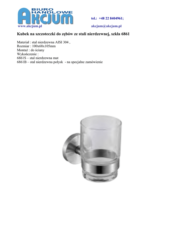 tel.: +48 22 8404961; www.akcjum.pl [email protected] Kubek na szczoteczki do zębów ze stali nierdzewnej, szkła 6861 Materiał : stal nierdzewna AISI 304 , Rozmiar : 100x68x105mm Montaż : do ściany Wykończenie : 6861S – stal nierdzewna mat 6861B – stal nierdzewna połysk - na specjalne zamówienie