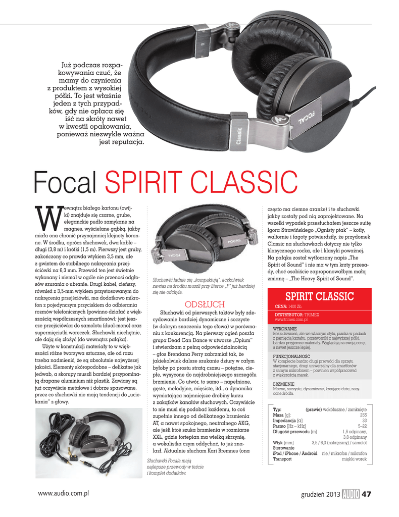 Już podczas rozpakowywania czuć, że mamy do czynienia z produktem z wysokiej półki. To jest właśnie jeden z tych przypadków, gdy nie opłaca się iść na skróty nawet w kwestii opakowania, ponieważ niezwykle ważna jest reputacja. Focal Spirit CLASSIC W ewnątrz białego kartonu (owijki) znajduje się czarne, grube, eleganckie pudło zamykane na magnes, wyściełane gąbką, jakby miała ona chronić przynajmniej klejnoty koronne. W środku, oprócz słuchawek, dwa kable – długi (3,8 m) i krótki (1,5 m). Pierwszy jest gruby, zakończony co prawda wtykiem 3,5 mm, ale z gwintem do stabilnego nakręcania przejściówki na 6,3 mm. Przewód ten jest świetnie wykonany i niemal w ogóle nie przenosi odgłosów szurania o ubranie. Drugi kabel, cieńszy, również z 3,5-mm wtykiem przystosowanym do nakręcenia przejściówki, ma dodatkowo mikrofon z pojedynczym przyciskiem do odbierania rozmów telefonicznych (powinno działać z większością współczesnych smartfonów); jest jeszcze przejściówka do samolotu (dual-mono) oraz supermięciutki woreczek. Słuchawki niechętnie, ale dają się złożyć (do wewnątrz pałąka). Użyte w konstrukcji materiały to w większości różne tworzywa sztuczne, ale od razu trzeba nadmienić, że są absolutnie najwyższej jakości. Elementy skóropodobne – delikatne jak jedwab, a skorupy muszli bardziej przypominają drapane aluminium niż plastik. Zawiasy są już oczywiście metalowe i dobrze spasowane, przez co słuchawki nie mają tendencji do „uciekania” z głowy. Słuchawki ładnie się „kompaktują”, aczkolwiek zawias na środku muszli przy literce „F” już bardziej się nie odchyla. ODSŁUCH Słuchawki od pierwszych taktów były zdecydowanie bardziej dynamiczne i soczyste (w dobrym znaczeniu tego słowa) w porównaniu z konkurencją. Na pierwszy ogień poszła grupa Dead Can Dance w utworze „Opium” i stwierdzam z pełną odpowiedzialnością – głos Brendana Perry zabrzmiał tak, że jakiekolwiek dalsze szukanie dziury w całym byłoby po prostu stratą czasu – potężne, ciepłe, wysycone do najdrobniejszego szczegółu brzmienie. Co utwór, to samo – napełnione, gęste, melodyjne, mięsiste, itd., a dynamika wymiatająca najmniejsze drobiny kurzu z zakątków kanałów słuchowych. Oczywiście to nie musi się podobać każdemu, to coś zupełnie innego od delikatnego brzmienia AT, a nawet spokojnego, neutralnego AKG, ale jeśli ktoś szuka brzmienia w rozmiarze XXL, gdzie fortepian ma wielką skrzynię, a wokalistka czym oddychać, to już znalazł. Aktualnie słucham Kari Bremnes (ona Słuchawki Focala mają najlepsze przewody w teście i komplet dodatków. www.audio.com.pl często ma ciemne aranże) i te słuchawki jakby zostały pod nią zaprojektowane. Na wszelki wypadek przesłuchałem jeszcze suitę Igora Strawińskiego „Ognisty ptak” – kotły, waltornie i fagoty potwierdziły, że przydomek Classic na słuchawkach dotyczy nie tylko klasycznego rocka, ale i klasyki poważnej. Na pałąku został wytłoczony napis „The Spirit of Sound” i nie ma w tym krzty przesady, choć osobiście zaproponowałbym małą zmianę – „The Heavy Spirit of Sound”. spirit classic CENA: 1400 ZŁ DYSTRYBUTOR: trimex www.trimex.com.pl Wykonanie Bez udziwnień, ale we własnym stylu, pianka w padach z pamięcią kształtu, przetworniki z najwyższej półki, bardzo przyjemne materiały. Wyglądają na swoją cenę, a nawet jeszcze lepiej. funkcjonalność W komplecie bardzo długi przewód dla sprzętu stacjonarnego, drugi uniwersalny dla smartfonów z samym mikrofonem – powinien współpracować z większością marek. brzmienie Mocne, soczyste, dynamiczne, kreujące duże, nasycone źródła. Typ: (prawie) wokółuszne / zamknięte Masa [g]: 255 Impedancja [W] 33 Pasmo [Hz – kHz] 5–22 Długość przewodu [m] 1,5 odpinany, 3,8 odpinany Wtyk [mm] 3,5 / 6,3 (nakręcany) / samolot Sterowanie iPod / iPhone / Android nie / mikrofon / mikrofon Transport miękki worek grudzień 2013 47