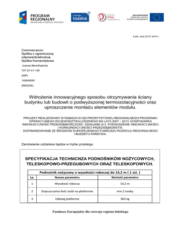 Łódź, dnia 22.01.2014 r. Commercecon Spółka z ograniczoną odpowiedzialnością Spółka Komandytowa (nazwa Beneficjenta) 727-27-41-139 (NIP) 100649281 (REGON) Wdrożenie innowacyjnego sposobu otrzymywania ściany budynku lub budowli o podwyższonej termoizolacyjności oraz uproszczenie montażu elementów modułu. PROJEKT REALIZOWANY W RAMACH III OSI PRIORYTETOWEJ REGIONALNEGO PROGRAMU OPERACYJNEGO WOJEWÓDZTWA ŁÓDZKIEGO NA LATA 2007 – 2013: GOSPODARKA INNOWACYJNOŚĆ PRZEDSIĘBIORCZOŚĆ, DZIAŁANIE III.2: PODNOSZENIE INNOWACYJNOŚCI I KONKURENCYJNOŚCI PRZEDSIĘBIORSTW, DOFINANSOWANIE ZE ŚRODKÓW EUROPEJSKIEGO FUNDUSZU ROZWOJU REGIONALNEGO I BUDŻETU PAŃSTWA. Zamówienie udzielane będzie w trybie przetargu SPECYFIKACJA TECHNICNZA PODNOŚNIKÓW NOŻYCOWYCH, TELESKOPOWO-PRZEGUBOWYCH ORAZ TELESKOPOWYCH. Podnośnik nożycowy o wysokości roboczej do 14,2 m ( 1 szt. ) Lp. Nazwa parametru Wartość parametru 1 Wysokość robocza 14,2 m 2 Dopuszczalna ilość osób na platformie min.2 osoby 3 Udźwig platformy 363 kg Fundusze Europejskie dla rozwoju regionu łódzkiego 4 Wysokość przejazdu do pełnej wysokość roboczej 5 Zdolność do jazdy po wzniesieniu 30% 6 Oś oscylacyjna posiada 7 Sterowanie proporcjonalne lub 3 punktowe Podnośnik nożycowy o wysokości roboczej do 18,15 m ( 1szt. ) Lp. Nazwa parametru Wartość parametru 1 Wysokość robocza 18,15 m 2 Udźwig platformy 680 kg 4 Samopoziomujące podpory posiada 5 Zdolność do jazdy po wzniesieniu 30% 6 Sterowanie proporcjonalne lub 3 punktowe 7 Napęd 4 koła 8 posiada: rozsuwany balkon o 1,52 m, wymienną płytę aluminiową na platformie, składane barierki, wbudowany system diagnostyczny oraz system tzw. osi oscylacyjnej. Podnośnik teleskopowo – przegubowy o wysokości roboczej do 16,07 m ( 2 szt. ) Lp. Nazwa parametru Wartość parametru 1 Wysokość robocza 16,07 m 2 Wysięg boczny min. 7,65 m 3 Udźwig platformy 227 kg 4 Obrót platformy 180 stopni 5 Obrót kopuły 355 stopni 6 Zdolność do jazdy po wzniesieniu 25% Fundusze Europejskie dla rozwoju regionu łódzkiego 7 8 Sterowanie proporcjonalne - posiada: przegubowe ramie teleskopowe, - wyposażony w platformę z systemem samo – poziomowania, hydraulicznie obracaną, z systemem zabezpieczającym przed jazdą w przeciwnym kierunku, - możliwe zastosowanie specjalnego oleju biodegradowalnego. Podnośnik teleskopowy o wysokości roboczej do 19,8 m ( 2 szt. ) Lp. Nazwa parametru Wartość parametru 1 Maksymalna wysokość robocza 19,8 m 2 Wysięg boczny 15,5 m 3 Udźwig platformy w zależności od wysięgu 340 – 567 kg 4 Obrót platformy 160 stopni 5 Obrót kopuły 360 stopni ciągły 6 Zdolność do jazdy po wzniesieniu 25% 7 Sterowanie proporcjonalne 8 układ tzw. osi oscylacyjnej umożliwiający nieprzerwany kontakt 4 kół z podłożem. Prosimy o przedstawienie ceny oferty w postaci tabeli: Lp Przedmiot zamówienia Jednostka miary Ilość 1 2 3 Podest nożycowy mały Podest nożycowy duży Podest teleskopowo przegubowy Podest teleskopowy n/d szt. szt. szt. 1 1 2 szt. n/d 2 n/d 4 Razem Cena jednostkowa netto Wartość netto Stawka VAT (%) n/d Fundusze Europejskie dla rozwoju regionu łódzkiego n/d Wartość VAT Wartość brutto OPIS KRYTERIÓW, KTÓRYMI FIRMA BĘDZIE SIĘ KIEROWAŁA PRZY WYBORZE OFERTY ORAZ ZNACZENIE TYCH KRYTERIÓW Maksymalna liczba punktów możliwych do uzyskania – 100 Lp. Rodzaj Kryterium Sposób oceny Punktacja 1 Cena 80 Stosunek ceny w ofercie z najniższą ceną do ceny badanej oferty mnożony przez 80 2 Gwarancja 20 Stosunek okresu gwarancji w badanej ofercie do okresu gwarancji w ofercie z najdłuższą gwarancją mnożony przez 20 Termin realizacji zamówienia: II kwartał 2014 r. Ostateczny termin składania ofert: 06.02.2014 Oferty wraz ze szczegółową specyfikacją należy składać osobiście lub listownie na adres: COMMERCECON Spółka z ograniczoną odpowiedzialnością Sp.K. ul. Gdańska 47/49, 90-729 Łódź lub pocztą elektroniczną na adres: [email protected] Oferty składane listownie lub osobiście prosimy umieścić w dwóch zaklejonych kopertach, z adnotacją na wewnętrznej kopercie „Otworzyć dnia 6.02.2014” Data i miejsce otwarcia ofert: 06.02.2014, Łódź ul. Gdańska 47/49 Osoba do kontaktu w ramach zamówienia: Daniel Tadeusiewicz tel.505 099 014 e-mail [email protected] W przypadku podania wartości ofert w walucie obcej, wartość zamówienia będzie przeliczana na złotówki według średniego kursu NBP z dnia otwarcia ofert. Poprzez złożenie oferty Oferent wyraża zgodę na podanie do wiadomości pozostałych Oferentów szczegółów oferty. Oferent ma prawo nie wyrazić zgody na podanie do wiadomości szczegółów technicznych przedmiotu zamówienia. Beneficjent zastrzega sobie prawo do zmiany warunków udzielenia zamówienia oraz do unieważnienia postępowania. Fundusze Europejskie dla rozwoju regionu łódzkiego