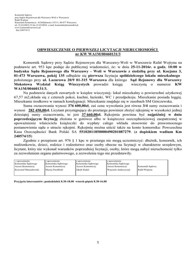 Komornik Sądowy przy Sądzie Rejonowym dla Warszawy-Woli w Warszawie Rafał Wojtyna Kancelaria Komornicza Al.Solidarności 155/11, 00-877 Warszawa tel. 22 6310833,35 fax 22 6310834 e-mail: [email protected] www.komornikwarszawa.pl Km 240574/15 OBWIESZCZENIE O PIERWSZEJ LICYTACJI NIERUCHOMOŚCI nr KW WA1M/00460131/3 Komornik Sądowy przy Sądzie Rejonowym dla Warszawy-Woli w Warszawie Rafał Wojtyna na podstawie art. 953 kpc podaje do publicznej wiadomości, że: w dniu 25-11-2016r. o godz. 10:00 w budynku Sądu Rejonowego dla Warszawy - Woli w Warszawie z siedzibą przy ul. Kocjana 3, 01-473 Warszawa, pokój 135 odbędzie się pierwsza licytacja spółdzielczego lokalu mieszkalnego położonego przy ul. Lazurowa 20/9 01-315 Warszawa dla którego Sąd Rejonowy dla Warszawy Mokotowa Wydział Ksiąg Wieczystych prowadzi księgę wieczystą o numerze KW WA1M/00460131/3. Na podstawie danych zawartych w księdze wieczystej- lokal mieszkalny o powierzchni użytkowej 67,57 m2,składa się z czterech pokoi, kuchni, łazienki, WC i przedpokoju. Mieszkanie posiada loggię. Mieszkanie środkowe w ramach kondygnacji. Mieszkanie znajduje się w zasobach SM Górczewska. Suma oszacowania wynosi 376 600,00zł, zaś cena wywołania jest równa 3/4 sumy oszacowania i wynosi 282 450,00zł. Licytant przystępujący do przetargu powinien złożyć rękojmię w wysokości jednej dziesiątej sumy oszacowania, to jest 37 660,00zł. Rękojmia powinna być najpóźniej w dniu poprzedzającym licytację złożona w gotówce albo w książeczce oszczędnościowej zaopatrzonej w upoważnienie właściciela książeczki do wypłaty całego wkładu stosownie do prawomocnego postanowienia sądu o utracie rękojmi. Rękojmię można uiścić także na konto komornika: Powszechna Kasa Oszczędności Bank Polski SA 55102011850000490201087279. (z dopiskiem wadium Km 240574/15) Zgodnie z przepisem art. 976 § 1 kpc w przetargu nie mogą uczestniczyć: dłużnik, komornik, ich małżonkowie, dzieci, rodzice i rodzeństwo oraz osoby obecne na licytacji w charakterze urzędowym, licytant, który nie wykonał warunków poprzedniej licytacji, osoby, które mogą nabyć nieruchomość tylko za zezwoleniem organu państwowego, a zezwolenia tego nie przedstawiły. z upoważnienia z upoważnienia z upoważnienia z upoważnienia Komornika Sądowego Asesor Komorniczy Krzysztof Mazuchowski Komornika Sądowego Asesor Komorniczy Maciej Parafiński Komornika Sądowego Asesor Komorniczy Jakub Siadul Komornika Sądowego Asesor Komorniczy Wojciech Andryszczyk Przyjęcia interesantów: poniedziałek 8.30-18.00 wtorek-piątek 8.30-16.00 1 Komornik Sądowy Rafał Wojtyna