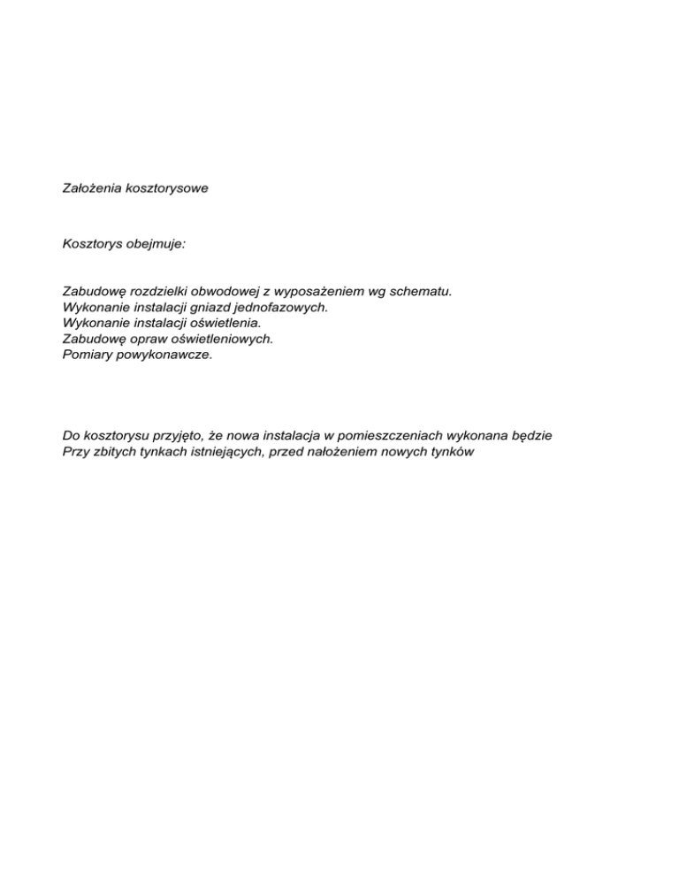 Założenia kosztorysowe Kosztorys obejmuje: Zabudowę rozdzielki obwodowej z wyposażeniem wg schematu. Wykonanie instalacji gniazd jednofazowych. Wykonanie instalacji oświetlenia. Zabudowę opraw oświetleniowych. Pomiary powykonawcze. Do kosztorysu przyjęto, że nowa instalacja w pomieszczeniach wykonana będzie Przy zbitych tynkach istniejących, przed nałożeniem nowych tynków Kosztorys ofertowy Numer 1 1.1 1.2 1.3 1.4 Podstawa Element KNR 508/802/7 Opis Instalacja elektryczna Mechaniczne wykonanie ślepych otworów i wnęk w cegle, objętość do 1.00·dm3 - wykucie wnęki pod skrzynkę rozdzielczą KNNR 5/1209/1 (1) Przebijanie otworów w ścianach lub stropach, w gazobetonie, długość przebicia do 15·cm, Fi·25·mm KNNR 5/404/1 Tablice rozdzielcze i obudowy, tablica 6-modułowa z klapką, pt. KNNR 5/407/3 (2) Osprzęt modułowy w rozdzielnicach, rozłącznik lub wyłącznik przeciwporażeniowy, 2-biegunowy P302-25A/0,03A 1.5 KNNR 5/407/1 1.6 KNNR 5/407/1 1.7 KNNR 5/205/1 1.8 KNNR 5/205/1 1.9 KNNR 5/205/1 1.10 KNR 508/805/3 1.11 1.12 KNNR 5/302/1 KNNR 5/302/6 (2) 1.13 1.14 KNNR 5/306/2 (1) KNNR 5/308/3 1.15 KNNR 5/501/1 (2) 1.16 KNNR 5/504/1 1.17 KNNR 5/1303/1 1.18 KNNR 5/1305/1 Jedn. Ilość Krotn. Cena jdn. szt 1 1 otwór 1 1 szt 1 1 1 1 1 1 1 1 20 1 10 1 5 1 6 4 1 1 2 2 1 1 2 1 1 1 1 1 2 1 1 1 szt Osprzęt modułowy w rozdzielnicach, wyłącznik nadprądowy, 1 biegunowy S311B-10A szt Osprzęt modułowy w rozdzielnicach, wyłącznik nadprądowy, 1 biegunowy S311B-16A szt Przewody kabelkowe układane p.t. w gotowych bruzdach, na podłożu innym niż betonowe, YDYpżo 3x2,5mm2 m Przewody kabelkowe układane p.t. w gotowych bruzdach, na podłożu innym niż betonowe, YDYpżo 3x1,5mm2 m Przewody kabelkowe układane p.t. w gotowych bruzdach, na podłożu innym niż betonowe, YDYpżo 2x1,5mm2 m Ręczne wykonanie ślepych otworów i wnęk w cegle, objętość do 0.25·dm3 - otwory pod puszki instalacyjne szt Puszki instalacyjne podtynkowe, Fi·60, pojedyncze szt Puszki instalacyjne podtynkowe, Fi·80, 4-otworowe, z zaciskami skrętnymi szt Łącznik pt 10A, 250V 1-biegunowy szt Gniazda instalacyjne wtyczkowe ze stykiem ochronnym, pt, 2biegunowe 16A 2,5·mm2 przelotowe podwójne szt Oprawy oświetleniowe zawieszane (zwykłe), oprawa z świetlówką kompaktową 21W kpl Oprawa bryzgoodporna, strugoodporna, zawieszana świetlówkowa 1x14W, IP 54 kpl Pomiar rezystancji izolacji instalacji elektrycznej, obwód 1fazowy, pomiar pierwszy pomiar Sprawdzenie samoczynnego wyłączania zasilania, działanie wyłącznika różnicowoprądowego, próba pierwsza próba Wartość