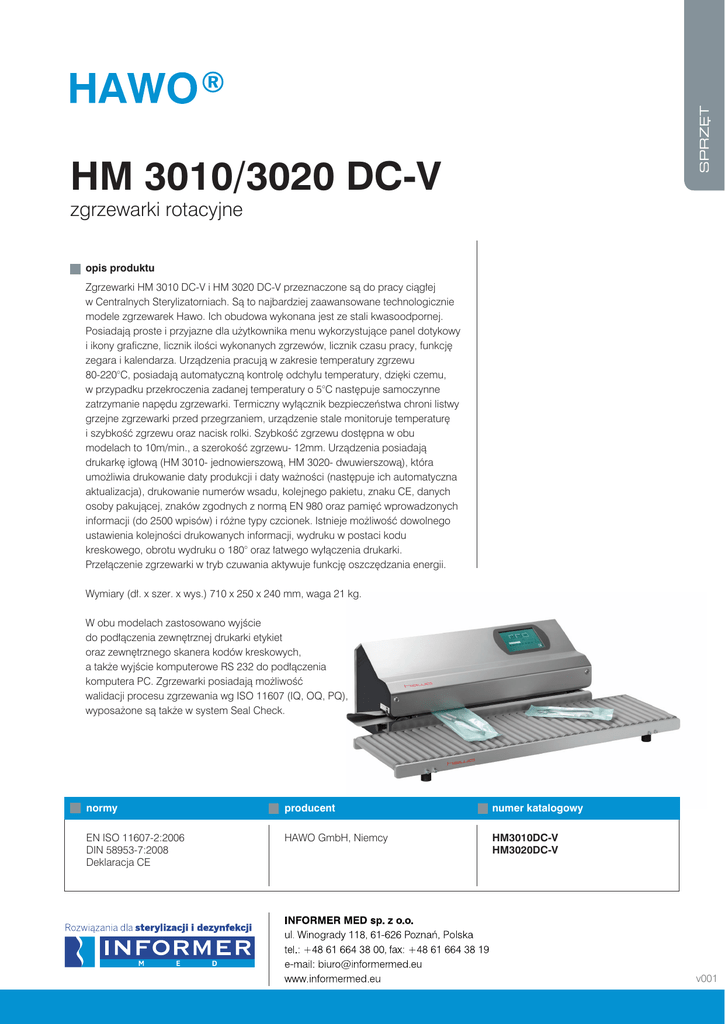 HM 3010/3020 DC-V zgrzewarki rotacyjne opis produktu Zgrzewarki HM 3010 DC-V i HM 3020 DC-V przeznaczone są do pracy ciągłej w Centralnych Sterylizatorniach. Są to najbardziej zaawansowane technologicznie modele zgrzewarek Hawo. Ich obudowa wykonana jest ze stali kwasoodpornej. Posiadają proste i przyjazne dla użytkownika menu wykorzystujące panel dotykowy i ikony graficzne, licznik ilości wykonanych zgrzewów, licznik czasu pracy, funkcję zegara i kalendarza. Urządzenia pracują w zakresie temperatury zgrzewu 80-220°C, posiadają automatyczną kontrolę odchyłu temperatury, dzięki czemu, w przypadku przekroczenia zadanej temperatury o 5°C następuje samoczynne zatrzymanie napędu zgrzewarki. Termiczny wyłącznik bezpieczeństwa chroni listwy grzejne zgrzewarki przed przegrzaniem, urządzenie stale monitoruje temperaturę i szybkość zgrzewu oraz nacisk rolki. Szybkość zgrzewu dostępna w obu modelach to 10m/min., a szerokość zgrzewu- 12mm. Urządzenia posiadają drukarkę igłową (HM 3010- jednowierszową, HM 3020- dwuwierszową), która umożliwia drukowanie daty produkcji i daty ważności (następuje ich automatyczna aktualizacja), drukowanie numerów wsadu, kolejnego pakietu, znaku CE, danych osoby pakującej, znaków zgodnych z normą EN 980 oraz pamięć wprowadzonych informacji (do 2500 wpisów) i różne typy czcionek. Istnieje możliwość dowolnego ustawienia kolejności drukowanych informacji, wydruku w postaci kodu kreskowego, obrotu wydruku o 180° oraz łatwego wyłączenia drukarki. Przełączenie zgrzewarki w tryb czuwania aktywuje funkcję oszczędzania energii. Wymiary (dł. x szer. x wys.) 710 x 250 x 240 mm, waga 21 kg. W obu modelach zastosowano wyjście do podłączenia zewnętrznej drukarki etykiet oraz zewnętrznego skanera kodów kreskowych, a także wyjście komputerowe RS 232 do podłączenia komputera PC. Zgrzewarki posiadają możliwość walidacji procesu zgrzewania wg ISO 11607 (IQ, OQ, PQ), wyposażone są także w system Seal Check. normy producent numer katalogowy EN ISO 11607-2:2006 DIN 58953-7:2008 Deklaracja CE HAWO GmbH, Niemcy HM3010DC-V HM3020DC-V v001