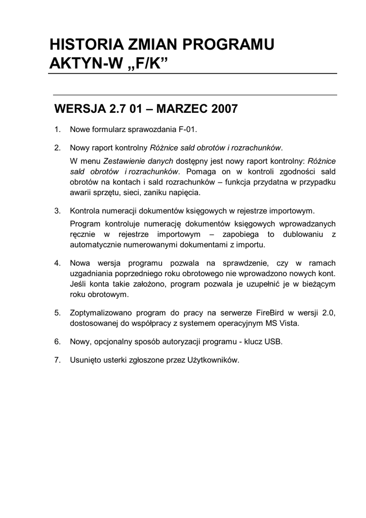 HISTORIA ZMIAN PROGRAMU AKTYN-W „F/K” WERSJA 2.7 01 – MARZEC 2007 1. Nowe formularz sprawozdania F-01. 2. Nowy raport kontrolny Różnice sald obrotów i rozrachunków. W menu Zestawienie danych dostępny jest nowy raport kontrolny: Różnice sald obrotów i rozrachunków. Pomaga on w kontroli zgodności sald obrotów na kontach i sald rozrachunków – funkcja przydatna w przypadku awarii sprzętu, sieci, zaniku napięcia. 3. Kontrola numeracji dokumentów księgowych w rejestrze importowym. Program kontroluje numerację dokumentów księgowych wprowadzanych ręcznie w rejestrze importowym – zapobiega to dublowaniu z automatycznie numerowanymi dokumentami z importu. 4. Nowa wersja programu pozwala na sprawdzenie, czy w ramach uzgadniania poprzedniego roku obrotowego nie wprowadzono nowych kont. Jeśli konta takie założono, program pozwala je uzupełnić je w bieżącym roku obrotowym. 5. Zoptymalizowano program do pracy na serwerze FireBird w wersji 2.0, dostosowanej do współpracy z systemem operacyjnym MS Vista. 6. Nowy, opcjonalny sposób autoryzacji programu - klucz USB. 7. Usunięto usterki zgłoszone przez Użytkowników. WERSJA 2.6.01 – SIERPIEŃ 2006 1. Nowy sposób rozliczania rozrachunków - wzajemna kompensata. 2. Program pozwala na rozliczanie rozrachunków poprzez ich wzajemne kompensowanie. Jest to alternatywny sposób rozliczania rozrachunków w stosunku do już istniejącego. Pozwala on oznaczyć grupę rozrachunków na jednym lub większej liczbie kont (np. na wskazanych kontach wybranego kontrahenta) i oznaczyć je jako rozliczone poprzez wzajemne ich zbilansowanie. 3. Zmodyfikowano raporty i zestawienia związane z rozrachunkami (Zestawienie rozrachunków, Potwierdzenie salda, Wezwanie do zapłaty, Nota odsetkowa). uwzględniając w nich rozrachunki rozliczone poprzez wzajemną kompensatę. 4. Program oferuje też inny nowy sposób rozliczania rozrachunków - poprzez zapłatę salda grupowanych rozrachunków. Wykonanie takiego rozliczenia przeprowadza się z listy rozrachunków. Polega ono na zgrupowaniu rozrachunków z jednego lub więcej kont kontrahenta i zapłaceniu każdego z nich w kwocie pozostałej do zapłaty. 5. Udogodnienia w obsłudze parowania kontrahentów w imporcie z systemu sprzedaży Aktyn. 6. Nazwy kontrahenta w systemie księgowym oraz zaimportowanego z Aktyna wyświetlane są w całości po najechaniu na nie kursorem myszy. Przyśpieszono moment pojawiania pełnych nazw oraz wydłużono czas ich wyświetlania. 7. Aktywny rekord na liście propozycji kontrahenta w systemie księgowym podświetlony jest na całej szerokości, co ułatwia jego identyfikację. 8. W oknie parowania kontrahentów wprowadzono możliwość trwałej zmiany danych kontrahenta – oprócz identyfikatora i analityki konta- zapisanych w ewidencji kontrahentów. 9. Wprowadzono dodatkowe zabezpieczenie przed dodaniem kontrahenta bez wygenerowanego identyfikatora i analityki konta – brak takiego zabezpieczenia skutkował dotychczas komunikatem o błędzie podczas importu: Zbyt krótka maska analityki kontrahenta .... 10. Renumeracja dokumentów księgowych. 11. Program pozwala na przenumerowanie dokumentów księgowych o typie numeracji miesięcznym i narastającym. w rejestrach 12. Ułatwienie identyfikacji niezaksięgowanych kont w Bilansie Otwarcia. 13. W opcji Bilans otwarcia dodano etykietę wyświetlającą liczbę niezaksięgowanych kont w BO i przycisk do ich szybkiego wyszukiwania. Ułatwia to identyfikację niezaksięgowanych pozycji w zaksięgowanym wcześniej bilansie, powstałych po dodaniu nowych kont do BO już po jego zaksięgowaniu. 14. Nowa etykieta ułatwia ocenę kompletności księgowania BO przed wykonaniem operacji przeniesienia bilansu zamknięcia na bilans otwarcia następnego roku. 15. Usprawnienie pracy automatów księgowych. 16. Program pozwala na zakładanie rozrachunków i rejestrowanie dokumentów z poziomu automatów księgowych. 17. Użytkownik może skonfigurować Plan wykonania automatów określając kolejność wykonania automatów księgowych, z których korzysta. 18. W oknie otwartego dokumentu dodano przycisk przenoszący kwotę dekretu ze strony WN na MA i z MA na WN, aktywny wyłącznie dla kont nierozrachunkowych w dokumentach niezbilansowanych. 19. Nowa wersja raportu dodatkowego Wyszukiwanie kont i obrotów - aktualnie pozwala on na grupowanie zapisów według kilkunastu różnych kryteriów równocześnie oraz na podsumowanie tak wybranych zapisów. 20. Na Liście faktur dodano nowy przycisk pozwalający na filtrowanie faktur z określonego miesiąca z podatkiem VAT do rozliczenia w innym miesiącu niż miesiąc wystawienia faktury, z możliwością wskazania rejestru VAT. Dodano też nowy raport przedstawiający listę wyfiltrowanych w ten sposób faktur. 21. Nowa wersja programu pozwala na automatyczne przepisywanie opisu pozycji dokumentu podczas tworzenia dekretów do zapłaty rozrachunku oraz rozrachunku. 22. Usunięto usterki zgłoszone przez Użytkowników. WERSJA 2.4 01 – LUTY 2006 1. Nowe formularze: deklaracji podatkowej CIT-2 i sprawozdania F-01. 2. Usprawniono dokumencie. 3. Program numeruje dekrety w dokumencie oraz umożliwia wstawianie dekretu pomiędzy już istniejące (ułatwienie obsługi poprzez skrót klawiaturowy Ctrl-Ins). 4. Usprawniono przeglądanie i edycję dekretów w dokumencie – program ułatwia i przyspiesza identyfikację aktywnego rekordu i aktualnie edytowanego pola. 5. Ułatwienie w zakresie numeracji dokumentów. działanie mechanizmu wyszukiwania dekretów w Dotychczas w rejestrach o miesięcznej numeracji numer dokumentu musiał być dodatkowo łamany przez miesiąc. Począwszy od niniejszej wersji programu nie ma takiego wymogu. 6. Program umożliwia przepisywanie opisu dekretu do treści rozrachunku lub zapłaty. 7. Wprowadzono zabezpieczenie uniemożliwiające usunięcie dokumentów stworzonych przez innego użytkownika. Administrator bazy danych ma uprawnienie do kasowania w