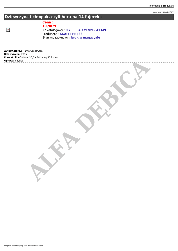 Informacje o produkcie Utworzono 08-03-2017 Dziewczyna i chłopak, czyli heca na 14 fajerek Cena : 19,90 zł Nr katalogowy : 9 788364 379789 - AKAPIT Producent : AKAPIT PRESS Stan magazynowy : brak w magazynie AL FA D ĘB IC A Autor/Autorzy: Hanna Ożogowska Rok wydania: 2015 Format / ilość stron: 20,5 x 14,5 cm / 176 stron Oprawa: miękka Wygenerowano w programie www.oscGold.com
