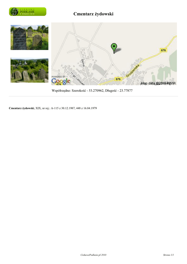 Cmentarz żydowski Współrzędne: Szerokość - 53.270962, Długość - 23.77877 Cmentarz żydowski, XIX, nr rej.: A-115 z 30.12.1987, 448 z 16.04.1979 CiekawePodlasie.pl 2010 Strona 1/1