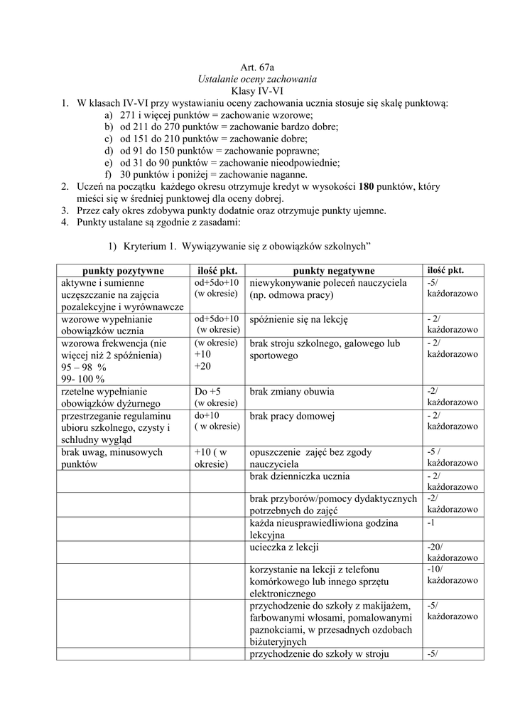 Art. 67a Ustalanie oceny zachowania Klasy IV-VI 1. W