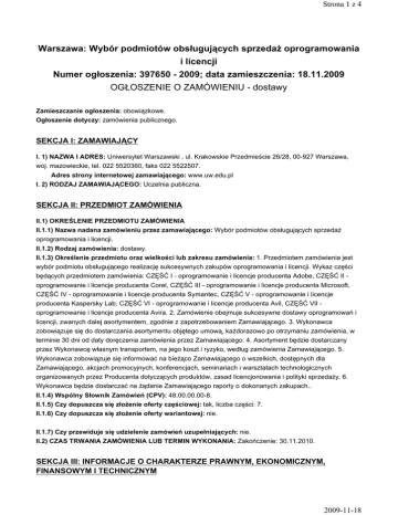 Strona 1 z 4 Warszawa: Wybór podmiotów obsługujących sprzedaŜ oprogramowania i licencji Numer ogłoszenia: 397650 - 2009; data zamieszczenia: 18.11.2009 OGŁOSZENIE O ZAMÓWIENIU - dostawy Zamieszczanie ogłoszenia: obowiązkowe. Ogłoszenie dotyczy: zamówienia publicznego. SEKCJA I: ZAMAWIAJĄCY I. 1) NAZWA I ADRES: Uniwersytet Warszawski , ul. Krakowskie Przedmieście 26/28, 00-927 Warszawa, woj. mazowieckie, tel. 022 5520360, faks 022 5522507. Adres strony internetowej zamawiającego: www.uw.edu.pl I. 2) RODZAJ ZAMAWIAJĄCEGO: Uczelnia publiczna. SEKCJA II: PRZEDMIOT ZAMÓWIENIA II.1) OKREŚLENIE PRZEDMIOTU ZAMÓWIENIA II.1.1) Nazwa nadana zamówieniu przez zamawiającego: Wybór podmiotów obsługujących sprzedaŜ oprogramowania i licencji. II.1.2) Rodzaj zamówienia: dostawy. II.1.3) Określenie przedmiotu oraz wielkości lub zakresu zamówienia: 1. Przedmiotem zamówienia jest wybór podmiotu obsługującego realizację sukcesywnych zakupów oprogramowania i licencji. Wykaz części będących przedmiotem zamówienia: CZĘŚĆ I - oprogramowanie i licencje producenta Adobe, CZĘŚĆ II oprogramowanie i licencje producenta Corel, CZĘŚĆ III - oprogramowanie i licencje producenta Microsoft, CZĘŚĆ IV - oprogramowanie i licencje producenta Symantec, CZĘŚĆ V - oprogramowanie i licencje producenta Kaspersky Lab, CZĘŚĆ VI - oprogramowanie i licencje producenta Avil, CZĘŚĆ VII oprogramowanie i licencje producenta Avira. 2. Zamówienie obejmuje sukcesywne dostawy oprogramowań i licencji, zwanych dalej asortymentem, zgodnie z zapotrzebowaniem Zamawiającego. 3. Wykonawca zobowiązuje się do dostarczania asortymentu objętego umową, kaŜdorazowo po otrzymaniu zamówienia, w terminie 30 dni od daty doręczenia zamówienia przez Zamawiającego. 4. Asortyment będzie dostarczany przez Wykonawcę własnym transportem, na jego koszt i ryzyko, według zamówienia Zamawiającego. 5. Wykonawca zobowiązuje się informować na bieŜąco Zamawiającego o wszelkich, dostępnych dla Zamawiającego, akcjach promocyjnych, konferencjach, seminariach i warsztatach technologicznych organizowanych przez Producenta dotyczących produktów, zasad licencjonowania i polityki sprzedaŜy. 6. Wykonawca będzie dostarczać na Ŝądanie Zamawiającego raporty o dokonanych zakupach.. II.1.4) Wspólny Słownik Zamówień (CPV): 48.00.00.00-8. II.1.5) Czy dopuszcza się złoŜenie oferty częściowej: tak, liczba części: 7. II.1.6) Czy dopuszcza się złoŜenie oferty wariantowej: nie. II.1.7) Czy przewiduje się udzielenie zamówień uzupełniających: nie. II.2) CZAS TRWANIA ZAMÓWIENIA LUB TERMIN WYKONANIA: Zakończenie: 30.11.2010. SEKCJA III: INFORMACJE O CHARAKTERZE PRAWNYM, EKONOMICZNYM, FINANSOWYM I TECHNICZNYM 2009-11-18 Strona 2 z 4 III.1) WARUNKI DOTYCZĄCE ZAMÓWIENIA Informacja na temat wadium: Zamawiający nie wymaga wniesienia wadium w niniejszym postępowaniu III.2) WARUNKI UDZIAŁU Opis warunków udziału w postępowaniu oraz opis sposobu dokonywania oceny spełniania tych warunków: 1. O udzielenie niniejszego zamówienia mogą ubiegać się Wykonawcy, którzy spełniają warunki udziału w postępowaniu, o których mowa w art. 22 ust. 1 Ustawy - Prawo zamówień publicznych, zwanej dalej Ustawą. 2. Ocena spełnienia warunków określonych w art. 22 Ustawy nastąpi na podstawie przedstawionych przez wykonawcę dokumentów i oświadczeń. 3. O udzielenie zamówienia mogą ubiegać się wykonawcy, którzy spełnią następujące warunki (dotyczy części I - VII): 1) posiadają uprawnienia do wykonywania działalności/czynności będącej przedmiotem zamówienia i nie podlegają wykluczeniu z postępowania o zamówienie publiczne, 2) posiadają niezbędną wiedzę i doświadczenie oraz dysponują potencjałem technicznym i osobami zdolnymi do wykonania zamówienia lub przedstawią pisemne zobowiązanie innych podmiotów do udostępnienia potencjału technicznego i osób zdolnych do wykonania zamówienia, 3) znajdują się w sytuacji ekonomicznej i finansowej zapewniającej wykonanie zamówienia, 4) nie podlegają wykluczeniu z postępowania o udzielenie zamówienia. 4. Sposób dokonywania oceny spełnienia warunków wymaganych od wykonawców oparty będzie na zasadzie TAK / NIE (spełnia / nie spełnia).. Informacja o oświadczeniach i dokumentach, jakie mają dostarczyć wykonawcy w celu potwierdzenia spełniania warunków udziału w postępowaniu: W celu wykazania spełnienia warunków udziału w niniejszym postępowaniu, kaŜdy z wykonawców powinien przedłoŜyć wraz z ofertą następujące oświadczenia i dokumenty - wypełnione i podpisane przez osoby uprawnione do reprezentowania wykonawcy (dotyczy części I - VII): 1) Formularz Nr 1 - oświadczenie o spełnianiu warunków udziału w postępowaniu. Wykonawca składa jeden Formularz nr 1 niezaleŜnie od ilości części, na które składa ofertę. Do formularza Nr 1 wykonawca zobowiązany jest dołączyć następujące dokumenty (Wykonawca składa jeden komplet /załączników/ dokumentów niezaleŜnie od tego na ile części składa ofertę): a) aktualny odpis z właściwego rejestru albo aktualne zaświadczenia o wpisie do ewidencji działalności gospodarczej, jeŜeli odrębne przepisy wymagają wpisu do rejestru lub zgłoszenia do ewidencji działalności gospodarczej, wystawione nie wcześniej niŜ 6 miesięcy przed upływem terminu składania ofert. b) pełnomocnictwo do reprezentowania wykonawcy oraz do podpisywania umów (o ile nie wynika z dokumentów rejestracyjnych); pełnomocnictwo musi być podpisane przez osoby uprawnione do reprezentowania wykonawcy (podpisy i pieczęcie oryginalne) lub mieć postać aktu notarialnego, albo notarialnie potwierdzonej kopii oraz posiadać termin waŜności, z którego wynika, Ŝe jest obowiązujące dla niniejszego postępowania i zapis z którego wynika, Ŝe dotyczy niniejszego postępowania.. SEKCJA IV: PROCEDURA IV.1) TRYB UDZIELENIA ZAMÓWIENIA IV.1.1) Tryb udzielenia za