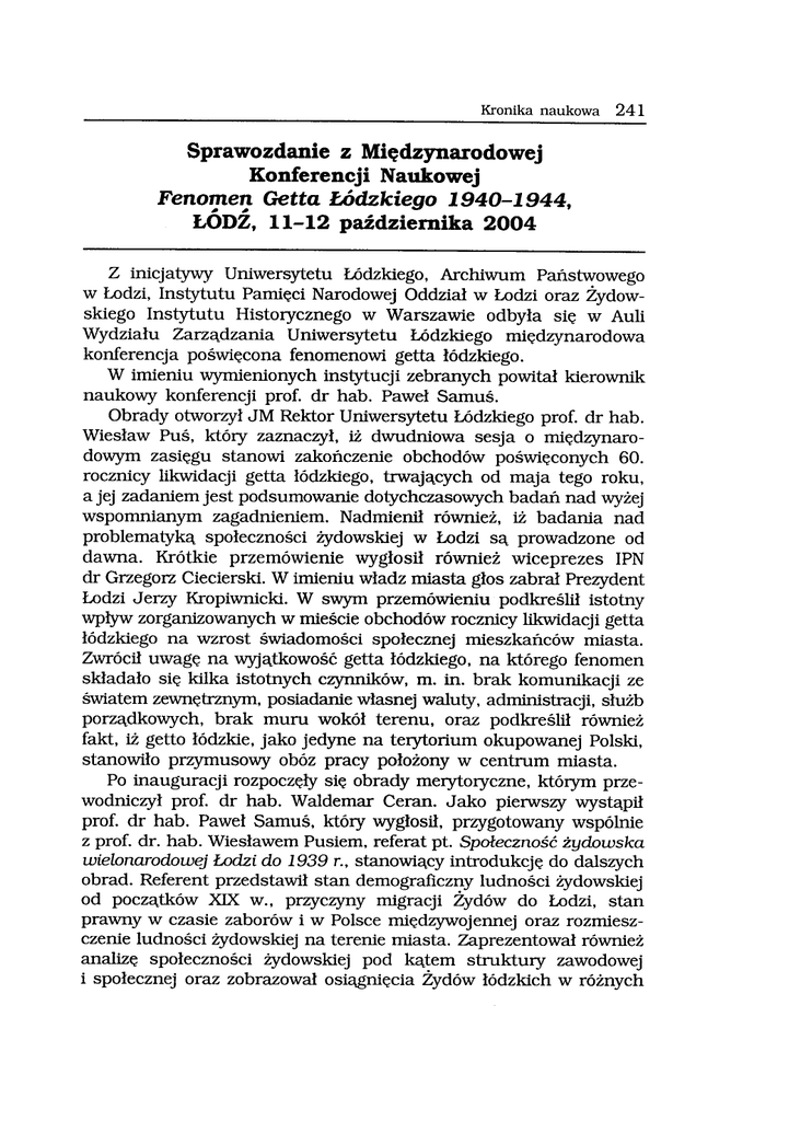 Kronika naukowa 241 Sprawozdanie z Międzynarodowej Konferencji Naukowej Fenomen ,. ,. Getta Łódzkiego 1940-1944, LODZ, 11-12 października 2004 Z inicjatywy Uniwersytetu Łódzkiego, Archiwum Państwowego w Łodzi, Instytutu Pamięci Narodowej Oddział w Łodzi oraz Żydowskiego Instytutu Historycznego w Warszawie odbyła się w Auli Wydziału Zarządzania Uniwersytetu Łódzkiego międzynarodowa konferencja poświęcona fenomenowi getta łódzkiego. W imieniu wymienionych instytucji zebranych powitał kierownik naukowy konferencji prof. dr hab. Paweł Samuś. Obrady otworzył JM Rektor Uniwersytetu Łódzkiego prof. dr hab. Wiesław Puś, który zaznaczył, iż dwudniowa sesja o międzynarodowym zasięgu stanowi zakończenie obchodów poświęconych 60. rocznicy likwidacji getta łódzkiego, trwających od maja tego roku, a jej zadaniem jest podsumowanie do1ychczasowychbadań nad wyżej wspomnianym zagadnieniem. Nadmienił również, iż badania nad problema1yką społeczności żydowskiej w Łodzi są prowadzone od dawna. Krótkie przemówienie wygłosił również wiceprezes IPN dr Grzegorz Ciecierski. W imieniu władz miasta głos zabrał Prezydent Łodzi Jerzy Kropiwnicki. W swym przemówieniu podkreślił istotny wpływ zorganizowanych w mieście obchodów rocznicy likwidacji getta łódzkiego na wzrost świadomości społecznej mieszkańców miasta. Zwrócił uwagę na wyjątkowość getta łódzkiego, na którego fenomen składało się kilka istotnych czynników, m. in. brak komunikacji ze światem zewnętrznym, posiadanie własnej walu1y,administracji, służb porządkowych, brak muru wokół terenu, oraz podkreślił również fakt, iż getto łódzkie, jako jedyne na terytorium okupowanej Polski, stanowiło przymusowy obóz pracy położony w centrum miasta. Po inauguracji rozpoczęły się obrady merytoryczne, którym przewodniczył prof. dr hab. Waldemar Ceran. Jako pierwszy wystąpił prof. dr hab. Paweł Samuś, który wygłosił, przygotowany wspólnie z prof. dr. hab. Wiesławem Pusiem, referat pt. Społeczność żydowska wielonarodowej Łodzi do 1939 r., stanowiący introdukcję do dalszych obrad. Referent przedstawił stan demograficzny ludności żydowskiej od początków XIX w., przyczyny migracji Żydów do Łodzi, stan prawny w czasie zaborów i w Polsce międzywojennej oraz rozmieszczenie ludności żydowskiej na terenie miasta. zaprezentował również analizę społeczności żydowskiej pod kątem struktury zawodowej i społecznej oraz zobrazował osiągnięcia Żydów łódzkich w różnych 242 Kronika naukowa dziedzinach życia społecznego, gospodarczego i kulturalnego. Przemówieniu towarzyszyła, przygotowana przez referenta, przy udziale dr. Wojciecha Ziomka (UL), prezentacja komputerowa, ilustrująca słuchaczom treści zawarte w referacie. Kolejny referat, wygłoszony przez dr. Janusza Wróbla (IPN) pt. Specyfika polityki hitlerowskiej w Łodzi w latach 1939-1945, poświęcony został polityce władz okupacyjnych w Łodzi, która, generalizując, sprowadzała się do całkowitej germanizacji, inkorporowanych do III Rzeszy ziem, przejawiającej się m. in. w wprowadzeniu niemieckiego języka urzędowego, niemieckiego nazewnictwa (zmieniono nazwę miasta na Litzmanstadt) oraz systematycznie prowadzonej akcji przesiedleńczej, mającej na celu zupełną depolonizację miasta. Profesor dr hab. Feliks Tych (ŻIH)w wystąpieniu pt. Typologia gett w okupowanej Polsce przedstawił cechy charakterystyczne poszczególnych gett, zaznaczając różnice i wspólne elementy. Konkludując postawił tezę, iż nie istniał jeden określony wzór, według którego tworzono getto. Referat mgr. Juliana Baranowskiego Utworzenie i organizacja getta w Łodzi traktował o problemach związanych z utworzeniem miejsca odosobnienia dla ludności żydowskiej w Łodzi. Referent w swym przemówieniu zawarł tezę, iż getto łódzkie stanowiło wzór dla innych gett pod względem sprawności organizacji. Magister J. Baranowski omówił również działalność przełożonego Starszeństwa Żydóww getcie łódzkim Chaima Mordechaja Rumkowskiego. Popołudniową część obrad, pod przewodnictwem dr. Janusza Wróbla i dyrektor Urszuli Zarzyckiej (APŁ),rozpoczął prof. Abraham Cykiert (World Federation of Polih Jews-Australian Branch, Australia) referatem pt. The Uniqueness of the Lodz Ghetto. W swym przemówieniu szczególną uwagę zwrócił na działalność Chaima Mordechaja Rumkowskiego i jego koncepcję "ocalenia przez pracę". Podkreślił kontrowersyjność postaci przełożonego Starszeństwa Żydów oraz postawił pytanie, czy Rumkowski, gdyby przeżył, zostałby uznany za bohatera holocaustu, czy też byłby sądzony jako zbrodniarz wojenny. Jednocześnie przedstawił argumenty na obronę Rumkowskiego przed zarzutami o kolaborację. Ponadto wyraził opinię, iż unikalność łódzkiego getta, stanowiącego obóz przymusowej pracy Żydów na rzecz okupanta, nie otrzymał, jak dotąd, należnego miejsca w historii. Ponadto podzielił się z zebranymi osobistymi wspomnieniami z życia w getcie łódzkim. Wystąpienie prof. Karla Stuhlpfarrera (Universitat Klagenfurt, Austria) pt. Litzmanstadt - eine Stadt ohne Juden. PlannungenjUr eine NS-Zukunjt, poświęcone zostało planom władz okupacyjnych wobec miasta i getta łódzkiego oraz polityce niemieckiej, zmierzającej do całkowitej aryzacji i germanizacji Kronika naukowa 243 Łodzi. Kolejny prelegent, mgr Antoni Galiński (IPN)w referacie pt. Poliga hitlerowska w getcie łódzkim, omówił stan badań nad wymienionym zagadnieniem oraz przedstawił organizację policji niemieckiej i jej działalność na terenie getta łódzkiego. Referat wygłoszony przez mgr Andreę LOw (Ruhr Universistat Bochum, Niemcy), poświęcony został problematyce służby porządkowej w getcie łódzkim (Ordnungsdienst im Getto Litzmanstadt). Referentka przedstawiła powstanie, organizację i zadania zorganizowanej na terytorium getta służ