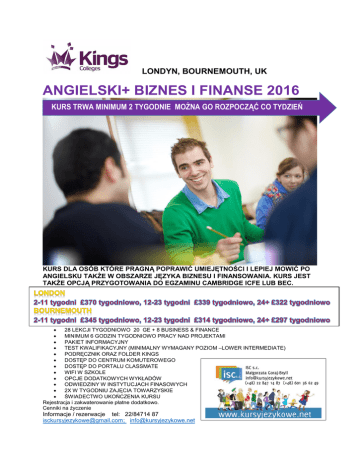 LONDYN, BOURNEMOUTH, UK ANGIELSKI+ BIZNES I FINANSE 2016 KURS TRWA MINIMUM 2 TYGODNIE MOŻNA GO ROZPOCZĄĆ CO TYDZIEŃ KURS DLA OSÓB KTÓRE PRAGNĄ POPRAWIĆ UMIEJĘTNOŚCI I LEPIEJ MOWIĆ PO ANGIELSKU TAKŻE W OBSZARZE JĘZYKA BIZNESU I FINANSOWANIA. KURS JEST TAKŻE OPCJĄ PRZYGOTOWANIA DO EGZAMINU CAMBRIDGE ICFE LUB BEC. 28 LEKCJI TYGODNIOWO 20 GE + 8 BUSINESS & FINANCE MINIMUM 6 GODZIN TYGODNIOWO PRACY NAD PROJEKTAMI PAKIET INFORMACYJNY TEST KWALIFIKACYJNY (MINIMALNY WYMAGANY POZIOM –LOWER INTERMEDIATE) PODRĘCZNIK ORAZ FOLDER KINGS DOSTĘP DO CENTRUM KOMUTEROWEGO DOSTĘP DO PORTALU CLASSMATE WIFI W SZKOLE OPCJE DODATKOWYCH WYKŁADÓW ODWIEDZINY W INSTYTUCJACH FINASOWYCH 2X W TYGODNIU ZAJĘCIA TOWARZYSKIE ŚWIADECTWO UKOŃCZENIA KURSU Rejestracja i zakwaterowanie płatne dodatkowo. Cenniki na życzenie Informacje / rezerwacje tel: 22/84714 87 [email protected]; [email protected]