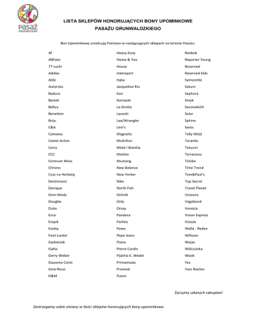 LISTA SKLEPÓW HONORUJĄCYCH BONY UPOMINKOWE PASAŻU GRUNWALDZKIEGO Bon Upominkowy zrealizują Państwo w następujących sklepach na terenie Pasażu: 4F Heavy Duty Reebok ABFoto Home & You Reporter Young 77 sushi House Reserved Adidas Intersport Reserved Kids Aldo Itaka Samsonite Autorska Jacqueline Riu Saturn Badura Kari Sephora Bartek Kornecki Smyk Bellux La Grotta Soczewki24 Benetton Lasocki Solar Briju Lee/Wrangler Sphinx C&A Levi’s Swiss Camaieu Magnetic Tally Weijl Camel Active McArthur Taranko Carry Miód i Wanilia Tatuum CCC Mohito Terranova Centrum Wina Mustang Tchibo Chrono New Balance Time Trend Czas na Herbatę New Yorker Tom&Paul’s Deichmann Nike Top Secret Denique North Fish Travel Planet Dom Mody Ochnik Unisono Douglas Only Vagabond Duka Orsay Venezia Ecco Pandora Vision Express Empik Parfois Vistula Esotiq Pawo Wella - Redox Foot Locker Pepe Jeans Willsoor Gadżeciak Piano Wojas Gatta Pierre Cardin Wólczanka Gerry Weber Pijalnia E. Wedel Wook Giacomo Conti Primamoda Yes Gino Rossi Promod Yves Rocher H&M Puere Życzymy udanych zakupów! Zastrzegamy sobie zmiany w ilości sklepów honorujących bony upominkowe.