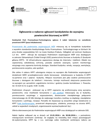 Ogłoszenie o naborze zgłoszeń kandydatów do wynajmu powierzchni biurowej w KPPT Kwidzyński Park Przemysłowo-Technologiczny ogłasza 4 nabór lokatorów na zasiedlenie przestrzeni KPPT (poza Inkubatorem). Przestrzenie dla podmiotów wspierających MŚP mieszczą się w kompleksie budynków o wysokim standardzie Kwidzyńskiego Parku Przemysłowo- Technologicznego w Górkach 3A przy drodze wojewódzkiej 521 na trasie Kwidzyn-Prabuty. Odległość od centrum Kwidzyna 1,5 km. KPPT oferuje do wynajęcia Podmiotom wspierającym MŚP oraz działającym w zakresie Odnawialnych Źródeł Energii (OZE) powierzchnie biurowe w budynku D (budynek główny KPPT). W infrastrukturze zapewniono dostęp do Internetu i telefonii. Obiekt ma zapewnioną całodobową ochronę, posiada zasilanie awaryjne, system monitoringu wizyjnego oraz zapewnia kontrolę dostępu. Standard budynku: windy, recepcja, wentylacja, pomieszczenia socjalne, sale spotkań. Dla celów 4 naboru KPPT udostępnia miejsca na wynajem dla Podmiotów wspierających działalność MŚP/ przedsiębiorczości około biznesowej zlokalizowane w budynku D KPPT na parterze oraz I piętrze budynku. Miejsce rozumiane jest jako osobne pomieszczenie biurowe z dostępem do telefonii i Internetu. Istnieje możliwość obejrzenia powierzchni na wynajem po uprzednim uzgodnieniu terminu i godziny (osoba kontaktowa: J. Piasecka, tel. 55 619 31 51 w godz. 9.00- 15.00). Podmiotom chcącym ulokować się w KPPT zapewnia się preferencyjną cenę wynajmu powierzchni, oraz możliwość korzystania z sali spotkań mieszczącej się w budynku, pomieszczenia socjalnego z wyposażeniem, dostarczanie nieodpłatnego połączenia internetowego do 20 Mb (dostęp do większego transferu możliwy za dopłatą), nieodpłatne korzystanie z parkingu, recepcji. Ponadto do dyspozycji są wszystkie usługi świadczone w KPPT (sale konferencyjne, przestrzeń ekspozycyjna, szkolenia, promocja na stronie KPPT, udział w wyjazdach studyjnych, organizowanie wystaw/wydarzeń itp.) Oferta skierowana jest do Podmiotów wspierających MŚP oraz działających w zakresie OZE. Nabór będzie odbywał się w dniach od 15.01.2016 r. do 30.06.2016 r., z pośrednimi, miesięcznymi terminami zamknięć. Ze względu na niewielką ilość miejsc pozostających do wykorzystania, KPPT Sp. z o.o. zastrzega sobie możliwość zamknięcia naboru po wyczerpaniu wolnych miejsc i podpisaniu Umów z Klientami. Zgłoszenia będą rejestrowane według kolejności ich przedłożenia i opatrywane datą oraz godziną wpływu do organizatora naboru, którym jest KPPT Sp. z o.o. Przyjmowanie zgłoszeń: Data rozpoczęcia: Data zakończenia: od 15.01.2016 godz. 08.00 do 30.06.2016 godz. 15.00 Podmioty zainteresowane wynajmem proszone są o wypełnienie zgłoszenia wraz z dołączeniem wymaganych oświadczeń i załączników wymienionych w Zgłoszeniu Kandydata. Całość dokumentów należy złożyć w sekretariacie KPPT, Górki 3A lub za pośrednictwem poczty elektronicznej na adres [email protected] Wszystkie zgłoszenia w ramach naboru będą rozpatrzone do dnia 30.06.2016 r., z uwzględnieniem terminów zamknięć pośrednich (miesięcznych). Zasady naboru zgłoszeń i ich procedowanie zgodnie z Regulaminem CEO. Zgłoszenia niepełne/ z błędami formalnymi nie będą rozpatrywane. CEO/Nabór4/styczeń2016/MW