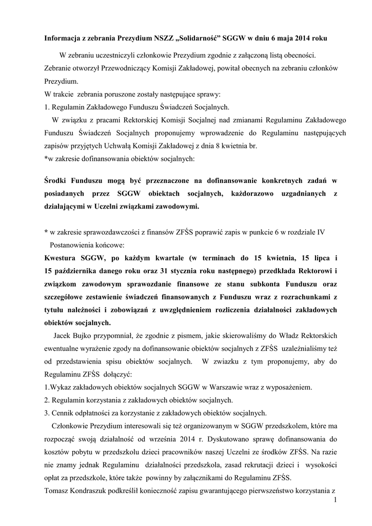 Informacja z zebrania Prezydium NSZZ „Solidarność” SGGW w dniu 6 maja 2014 roku W zebraniu uczestniczyli członkowie Prezydium zgodnie z załączoną listą obecności. Zebranie otworzył Przewodniczący Komisji Zakładowej, powitał obecnych na zebraniu członków Prezydium. W trakcie zebrania poruszone zostały następujące sprawy: 1. Regulamin Zakładowego Funduszu Świadczeń Socjalnych. W związku z pracami Rektorskiej Komisji Socjalnej nad zmianami Regulaminu Zakładowego Funduszu Świadczeń Socjalnych proponujemy wprowadzenie do Regulaminu następujących zapisów przyjętych Uchwałą Komisji Zakładowej z dnia 8 kwietnia br. *w zakresie dofinansowania obiektów socjalnych: Środki Funduszu mogą być przeznaczone na dofinansowanie konkretnych zadań w posiadanych przez SGGW obiektach socjalnych, każdorazowo uzgadnianych z działającymi w Uczelni związkami zawodowymi. * w zakresie sprawozdawczości z finansów ZFŚS poprawić zapis w punkcie 6 w rozdziale IV Postanowienia końcowe: Kwestura SGGW, po każdym kwartale (w terminach do 15 kwietnia, 15 lipca i 15 października danego roku oraz 31 stycznia roku następnego) przedkłada Rektorowi i związkom zawodowym sprawozdanie finansowe ze stanu subkonta Funduszu oraz szczegółowe zestawienie świadczeń finansowanych z Funduszu wraz z rozrachunkami z tytułu należności i zobowiązań z uwzględnieniem rozliczenia działalności zakładowych obiektów socjalnych. Jacek Bujko przypomniał, że zgodnie z pismem, jakie skierowaliśmy do Władz Rektorskich ewentualne wyrażenie zgody na dofinansowanie obiektów socjalnych z ZFŚS uzależnialiśmy też od przedstawienia spisu obiektów socjalnych. W zwiazku z tym proponujemy, aby do Regulaminu ZFŚS dołączyć: 1.Wykaz zakładowych obiektów socjalnych SGGW w Warszawie wraz z wyposażeniem. 2. Regulamin korzystania z zakładowych obiektów socjalnych. 3. Cennik odpłatności za korzystanie z zakładowych obiektów socjalnych. Członkowie Prezydium interesowali się też organizowanym w SGGW przedszkolem, które ma rozpocząć swoją działalność od września 2014 r. Dyskutowano sprawę dofinansowania do kosztów pobytu w przedszkolu dzieci pracowników naszej Uczelni ze środków ZFŚS. Na razie nie znamy jednak Regulaminu działalności przedszkola, zasad rekrutacji dzieci i wysokości opłat za przedszkole, które także powinny by załącznikami do Regulaminu ZFŚS. Tomasz Kondraszuk podkreślił konieczność zapisu gwarantującego pierwszeństwo korzystania z 1 przedszkola dzieciom pracowników SGGW. 2. Sprawy personalne na Wydziale Nauk o Żywieniu Człowieka i Konsumpcji. Maria Wesołowska poinformowała, że 7 maja br. odbędzie się kolejna rozprawa w sprawie o mobbing założonej przez prof. Bożenę Waszkiewicz-Robak. Świadkami przesłuchiwanymi w sprawie będą Maria Wesołowska i Elżbieta Biller. Przypomniała również o kontroli Państwowej Inspekcji Pracy prowadzonej na Wydziale Nauk o Żywieniu Człowieka i Konsumpcji w związku z możliwością zatrucia chemicznego pracowników Wydziału. Poinformowała o rozmowie telefonicznej z Inspektorem Pracy prowadzącym kontrolę. Pan Inspektor po wstępnym rozeznaniu sprawy zlecił przeprowadzenie szczegółowej kontroli laboratorium analiz chemicznych Sanepidowi i Nadzorowi budowlanemu. Kontrola jest aktualnie prowadzona. Po zakończeniu kontroli Inspektor przedstawi nam jej wyniki. Pan Inspektor stwierdził, również, że obecnie nie ma zagrożenia zdrowia pracowników Wydziału. Przeprowadzone pod koniec marca z inicjatywy Uczelni badania wody (badania mikrobiologiczne) i próbek z pokoju pracowniczego na zawartość substancji chemicznych (wykonane bez oznaczeń selenowodoru, tj. selenu) nie wykazały zagrożenia dla zdrowia, poprawiono doraźnie wentylację, zmieniono pokój pracownikowi i wstrzymano oznaczenia w laboratorium. Jacek Bujko poinformował o rozmowie z samodzielnym pracownikiem naukowo-dydaktycznym Wydziału i zgłoszeniu do Inspektoratu BHP naszej Uczelni sprawy zatrucia, związanego z miejscem pracy (pokój pracowniczy, w którym osoba pracuje znajduje się w dużej bliskości nad laboratorium, w którym prowadzone były analizy chemiczne). Bardzo złe samopoczucie i pogorszenie stanu zdrowia (7-krotne zatrucia ostre i trzymiesięczne zatrucie przewlekłe organizmu) osoba ta sygnalizowała od stycznia 2014. Jacek Bujko przedstawił też kopie pism innych pracowników Wydziału skierowanych do Inspektoratu BHP, w których zgłaszają podobne pogorszenie samopoczucia w analogicznym okresie. Pobyt w szpitalu wykluczył przyczyny nowotworowe i zaburzenia hormonalne, a dopiero badania wykonane osobistym staraniem w marcu 2014 wykazały znaczne przekroczenie w Jej organizmie dopuszczalnej dawki przede wszystkim selenu, jak też mniejsze narażenia na chrom i nikiel. Od tej pory, pomimo pism kierowanych przez Nią do Władz Uczelni nie podjęto żadnych działań związanych z przebadaniem organizmu w kierunku uszkodzenia narządów w wyniku zatrucia chemicznego w środowisku pracy, w tym nie podpisano umowy medycznej z wyspecjalizowanym ośrodkiem medycyny pracy, który mógłby takie analizy wykonać, aby stwierdzić stopień utraty zdrowia. Ponadto osoba poszkodowana odnosi wrażenie, że uczelnia nie chce uznać, że zatrucie miało miejsce w środowisku pracy. Dlatego też zwraca się do Komisji Zakładowej NSZZ „Solidarność” SGGW z prośbą o pomoc w zorganizowaniu przez Uczelnię objęcia Jej długotrwałą specjalistyczną opieką medyczną w tym przez Instytut Medycyny Pracy w Łodzi, gwarantującą profesjonalną diagnostykę toksykologiczną, 2 tym bardziej, że ostatnie wyniki badań wskazują na zaburzenia w funkcjonowaniu organizmu związane ze zmianami w narządach wewnętrznych (płuca, wątroba). Członkowie Komisji Zakładowej w dyskusji podkreślali konieczność udzielenia jak największego wsparcia i pomocy poszkodowanej osobie. Konieczne jest też przeprowadzenie facho
