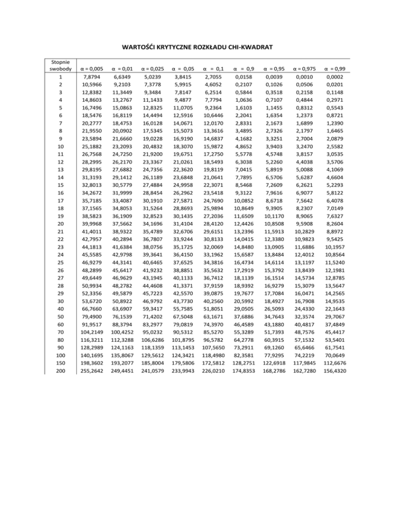 WARTOŚĆI KRYTYCZNE ROZKŁADU CHI-KWADRAT Stopnie swobody 1 2 3 4 5 6 7 8 9 10 11 12 13 14 15 16 17 18 19 20 21 22 23 24 25 26 27 28 29 30 40 50 60 70 80 90 100 150 200 α = 0,005 7,8794 10,5966 12,8382 14,8603 16,7496 18,5476 20,2777 21,9550 23,5894 25,1882 26,7568 28,2995 29,8195 31,3193 32,8013 34,2672 35,7185 37,1565 38,5823 39,9968 41,4011 42,7957 44,1813 45,5585 46,9279 48,2899 49,6449 50,9934 52,3356 53,6720 66,7660 79,4900 91,9517 104,2149 116,3211 128,2989 140,1695 198,3602 255,2642 α = 0,01 6,6349 9,2103 11,3449 13,2767 15,0863 16,8119 18,4753 20,0902 21,6660 23,2093 24,7250 26,2170 27,6882 29,1412 30,5779 31,9999 33,4087 34,8053 36,1909 37,5662 38,9322 40,2894 41,6384 42,9798 44,3141 45,6417 46,9629 48,2782 49,5879 50,8922 63,6907 76,1539 88,3794 100,4252 112,3288 124,1163 135,8067 193,2077 249,4451 α = 0,025 5,0239 7,3778 9,3484 11,1433 12,8325 14,4494 16,0128 17,5345 19,0228 20,4832 21,9200 23,3367 24,7356 26,1189 27,4884 28,8454 30,1910 31,5264 32,8523 34,1696 35,4789 36,7807 38,0756 39,3641 40,6465 41,9232 43,1945 44,4608 45,7223 46,9792 59,3417 71,4202 83,2977 95,0232 106,6286 118,1359 129,5612 185,8004 241,0579 α = 0,05 3,8415 5,9915 7,8147 9,4877 11,0705 12,5916 14,0671 15,5073 16,9190 18,3070 19,6751 21,0261 22,3620 23,6848 24,9958 26,2962 27,5871 28,8693 30,1435 31,4104 32,6706 33,9244 35,1725 36,4150 37,6525 38,8851 40,1133 41,3371 42,5570 43,7730 55,7585 67,5048 79,0819 90,5312 101,8795 113,1453 124,3421 179,5806 233,9943 α = 0,1 2,7055 4,6052 6,2514 7,7794 9,2364 10,6446 12,0170 13,3616 14,6837 15,9872 17,2750 18,5493 19,8119 21,0641 22,3071 23,5418 24,7690 25,9894 27,2036 28,4120 29,6151 30,8133 32,0069 33,1962 34,3816 35,5632 36,7412 37,9159 39,0875 40,2560 51,8051 63,1671 74,3970 85,5270 96,5782 107,5650 118,4980 172,5812 226,0210 α = 0,9 0,0158 0,2107 0,5844 1,0636 1,6103 2,2041 2,8331 3,4895 4,1682 4,8652 5,5778 6,3038 7,0415 7,7895 8,5468 9,3122 10,0852 10,8649 11,6509 12,4426 13,2396 14,0415 14,8480 15,6587 16,4734 17,2919 18,1139 18,9392 19,7677 20,5992 29,0505 37,6886 46,4589 55,3289 64,2778 73,2911 82,3581 128,2751 174,8353 α = 0,95 0,0039 0,1026 0,3518 0,7107 1,1455 1,6354 2,1673 2,7326 3,3251 3,9403 4,5748 5,2260 5,8919 6,5706 7,2609 7,9616 8,6718 9,3905 10,1170 10,8508 11,5913 12,3380 13,0905 13,8484 14,6114 15,3792 16,1514 16,9279 17,7084 18,4927 26,5093 34,7643 43,1880 51,7393 60,3915 69,1260 77,9295 122,6918 168,2786 α = 0,975 0,0010 0,0506 0,2158 0,4844 0,8312 1,2373 1,6899 2,1797 2,7004 3,2470 3,8157 4,4038 5,0088 5,6287 6,2621 6,9077 7,5642 8,2307 8,9065 9,5908 10,2829 10,9823 11,6886 12,4012 13,1197 13,8439 14,5734 15,3079 16,0471 16,7908 24,4330 32,3574 40,4817 48,7576 57,1532 65,6466 74,2219 117,9845 162,7280 α = 0,99 0,0002 0,0201 0,1148 0,2971 0,5543 0,8721 1,2390 1,6465 2,0879 2,5582 3,0535 3,5706 4,1069 4,6604 5,2293 5,8122 6,4078 7,0149 7,6327 8,2604 8,8972 9,5425 10,1957 10,8564 11,5240 12,1981 12,8785 13,5647 14,2565 14,9535 22,1643 29,7067 37,4849 45,4417 53,5401 61,7541 70,0649 112,6676 156,4320