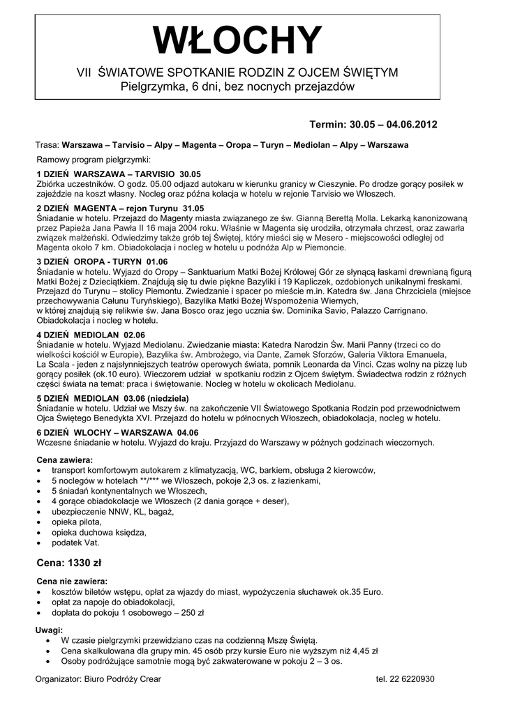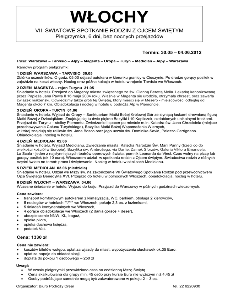 WŁOCHY VII ŚWIATOWE SPOTKANIE RODZIN Z OJCEM ŚWIĘTYM Pielgrzymka, 6 dni, bez nocnych przejazdów Termin: 30.05 – 04.06.2012 Trasa: Warszawa – Tarvisio – Alpy – Magenta – Oropa – Turyn – Mediolan – Alpy – Warszawa Ramowy program pielgrzymki: 1 DZIEŃ WARSZAWA – TARVISIO 30.05 Zbiórka uczestników. O godz. 05.00 odjazd autokaru w kierunku granicy w Cieszynie. Po drodze gorący posiłek w zajeździe na koszt własny. Nocleg oraz późna kolacja w hotelu w rejonie Tarvisio we Włoszech. 2 DZIEŃ MAGENTA – rejon Turynu 31.05 Śniadanie w hotelu. Przejazd do Magenty miasta związanego ze św. Gianną Berettą Molla. Lekarką kanonizowaną przez Papieża Jana Pawła II 16 maja 2004 roku. Właśnie w Magenta się urodziła, otrzymała chrzest, oraz zawarła związek małżeński. Odwiedzimy także grób tej Świętej, który mieści się w Mesero - miejscowości odległej od Magenta około 7 km. Obiadokolacja i nocleg w hotelu u podnóża Alp w Piemoncie. 3 DZIEŃ OROPA - TURYN 01.06 Śniadanie w hotelu. Wyjazd do Oropy – Sanktuarium Matki Bożej Królowej Gór ze słynącą łaskami drewnianą figurą Matki Bożej z Dzieciątkiem. Znajdują się tu dwie piękne Bazyliki i 19 Kapliczek, ozdobionych unikalnymi freskami. Przejazd do Turynu – stolicy Piemontu. Zwiedzanie i spacer po mieście m.in. Katedra św. Jana Chrzciciela (miejsce przechowywania Całunu Turyńskiego), Bazylika Matki Bożej Wspomożenia Wiernych, w której znajdują się relikwie św. Jana Bosco oraz jego ucznia św. Dominika Savio, Palazzo Carrignano. Obiadokolacja i nocleg w hotelu. 4 DZIEŃ MEDIOLAN 02.06 Śniadanie w hotelu. Wyjazd Mediolanu. Zwiedzanie miasta: Katedra Narodzin Św. Marii Panny (trzeci co do wielkości kościół w Europie), Bazylika św. Ambrożego, via Dante, Zamek Sforzów, Galeria Viktora Emanuela, La Scala - jeden z najsłynniejszych teatrów operowych świata, pomnik Leonarda da Vinci. Czas wolny na pizzę lub gorący posiłek (ok.10 euro). Wieczorem udział w spotkaniu rodzin z Ojcem świętym. Świadectwa rodzin z różnych części świata na temat: praca i świętowanie. Nocleg w hotelu w okolicach Mediolanu. 5 DZIEŃ MEDIOLAN 03.06 (niedziela) Śniadanie w hotelu. Udział we Mszy św. na zakończenie VII Światowego Spotkania Rodzin pod przewodnictwem Ojca Świętego Benedykta XVI. Przejazd do hotelu w północnych Włoszech, obiadokolacja, nocleg w hotelu. 6 DZIEŃ WLOCHY – WARSZAWA 04.06 Wczesne śniadanie w hotelu. Wyjazd do kraju. Przyjazd do Warszawy w późnych godzinach wieczornych. Cena zawiera: transport komfortowym autokarem z klimatyzacją, WC, barkiem, obsługa 2 kierowców, 5 noclegów w hotelach **/*** we Włoszech, pokoje 2,3 os. z łazienkami, 5 śniadań kontynentalnych we Włoszech, 4 gorące obiadokolacje we Włoszech (2 dania gorące + deser), ubezpieczenie NNW, KL, bagaż, opieka pilota, opieka duchowa księdza, podatek Vat. Cena: 1330 zł Cena nie zawiera: kosztów biletów wstępu, opłat za wjazdy do miast, wypożyczenia słuchawek ok.35 Euro. opłat za napoje do obiadokolacji, dopłata do pokoju 1 osobowego – 250 zł Uwagi: W czasie pielgrzymki przewidziano czas na codzienną Mszę Świętą. Cena skalkulowana dla grupy min. 45 osób przy kursie Euro nie wyższym niż 4,45 zł Osoby podróżujące samotnie mogą być zakwaterowane w pokoju 2 – 3 os. Organizator: Biuro Podróży Crear tel. 22 6220930 Kawa i herbata w autokarze płatne na całej trasie w złotówkach. Większość hoteli we Włoszech serwuje tzw. śniadania kontynentalne składające się z: pieczywa, masła, miodu, dżemu, kawy, herbaty. Obiadokolacja to 2 dania gorące + deser. Napoje do obiadokolacji płatne dodatkowo. Uwaga ! Zarejestrowany pogram autorski. Biuro Podróży Crear Sp. z o.o ul. Wilcza 62, 00-679 Warszawa tel. 22 6220930 Organizator: Biuro Podróży Crear tel. 22 6220930
