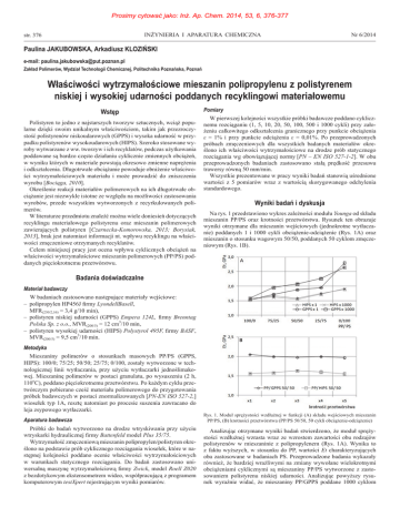 Prosimy cytować jako: Inż. Ap. Chem. 2014, 53, 6, 376-377 INŻYNIERIA I APARATURA CHEMICZNA str. 376 Nr 6/2014 Paulina JAKUBOWSKA, Arkadiusz KLOZIŃSKI e-mail: [email protected] Zakład Polimerów, Wydział Technologii Chemicznej, Politechnika Poznańska, Poznań Właściwości wytrzymałościowe mieszanin polipropylenu z polistyrenem niskiej i wysokiej udarności poddanych recyklingowi materiałowemu Wstęp Polistyren to jedno z najstarszych tworzyw sztucznych, wciąż popularne dzięki swoim unikalnym właściwościom, takim jak przezroczystość polistyrenów niskoudarowych (GPPS) i wysoka udarność w przypadku polistyrenów wysokoudarowych (HIPS). Szeroko stosowane wyroby wytwarzane z ww. tworzyw i ich recyklatów, podczas użytkowania poddawane są bardzo często działaniu cyklicznie zmiennych obciążeń, w wyniku których w materiale powstają okresowo zmienne naprężenia i odkształcenia. Długotrwałe obciążanie powoduje obniżenie właściwości wytrzymałościowych materiału i może prowadzić do zniszczenia wyrobu [Bociąga, 2010]. Określenie reakcji materiałów polimerowych na ich długotrwałe obciążanie jest niezwykle istotne ze względu na możliwości zastosowania wyrobów, przede wszystkim wytworzonych z recyrkulowanych polimerów. W literaturze przedmiotu znaleźć można wiele doniesień dotyczących recyklingu materiałowego polistyrenu oraz mieszanin polimerowych zawierających polistyren [Czarnecka-Komorowska, 2013; Borysiak, 2013], brak jest natomiast informacji nt. wpływu recyklingu na właściwości zmęczeniowe otrzymanych recyklatów. Celem niniejszej pracy jest ocena wpływu cyklicznych obciążeń na właściwości wytrzymałościowe mieszanin polimerowych (PP/PS) poddanych pięciokrotnemu przetwórstwu. Pomiary W pierwszej kolejności wszystkie próbki badawcze poddano cyklicznemu rozciąganiu (1, 5, 10, 20, 50, 100, 500 i 1000 cykli) przy założeniu całkowitego odkształcenia granicznego przy punkcie obciążenia ε = 1% i przy punkcie odciążenia ε = 0,01%. Po przeprowadzonych próbach zmęczeniowych dla wszystkich badanych materiałów określono ich właściwości wytrzymałościowe na drodze prób statycznego rozciągania wg obowiązującej normy [PN – EN ISO 527-1-2]. W obu przeprowadzonych badaniach zastosowano stałą prędkość przesuwu trawersy równą 50 mm/min. Wszystkie prezentowane w pracy wyniki badań stanowią uśrednione wartości z 5 pomiarów wraz z wartością skorygowanego odchylenia standardowego. Wyniki badań i dyskusja Na rys. 1 przedstawiono wykres zależności modułu Younga od składu mieszanin PP/PS oraz krotności przetwórstwa. Rysunek ten obrazuje wyniki otrzymane dla mieszanin wejściowych (jednokrotne wytłaczanie) poddanych 1 i 1000 cykli obciążenie-odciążenie (Rys. 1A) oraz mieszanin o stosunku wagowym 50/50, poddanych 50 cyklom zmęczeniowym (Rys. 1B). Badania doświadczalne Materiał badawczy W badaniach zastosowano następujące materiały wejściowe: – polipropylen HP456J firmy LyondellBasell, MFR(230/2,16) = 3,4 g/10 min), – polistyren niskiej udarności (GPPS) Empera 124L, firmy Brenntag Polska Sp. z o.o., MVR(200/5) = 12 cm3/10 min, – polistyren wysokiej udarności (HIPS) Polystyrol 495F, firmy BASF, MVR(200/5) = 9,5 cm3/10 min. Metodyka Mieszaniny polimerów o stosunkach masowych PP/PS (GPPS, HIPS): 100/0; 75/25; 50/50; 25/75; 0/100, zostały wytworzone w technologicznej linii wytłaczania, przy użyciu wytłaczarki jednoślimakowej. Mieszaninę polimerów w postaci granulatu, po wysuszeniu (2 h, 110oC), poddano pięciokrotnemu przetwórstwu. Po każdym cyklu przetwórczym pobierano cześć materiału polimerowego do przygotowania próbek badawczych w postaci znormalizowanych [PN-EN ISO 527-2,] wiosełek typ 1A, resztę natomiast po procesie suszenia zawracano do leja zsypowego wytłaczarki. Aparatura badawcza Rys. 1. Moduł sprężystości wzdłużnej w funkcji (A) składu wejściowych mieszanin PP/PS, (B) krotności przetwórstwa (PP/PS 50/50, 50 cykli obciążenie-odciążenie) Próbki do badań wytworzono na drodze wtryskiwania przy użyciu wtryskarki hydraulicznej firmy Battenfeld model Plus 35/75. Wytrzymałość zmęczeniową mieszanin polipropylen/polistyren określono na podstawie prób cyklicznego rozciągania wiosełek, które w następnej kolejności poddano ocenie właściwości wytrzymałościowych w warunkach statycznego rozciągania. Do badań zastosowano uniwersalną maszynę wytrzymałościową firmy Zwick, model Roell Z020 z bezdotykowym ekstensometrem wideo, współpracującą z programem komputerowym testXpert rejestrującym wyniki pomiarów. Analizując otrzymane wyniki badań stwierdzono, że moduł sprężystości wzdłużnej wzrasta wraz ze wzrostem zawartości obu rodzajów polistyrenów w mieszaninie z polipropylenem (Rys. 1A). Wynika to z faktu wyższych, w stosunku do PP, wartości Et charakteryzujących oba zastosowane w badaniach PS. Przeprowadzone badania wykazały również, że bardziej wrażliwymi na zmiany wywołane wielokrotnymi obciążeniami cyklicznymi są mieszaniny PP/PS wytworzone z zastosowaniem polistyrenu niskiej udarności. Analizując powyższy rysunek wyraźnie widać, że mieszaniny PP/GPPS poddane 1000 cyklom Prosimy cytować jako: Inż. Ap. Chem. 2014, 53, 6, 376-377 Nr 6/2014 INŻYNIERIA I APARATURA CHEMICZNA zmęczeniowym charakteryzują się wyższym modułem sprężystości wzdłużnej (o ok. 14%) w porównaniu z analogicznymi mieszaninami poddanymi tylko 1 cyklowi obciążenie-odciążenie. Otrzymana zależność wskazuje zatem, że w wyniku wielokrotnego obciążenia wyrobów wytworzonych z mieszanin PP/GPPS dochodzi do ich wzmocnienia, co z aplikacyjnego punktu widzenia, stanowi pozytywny wynik. Zmian modułu Younga w funkcji ilości cykli zmęczeniowych nie zarejestrowano natomiast dla mieszanin zawierających polistyren wysokiej udarności. Odnotowane wartości Et dla mieszanin PP/HIPS, niezależnie od ilości zastosowanych