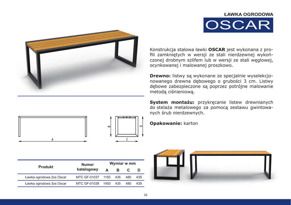 àDZNDRJURGRZD0LUD ŁAWKA OGRODOWA ' % OSCAR $ Konstrukcja stalowa ławki OSCAR jest wykonana z profili zamkniętych w wersji ze stali nierdzewnej wykończonej drobnym szlifem lub w wersji ze stali węglowej, ocynkowanej i malowanej proszkowo. & àDZNDRJURGRZD2OLYLHUR ' % Drewno: listwy są wykonane ze specjalnie wyselekcjonowanego drewna dębowego o grubości 3 cm. Listwy dębowe zabezpieczone są poprzez potrójne malowanie metodą ciśnieniową. $ System montażu: przykręcanie listew drewnianych do stelaża metalowego za pomocą zestawu gwintowanych śrub nierdzewnych. & àDZNDRJURGRZD2VFDU, % ' Opakowanie: karton $ & Numer katalogowy Ławka ogrodowa 2os Oscar Ławka ogrodowa $ 3os Oscar àDZNDRJURGRZD:HJD Wymiar w mm % Produkt A B MTC GF-01037 1150 435 MTC GF-01038 1450 435 ' àDZNDRJURGRZD2VFDU,, C D 480 435 & 480 435 16