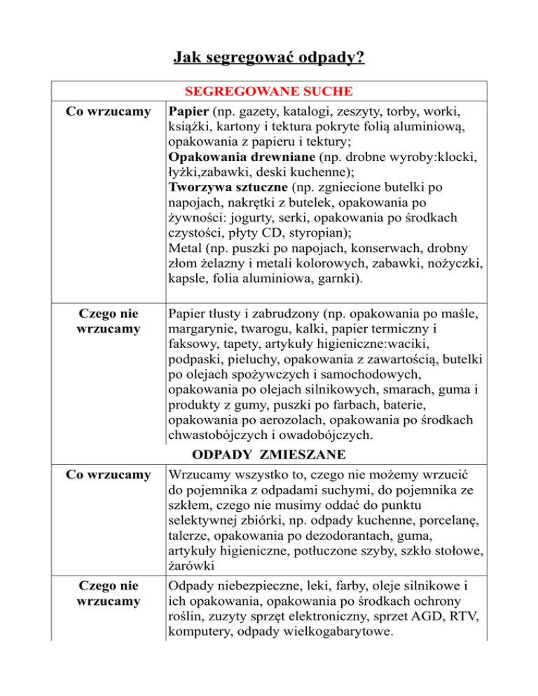 Jak segregować odpady? Co wrzucamy Czego nie wrzucamy Co wrzucamy Czego nie wrzucamy SEGREGOWANE SUCHE Papier (np. gazety, katalogi, zeszyty, torby, worki, książki, kartony i tektura pokryte folią aluminiową, opakowania z papieru i tektury; Opakowania drewniane (np. drobne wyroby:klocki, łyżki,zabawki, deski kuchenne); Tworzywa sztuczne (np. zgniecione butelki po napojach, nakrętki z butelek, opakowania po żywności: jogurty, serki, opakowania po środkach czystości, płyty CD, styropian); Metal (np. puszki po napojach, konserwach, drobny złom żelazny i metali kolorowych, zabawki, nożyczki, kapsle, folia aluminiowa, garnki). Papier tłusty i zabrudzony (np. opakowania po maśle, margarynie, twarogu, kalki, papier termiczny i faksowy, tapety, artykuły higieniczne:waciki, podpaski, pieluchy, opakowania z zawartością, butelki po olejach spożywczych i samochodowych, opakowania po olejach silnikowych, smarach, guma i produkty z gumy, puszki po farbach, baterie, opakowania po aerozolach, opakowania po środkach chwastobójczych i owadobójczych. ODPADY ZMIESZANE Wrzucamy wszystko to, czego nie możemy wrzucić do pojemnika z odpadami suchymi, do pojemnika ze szkłem, czego nie musimy oddać do punktu selektywnej zbiórki, np. odpady kuchenne, porcelanę, talerze, opakowania po dezodorantach, guma, artykuły higieniczne, potłuczone szyby, szkło stołowe, żarówki Odpady niebezpieczne, leki, farby, oleje silnikowe i ich opakowania, opakowania po środkach ochrony roślin, zuzyty sprzęt elektroniczny, sprzet AGD, RTV, komputery, odpady wielkogabarytowe. ODPADY WIELKOGABARYTOWE Co wrzucamy Meble (np. stoły, krzesła, szafy, kanapy) Sprzęt domowy (np. dywany, wózki dziecięce, materace, rowery, zabawki dużych rozmiarów, duże szyby, lustra Czego nie Materiały i odpady budowlane, remontowe, sanitarne, wrzucamy deski drewniane, panele, ramy okienne, drzwi, płoty, wanny, umywalki, muszle toaletowe, spłuczki, grzejniki, płytki, rolety, części samochodowe, motorowery, kosiarki, odpady ogrodowe. SZKŁO OPAKOWANIOWE Co wrzucamy Szklane opakowania (np. butelki i słoiki po napojach, żywności, kosmetykach) Czego nie Żarówki, lampy neonowe, fluorescencyjne i rtęciowe, wrzucamy termometry rtęciowe, reflektory, szkło stołowe, okularowe, żaroodporne, ekrany i lampy telewizyjne, lustra, szyby samochodowe i okienne, porcelana i ceramika, doniczki. Więcej informacji: www.czysta.um.warszawa.pl