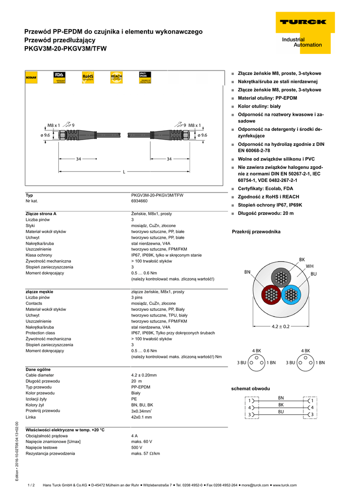 Przewód PP-EPDM do czujnika i elementu wykonawczego Przewód przedłużający PKGV3M-20-PKGV3M/TFW ■ Złącze żeńskie M8, proste, 3-stykowe ■ Nakrętka/śruba ze stali nierdzewnej ■ Złącze żeńskie M8, proste, 3-stykowe ■ Materiał otuliny: PP-EPDM ■ Kolor otuliny: biały ■ Odporność na roztwory kwasowe i zasadowe ■ Odporność na detergenty i środki dezynfekujące ■ Odporność na hydrolizę zgodnie z DIN EN 60068-2-78 ■ Wolne od związków silikonu i PVC ■ Nie zawiera związków halogenu zgodnie z normami DIN EN 50267-2-1, IEC 60754-1, VDE 0482-267-2-1 ■ Certyfikaty: Ecolab, FDA Typ Nr kat. PKGV3M-20-PKGV3M/TFW 6934660 ■ Zgodność z RoHS i REACH Złącze strona A Liczba pinów Styki Materiał wokół styków Uchwyt Nakrętka/śruba Uszczelnienie Klasa ochrony Żywotność mechaniczna Stopień zanieczyszczenia Moment dokręcający Żeńskie, M8x1, prosty 3 mosiądz, CuZn, złocone tworzywo sztuczne, PP, białe tworzywo sztuczne, PP, białe stal nierdzewna, V4A tworzywo sztuczne, FPM/FKM IP67, IP69K, tylko w skręconym stanie > 100 trwałość styków 3 0.5 … 0.6 Nm (należy kontrolować maks. zliczoną wartość!) ■ Długość przewodu: 20 m złącze męskie Liczba pinów Contacts Materiał wokół styków Uchwyt Uszczelnienie Nakrętka/śruba Protection class Żywotność mechaniczna Stopień zanieczyszczenia Moment dokręcający złącze żeńskie, M8x1, prosty 3 pins mosiądz, CuZn, złocone tworzywo sztuczne, PP, Biały tworzywo sztuczne, TPU, biały tworzywo sztuczne, FPM/FKM stal nierdzewna, V4A IP67, IP69K, Tylko przy dokręconych śrubach > 100 trwałość styków 3 0.5 … 0.6 Nm (należy kontrolować maks. zliczoną wartość!) Nm Edition • 2016-10-02T08:04:13+02:00 Dane ogólne Cable diameter Długość przewodu Typ przewodu Kolor przewodu Izolacji żyły Kolory żył Przekrój przewodu 4.2 ± 0.20mm 20 m PP-EPDM Biały PE BN, BU, BK Linka 3x0.34mm 42x0.1 mm Właściwości elektryczne w temp. +20 °C Obciążalność prądowa Napięcie znamionowe [Umax] Napięcie testowe Rezystancja przewodzenia 4A maks. 60 V 500 V maks. 57 ò/km 1/2 ■ Stopień ochrony IP67, IP69K Przekrój przewodnika schemat obwodu 2 Hans Turck GmbH & Co.KG ñ D-45472 Mülheim an der Ruhr ñ Witzlebenstraße 7 ñ Tel. 0208 4952-0 ñ Fax 0208 4952-264 ñ [email protected] ñ www.turck.com Przewód PP-EPDM do czujnika i elementu wykonawczego Przewód przedłużający PKGV3M-20-PKGV3M/TFW >5xØ > 10 x Ø -40…+105°C 0 …+80°C Edition • 2016-10-02T08:04:13+02:00 Właściwości chemiczne i mechaniczne Kąt gięcia (stan stacjonarny) Kąt gięcia (elastyczność) Temperatura pracy stacjonarna aplikacja ruchoma 2/2 Hans Turck GmbH & Co.KG ñ D-45472 Mülheim an der Ruhr ñ Witzlebenstraße 7 ñ Tel. 0208 4952-0 ñ Fax 0208 4952-264 ñ [email protected] ñ www.turck.com