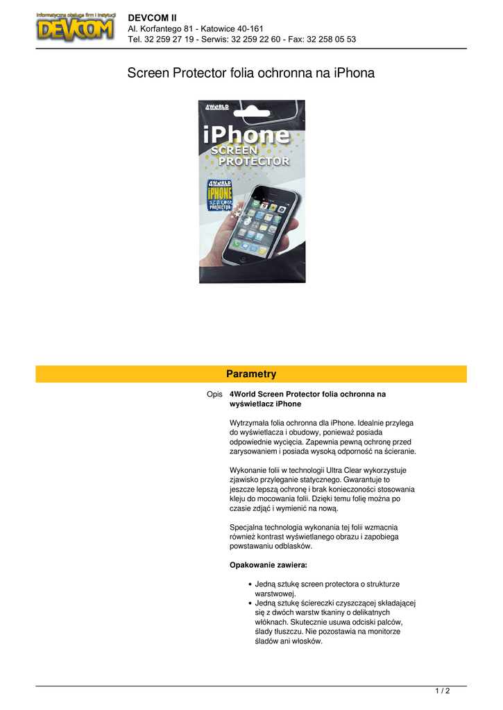 DEVCOM II Al. Korfantego 81 - Katowice 40-161 Tel. 32 259 27 19 - Serwis: 32 259 22 60 - Fax: 32 258 05 53 Screen Protector folia ochronna na iPhona Parametry Opis 4World Screen Protector folia ochronna na wyświetlacz iPhone Wytrzymała folia ochronna dla iPhone. Idealnie przylega do wyświetlacza i obudowy, ponieważ posiada odpowiednie wycięcia. Zapewnia pewną ochronę przed zarysowaniem i posiada wysoką odporność na ścieranie. Wykonanie folii w technologii Ultra Clear wykorzystuje zjawisko przyleganie statycznego. Gwarantuje to jeszcze lepszą ochronę i brak konieczoności stosowania kleju do mocowania folii. Dzięki temu folię można po czasie zdjąć i wymienić na nową. Specjalna technologia wykonania tej folii wzmacnia również kontrast wyświetlanego obrazu i zapobiega powstawaniu odblasków. Opakowanie zawiera: Jedną sztukę screen protectora o strukturze warstwowej. Jedną sztukę ściereczki czyszczącej składającej się z dwóch warstw tkaniny o delikatnych włóknach. Skutecznie usuwa odciski palców, ślady tłuszczu. Nie pozostawia na monitorze śladów ani włosków. 1/2 DEVCOM II Al. Korfantego 81 - Katowice 40-161 Tel. 32 259 27 19 - Serwis: 32 259 22 60 - Fax: 32 258 05 53 Jedną sztukę karty o miękkiej strukturze. Każdy z jej rogów ma inny kąt, co pozwala skutecznie dopasować ją do każdego wyświetlacza. 2/2 Powered by TCPDF (www.tcpdf.org)