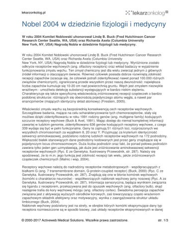lekarzonkolog.pl Nobel 2004 w dziedzinie fizjologii i medycyny W roku 2004 Komitet Noblowski uhonorował Lindę B. Buck (Fred Hutchinson Cancer Research Center Seattle, WA, USA) oraz Richarda Axela (Columbia University New York, NY, USA) Nagrodą Nobla w dziedzinie fizjologii lub medycyny. W roku 2004 Komitet Noblowski uhonorował Lindę B. Buck (Fred Hutchinson Cancer Research Center Seattle, WA, USA) oraz Richarda Axela (Columbia University New York, NY, USA) Nagrodą Nobla w dziedzinie fizjologii lub medycyny. Wyróżnione zostało odkrycie receptorów węchowych (ang. olfactory receptors) oraz wkład badaczy w wyjaśnienie funkcjonowania zmysłu węchu. Ten zmysł chemiczny jest dla wielu zwierząt jednym z głównych źródeł informacji o otaczającym świecie. Również człowiek posiada dobrze rozwiniętą zdolność recepcji zapachów (szacuje się, że człowiek potrafi zidentyfikować nawet ponad 100.000 różnych związków chemicznych), ograniczaną przede wszystkim przez naszą dwunożność: największa liczba zapachów kumuluje się 10-20 cm nad powierzchnią gruntu. Węch jest zmysłem niezwykle wrażliwym - umożliwia detekcję substancji występujących w bardzo niskim stężeniu. Charakteryzuje się także specyficzną właściwością zróżnicowanej recepcji cząsteczek o bardzo podobnej strukturze: różniących się obecnością pojedynczego atomu węgla, a nawet par enancjomerów (mających identyczny skład atomowy) (Firestein, 2005). Właściwości zmysłu węchu są bezpośrednią konsekwencją cech receptorów węchowych. Szczegółowe badania, mające na celu scharakteryzowanie tych chemoreceptorów, stały się możliwe dzięki zidentyfikowaniu w roku 1991 rodziny genów (ang. multigene family) kodujących szczurze receptory węchowe (Buck & Axel, 1991). Mając dostęp do niemal kompletnej informacji zawartej w ludzkim genomie, zidentyfikowano 636 genów kodujących receptory węchowe, z czego 339 wydaje się być w pełni funkcjonalne. Geny te zajmują 51 różnych loci, rozproszonych we wszystkich chromosomach za wyjątkiem 8, 20 oraz Y. Przyjmując za kryterium identyczność sekwencji aminokwasowej, podzielono rodzinę ludzkich receptorów węchowych na 172 podrodziny. Większość białek stanowiących dane podrodziny kodowanych jest przez geny znajdujące się w pojedynczym locus chromosomowym. Duża liczba podrodzin oraz fakt, że ponad połowa podrodzin zawiera tylko jeden gen uzmysławiają, jak duże jest zróżnicowanie aminokwasowej sekwencji receptorów węchowych (Ryc. E ze Genetyka. Ilustrowany Przewodnik, str. 287). Należy się spodziewać, że to m.in. jego funkcją jest zdolność recepcji tak wielu, jakże zróżnicowanych cząsteczek chemicznych (Malnic i wsp, 2004). Receptory węchowe należą do nadrodziny receptorów metabotropowych - współpracujących z białkami G (ang. 7 transmembrane domain, G-protein-coupled receptor) (Buck, 2000) (Ryc. C ze Genetyka. Ilustrowany Przewodnik, str. 287). Znajdują się one w błonie komórek węchowych (komórki o charakterze neuronów) - współtworzących nabłonek węchowy jamy nosowej (Ryc. A ze Genetyka. Ilustrowany Przewodnik, str. 287). Informacja sensoryczna, będąca wynikiem związania się ligandu z receptorem, przekazywana jest do opuszek węchowych (ang. olfactory bulb), skąd następnie trafia do kory węchowej mózgu (ang. olfactory cortex). Świadoma percepcja zapachów związana jest z aktywacją wyższych ośrodków korowych, zaś towarzyszący często wrażeniom zapachowym składnik afektywny oraz motywacyjny, wynika z zaangażowania struktur układu limbicznego (Buck, 2004). Nabłonek węchowy podzielony jest na strefy, w obrębie których komórki eksprymujące dany typ receptora rozmieszczone są w sposób losowy, zaś układy receptorów eksprymowanych w danej © 2000-2017 Activeweb Medical Solutions. Wszelkie prawa zastrzeżone. str. 1/3 lekarzonkolog.pl strefie nie zachodzą na siebie (Ressler i wsp., 1993). Ekspresja genów kodujących receptory węchowe ma charakter monogenowy (jedna komórka węchowa-jeden typ receptora) oraz monoalleliczny (tylko jeden z alleli kodujących dany typ receptora ulega ekspresji w pojedynczej komórce węchowej) (Mombaerts, 2004). Recepcja określonego zapachu polega na pobudzeniu aktywności komórek węchowych w ich specyficznych kombinacjach. Określoną kombinację (układ) tworzy zdefiniowany zbiór komórek węchowych, z których każda eksprymuje tylko jeden, odrębny typ receptora węchowego. Określony związek chemiczny może być związany przez więcej, niż jeden receptor oraz dany receptor wiąże więcej, niż jeden ligand. Te zachodzące na siebie zbiory mogą tworzyć, w zasadzie nieskończoną, ilość kombinacji. Przekłada się to z kolei na ogromną liczbę zapachów, które potencjalnie mogą ulegać wykrywaniu (Firestein, 2005). Komórki węchowe projektują aksony do opuszki węchowej. W regionach oddziaływań z komórkami opuszki powstają tzw. kłębuszki węchowe (ang. glomerulus). Wydaje się, że każdy kłębuszek ,,zbiera" informację czuciową z receptorów węchowych określonego typu (tzw. osmatyczna organizacja opuszki węchowej). W ten sposób dochodzi do swego rodzaju segregacji pobudzeń, mających swe źródło w komórkach węchowych eksprymujących receptor określonego typu. ,,Kodowanie" zapachu zostaje więc przeniesione z poziomu kombinacji receptorów węchowych, na poziom specyficznego układu kłębuszków węchowych. Prawdopodobnie kodowanie zapachów w obszarach korowych ma inny charakter. Informacja sensoryczna, której źródłem są receptory węchowe danego typu, trafia ostatecznie do luźnych skupisk neuronów, w kilku odrębnych obszarach kory mózgowej. Tak więc, informacja zapachowa jest przestrzennie porządkowana w obrębie opuszki węchowej (kłębuszki węchowe), zaś uporządkowanie to nie dotyczy już obszarów korowych. Ponadto, o ile aktywność neuronów nabłonka węchow