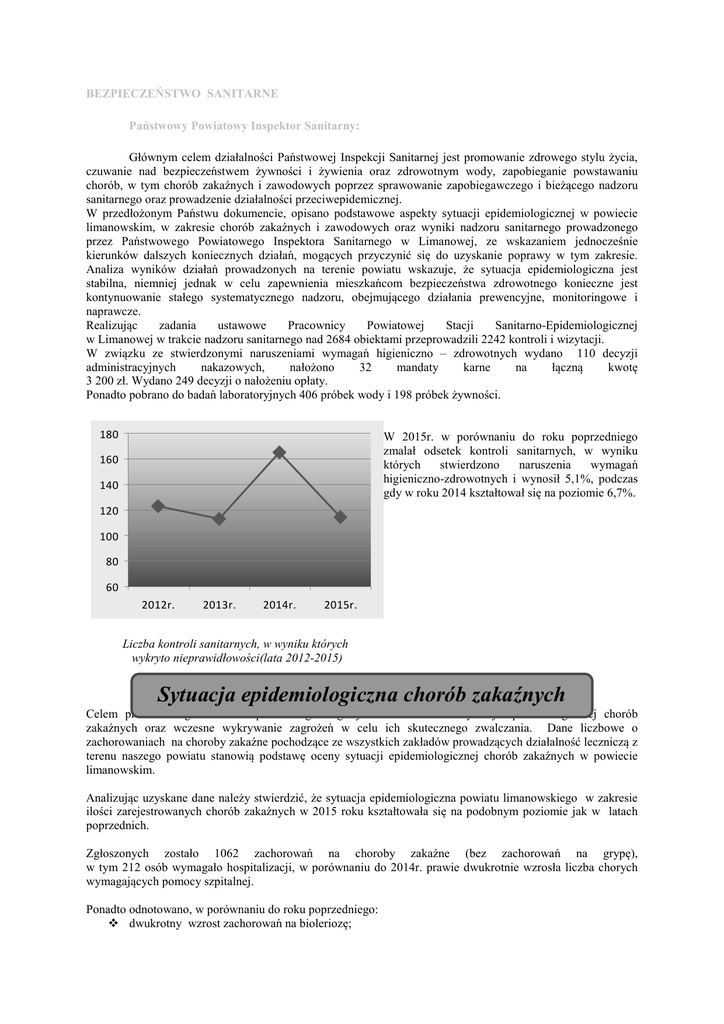 BEZPIECZEŃSTWO SANITARNE Państwowy Powiatowy Inspektor Sanitarny: Głównym celem działalności Państwowej Inspekcji Sanitarnej jest promowanie zdrowego stylu życia, czuwanie nad bezpieczeństwem żywności i żywienia oraz zdrowotnym wody, zapobieganie powstawaniu chorób, w tym chorób zakaźnych i zawodowych poprzez sprawowanie zapobiegawczego i bieżącego nadzoru sanitarnego oraz prowadzenie działalności przeciwepidemicznej. W przedłożonym Państwu dokumencie, opisano podstawowe aspekty sytuacji epidemiologicznej w powiecie limanowskim, w zakresie chorób zakaźnych i zawodowych oraz wyniki nadzoru sanitarnego prowadzonego przez Państwowego Powiatowego Inspektora Sanitarnego w Limanowej, ze wskazaniem jednocześnie kierunków dalszych koniecznych działań, mogących przyczynić się do uzyskanie poprawy w tym zakresie. Analiza wyników działań prowadzonych na terenie powiatu wskazuje, że sytuacja epidemiologiczna jest stabilna, niemniej jednak w celu zapewnienia mieszkańcom bezpieczeństwa zdrowotnego konieczne jest kontynuowanie stałego systematycznego nadzoru, obejmującego działania prewencyjne, monitoringowe i naprawcze. Realizując zadania ustawowe Pracownicy Powiatowej Stacji Sanitarno-Epidemiologicznej w Limanowej w trakcie nadzoru sanitarnego nad 2684 obiektami przeprowadzili 2242 kontroli i wizytacji. W związku ze stwierdzonymi naruszeniami wymagań higieniczno – zdrowotnych wydano 110 decyzji administracyjnych nakazowych, nałożono 32 mandaty karne na łączną kwotę 3 200 zł. Wydano 249 decyzji o nałożeniu opłaty. Ponadto pobrano do badań laboratoryjnych 406 próbek wody i 198 próbek żywności. 180 W 2015r. w porównaniu do roku poprzedniego zmalał odsetek kontroli sanitarnych, w wyniku których stwierdzono naruszenia wymagań higieniczno-zdrowotnych i wynosił 5,1%, podczas gdy w roku 2014 kształtował się na poziomie 6,7%. 160 140 120 100 80 60 2012r. 2013r. 2014r. 2015r. Liczba kontroli sanitarnych, w wyniku których wykryto nieprawidłowości(lata 2012-2015) Sytuacja epidemiologiczna chorób zakaźnych Celem prowadzonego nadzoru epidemiologicznego jest monitorowanie sytuacji epidemiologicznej chorób zakaźnych oraz wczesne wykrywanie zagrożeń w celu ich skutecznego zwalczania. Dane liczbowe o zachorowaniach na choroby zakaźne pochodzące ze wszystkich zakładów prowadzących działalność leczniczą z terenu naszego powiatu stanowią podstawę oceny sytuacji epidemiologicznej chorób zakaźnych w powiecie limanowskim. Analizując uzyskane dane należy stwierdzić, że sytuacja epidemiologiczna powiatu limanowskiego w zakresie ilości zarejestrowanych chorób zakaźnych w 2015 roku kształtowała się na podobnym poziomie jak w latach poprzednich. Zgłoszonych zostało 1062 zachorowań na choroby zakaźne (bez zachorowań na grypę), w tym 212 osób wymagało hospitalizacji, w porównaniu do 2014r. prawie dwukrotnie wzrosła liczba chorych wymagających pomocy szpitalnej. Ponadto odnotowano, w porównaniu do roku poprzedniego: dwukrotny wzrost zachorowań na bioleriozę; prawie trzykrotnie więcej biegunek u dzieci do lat 2-ch. znaczny spadek zachorowań na różyczkę trzykrotny spadek zachorowań na ospę wietrzną. Zarówno w 2015 jak i 2014r nie odnotowano ani jednego zachorowania na odrę, korzystna jest też sytuacja zachorowań na świnkę ( nagminne zapalenie przyusznic)gdyż od dwóch lat utrzymuje się na tym samym poziomie – zgłoszono tylko 2 zachorowania. Zarejestrowano natomiast w 2015r. aż 9 przypadków zachorowania na krztusiec, w tym 8 przypadków dotyczyło dzieci zaszczepionych 4 dawkami, a 1 przypadek dotyczył dziecka niezaszczepionego. Hospitalizacji wymagało 5 dzieci W roku 2014 na terenie powiatu nie odnotowano ani jednego zachorowania. Zatrucia i zakażenia pokarmowe Ogólna liczba przypadków zatruć i zakażeń pokarmowych w 2015 roku w porównaniu z rokiem 2014 wzrosła ( 2014r. -15, 2015r. – 40); były to pojedyncze przypadki zatruć i zakażeń pokarmowych wywołane przez pałeczki Salmonella z grupy D – Salmonella Enteritidis. Od roku 2013 nie odnotowano ognisk zbiorowych zatruć pokarmowych. Natomiast znacznie wzrosła liczba zakażeń wywołanych przez rotawirusy z 61 w 2014r. do 159 w 2015r. zwiększyła się również liczba biegunek i zapaleń żołądkowo jelitowych u dzieci do lat 2 (w 2014r.-29, 2015r.-77). Należy tu wskazać, iż ta zwiększona liczba może wynikać z lepszej diagnostyki jak również z poprawy przestrzegania obowiązku zgłaszalności zachorowań przez podmioty prowadzące działalność leczniczą w powiecie. Zakażenia ośrodkowego układu nerwowego W 2015 roku liczba zarejestrowanych zakażeń ośrodkowego układu nerwowego utrzymała się na poziomie zbliżonym do roku poprzedniego. Zarejestrowano 9 przypadków zachorowań na zapalenie opon mózgowo rdzeniowych, w tym 1- wirusowe, 2- bakteryjne i 6 – o etiologii nieokreślonej, zaś w 2014r.- odnotowanych wszystkich przypadków było 8. Wirusowe zapalenie wątroby. Od kilku lat na terenie powiatu nie odnotowano zachorowań na WZW-B i WZW-C. Korzystna sytuacja epidemiologiczna wynika zarówno z realizacji obowiązkowych i zalecanych szczepień ochronnych, jak też z poprawy skuteczności procesów sterylizacji sprzętu medycznego. 20 18 14 15 10 8 7 4 5 liczba nosicieli HBV 6 liczba nosicieli HCV 0 2013r. 2014r. 2015r. Choroby przenoszone przez wektory i inne choroby odzwierzęce Borelioza To najczęściej występująca odkleszczowa choroba w Polsce. Na przestrzeni ostatnich 10 lat zarówno w naszym powiecie jak i w województwie małopolskim notuje się wzrost liczby zarejestrowanych zachorowań. W 2015 roku odnotowano 174 przypadków zachorowań tj. ponad dwukrotnie więcej niż w roku ubiegłym. Wśród zgłoszonych zachorowań zdecydowanie przeważała postać wczesna w postaci rumienia wędrującego. Zachorowania te dotyczyło gmin: Limanowa, Mszana Dolna, Słopnice, Jodłownik, Laskowa, Tymbark, Łukowica