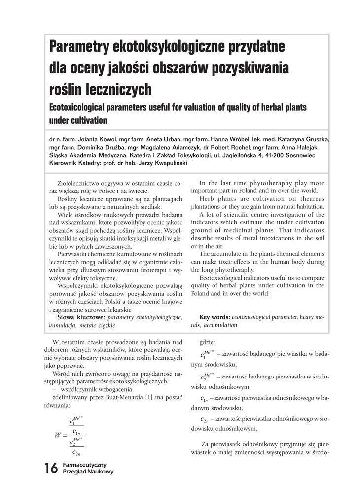 Parametry ekotoksykologiczne przydatne dla oceny jakoci obszarów pozyskiwania rolin leczniczych Woskowina jako przezprze³ykowej problem terapeutyczny Nr 5/2007 Leczenie siarczanem glukozaminy Wspó³czesne choroby zwyrodnieniowej mo¿liwoci wykorzystania stawów technikiuszna stymulacji serca Ecotoxicological parameters useful for valuation of quality of herbal plants under cultivation dr n. farm. Jolanta Kowol, mgr farm. Aneta Urban, mgr farm. Hanna Wróbel, lek. med. Katarzyna Gruszka, mgr farm. Dominika Dru¿ba, mgr Magdalena Adamczyk, dr Robert Rochel, mgr farm. Anna Halejak l¹ska Akademia Medyczna, Katedra i Zak³ad Toksykologii, ul. Jagielloñska 4, 41-200 Sosnowiec Kierownik Katedry: prof. dr hab. Jerzy Kwapuliñski Ziołolecznictwo odgrywa w ostatnim czasie coraz większą rolę w Polsce i na świecie. Rośliny lecznicze uprawiane są na plantacjach lub są pozyskiwane z naturalnych siedlisk. Wiele ośrodków naukowych prowadzi badania nad wskaźnikami, które pozwoliłyby ocenić jakość obszarów skąd pochodzą rośliny lecznicze. Współczynniki te opisują skutki intoksykacji metali w glebie lub w pyłach zawieszonych. Pierwiastki chemiczne kumulowane w roślinach leczniczych mogą odkładać się w organizmie człowieka przy dłuższym stosowaniu fitoterapii i wywoływać efekty toksyczne. Współczynniki ekotoksykologiczne pozwalają porównać jakość obszarów pozyskiwania roślin w różnych częściach Polski a także ocenić krajowe i zagraniczne surowce lekarskie Słowa kluczowe: parametry ekotokykologiczne, kumulacja, metale ciężkie W ostatnim czasie prowadzone są badania nad doborem różnych wskaźników, które pozwalają ocenić wybrane obszary pozyskiwania roślin leczniczych jako poprawne. Wśród nich zwrócono uwagę na przydatność następujących parametrów ekotoksykologicznych: – współczynnik wzbogacenia zdefiniowany przez Buat-Menarda [1] ma postać równania: +n W= $ c1Me c1n In the last time phytotheraphy play more important part in Poland and in over the world. Herb plants are cultivation on theareas plantations or they are gain from natural habitation. A lot of scientific centre investigation of the indicators which estimate the under cultivation ground of medicinal plants. That indicators describe results of metal intoxications in the soil or in the air. The accumulate in the plants chemical elements can make toxic effects in the human body during the long phytotheraphy. Ecotoxicological indicators useful us to compare quality of herbal plants under cultivation in the Poland and in over the world. Key words: ecotoxicological parameter, heavy metals, accumulation gdzie: c1Me +n – zawartość badanego pierwiastka w bada- nym środowisku, +n c2Me – zawartość badanego pierwiastka w środowisku odnośnikowym, c1n – zawartość pierwiastka odnośnikowego w badanym środowisku, c2 n – zawartość pierwiastka odnośnikowego w środowisku odnośnikowym. +n c2Me c2 n Farmaceutyczny Przegl¹d Naukowy Za pierwiastek odnośnikowy przyjmuje się pierwiastek o małej zmienności występowania w środo- Nr 5/2007 Parametry ekotoksykologiczne przydatne dla oceny jakoci obszarów pozyskiwania rolin leczniczych wisku lub pierwiastek obecny w ilościach śladowych w badanym środowisku. Często przyjmuje się jako odnośnikowy pierwiastek o najmniejszej wielkości współczynnika zmienności, który jednocześnie występuje w dużych ilościach w danym elemencie środowisk przyrodniczego i nie wykazuje synergizmu lub antagonizmu w stosunki do pierwiastka badanego. Takie warunki spełnia Mn, Al, Sc, Ti, Ni [2]. – indeks geokumulacyjny przyjmuje postać: I geo = log 2 cn 1,5 ⋅ Bn , w której: cn – stężenie pierwiastka w danym elemencie środowiska, Bn – tło geochemiczne, za które przyjmuje się naturalną zawartość pierwiastka. Indeks geokumulacyjny pozwala klasyfikować stopień zanieczyszczenia poszczególnych elementów środowiska danym pierwiastkiem, – współczynnik specyficznej kumulacji – opisuje iloraz zawartości danego pierwiastka w danej roślinie do jego średnich zawartości w innych gatunkach roślin występujących w tym samym siedlisku, – wskaźnik koncentracji względnej WKW = ( SA − ZR ) ⋅100 , ZR ją obszarowe tendencje zmian współczynnika wzbogacenia i indeksu geokumulacyjnego. We przypadku wskaźników koncentracji względnej bardzo istotne jest określenie zawartości referencyjnych, które odpowiadają średniej geometrycznej danego gatunku na większym obszarze. Wskaźnik względnej kumulacji pozwala wskazać na obszary, w których występują zjawiska ponadprzeciętnego kumulowania danego pierwiastka. Jego wartość ma znaczenie bardzo praktyczne, gdyż pozwala pominąć konieczność uwzględnienia sposobu interakcji wybranych metali, a także konieczność określenia biodostępności chemicznych form danego pierwiastka w glebie. Przegląd piśmiennictwa pokazuje, że zmiany zawartości metali odbywają się w bardzo szerokich zakresach. W szeregu przypadkach rośliny niejednokrotnie w razie nadmiernych stężeń metali nie wykazują się zjawiskiem tolerancji lub dyskryminacji na dany metal. Świadczy to wówczas o zaburzonej fizjologii metali o charakterze ekotoksykologicznym [5] Zmiany zawartości wybranych pierwiastków w roślinach odbywają się w rezultacie kumulacji ich przez układ korzeniowy lub nawożenie dolistne. Przykładowo gleby na Ziemi Cieszyńskiej zawierały następujące różne ilości metali [tabela 2], w tym udział procentowy chemicznych form metali w glebie ze względu na rodzaj pierwiastka był różny [tabela 3]. gdzie: SA – średnia geometryczna zawartości metalu w roślinie badanej, ZR – zawartość referencyjna równa średniej geometrycznej dla roślin dla wybranego obszaru. Wartości współczynnika wzbogacenia interpretuje się następująco [3]: – <2 – minimalne zanieczyszczenie danego elementu środowiska, – 2-5 – średnie zanieczyszczenie, – 5
