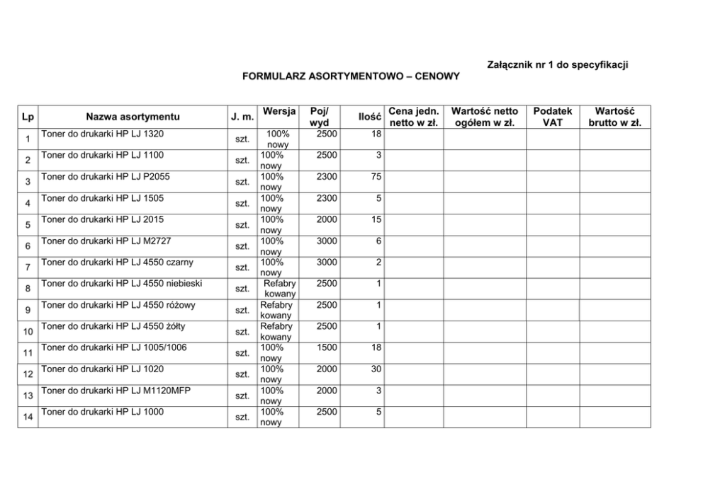 Załącznik nr 1 do specyfikacji FORMULARZ ASORTYMENTOWO – CENOWY Lp 1 2 3 4 5 6 7 8 9 10 11 12 13 14 Nazwa asortymentu Toner do drukarki HP LJ 1320 Toner do drukarki HP LJ 1100 Toner do drukarki HP LJ P2055 Toner do drukarki HP LJ 1505 Toner do drukarki HP LJ 2015 Toner do drukarki HP LJ M2727 Toner do drukarki HP LJ 4550 czarny Toner do drukarki HP LJ 4550 niebieski Toner do drukarki HP LJ 4550 różowy Toner do drukarki HP LJ 4550 żółty Toner do drukarki HP LJ 1005/1006 Toner do drukarki HP LJ 1020 Toner do drukarki HP LJ M1120MFP Toner do drukarki HP LJ 1000 J. m. szt. szt. szt. szt. szt. szt. szt. szt. szt. szt. szt. szt. szt. szt. Wersja 100% nowy 100% nowy 100% nowy 100% nowy 100% nowy 100% nowy 100% nowy Refabry kowany Refabry kowany Refabry kowany 100% nowy 100% nowy 100% nowy 100% nowy Poj/ wyd Ilość 2500 18 2500 3 2300 75 2300 5 2000 15 3000 6 3000 2 2500 1 2500 1 2500 1 1500 18 2000 30 2000 3 2500 5 Cena jedn. netto w zł. Wartość netto ogółem w zł. Podatek VAT Wartość brutto w zł. 15 16 17 18 19 20 21 22 23 24 25 26 Tusz do drukarki HP DJ 3940 czarny Tusz do drukarki HP DJ 3940 kolor Tusz do drukarki HP OfficeJet J5780 czarny Tusz do drukarki HP OfficeJet J5780 kolor Tusz do drukarki HP PSC 1410 czarny Tusz do drukarki HP PSC 1410 kolor Tusz do drukarki HP DJ D2560 czarny Tusz do drukarki HP DJ D2560 kolor Toner do drukarki HP Color CP1525 czarny Toner do drukarki HP Color CP1525 niebieski Toner do drukarki HP Color CP1525 różowy Toner do drukarki HP Color CP1525 żółty Toner do drukarki HP LJ CM1312MFP czarny Toner do drukarki HP LJ 28 CM1312MFPniebieski Toner do drukarki HP LJ CM1312MFP 29 różowy Toner do drukarki HP LJ CM1312MFP żółty 30 27 31 Toner do drukarki HP LJ M1132MFP szt. szt. szt. szt. szt. szt. szt. szt. szt. szt. szt. szt. szt. szt. szt. szt. szt. Refabry kowany Refabry kowany 100% nowy 100% nowy Refabry kowany Refabry kowany 100% nowy 100% nowy 100% nowy 100% nowy 100% nowy 100% nowy Refabry kowany Refabry kowany Refabry kowany Refabry kowany 100% nowy 19ml 7 17ml 3 25ml 5 13,8ml 3 19ml 5 17ml 2 18ml 3 12ml 2 2000 2 1300 2 1300 2 1300 2 25 3 2200 2 2200 2 2200 2 1600 5 32 33 34 35 36 37 38 39 40 41 42 43 44 45 46 47 48 Toner do drukarki Lexmark C540 czarny Toner do drukarki Lexmark C540 niebieski Toner do drukarki Lexmark C540 różowy Toner do drukarki Lexmark C540 żółty Bęben na zużyty toner do drukarki Lexmark C540 Tusz do drukarki Lexmarki X 1150 czarny Tusz do drukarki Lexmarki X 1150 kolor Tusz do drukarki Lexmark X6575 czarny Tusz do drukarki Lexmark X6575 kolor Toner do drukarki Samsung ML 1520 Toner do drukarki Samsung ML 1640 Toner do drukarki Samsung ML 2571N Tusz do drukarki Canon IP 4500 Pixima czarny 08 Tusz do drukarki Canon IP 4500 Pixima czarny 05 Tusz do drukarki Canon IP 4500 Pixima niebieski 08 Tusz do drukarki Canon IP 4500 Pixima różowy 08 Tusz do drukarki Canon IP 4500 Pixima żółty 08 szt. szt. szt. szt. szt. szt. szt. szt. szt. szt. szt. szt. szt. szt. szt. szt. szt. 100% nowy 100% nowy 100% nowy 100% nowy 100% nowy 100% nowy 100% nowy 100% nowy 100% nowy 100% nowy 100% nowy 100% nowy 100% nowy 100% nowy 100% nowy 100% nowy 100% nowy 2500 10 2000 4 2000 4 2000 4 2000 3 15ml 12 15ml 2 15ml 4 15ml 2 3000 4 1500 2 3000 3 14ml 2 26ml 2 14ml 2 14ml 2 14ml 2 49 50 51 52 53 54 55 56 57 58 59 60 61 62 63 64 65 Tusz do drukarki Canon IP 2600 czarny Tusz do drukarki Canon IP 2600 kolor Toner do drukarki Kyocera Mita FS 1000+ Toner do drukarki Kyocera FS 1800 Taśma do drukarki OKI 591 Taśma do drukarki OKI 3410 Taśma do drukarki OKI 3390 Taśma do FAX Panasonic KX 52613 Taśma do drukarki Panasonic 2130 Toner do drukarki Dell LP 1700 Toner do drukarki Brother HL-5140 Płyty DVD-R Płyty CD-R Koperty do płyt (z okienkiem) Papier A4 Kupony do MiniInfoMedica bez nadruku (same ramki) Toner do drukarki Samsung SCX 4720F szt. szt. szt. szt. szt. szt. szt. szt. szt. szt. szt. szt. szt. szt. ryz szt. szt. 100% nowy 100% nowy 100% nowy 100% nowy 100% nowy 100% nowy 100% nowy 100% nowy 100% nowy 100% nowy 100% nowy 100% nowy 100% nowy 100% nowy 100% nowy 100% nowy 100% nowy 12ml 2 12ml 2 2000 2 2500 2 - 3 - 3 2mln znaków - 70 - 45 2500 3 2500 2 - 500 - 7600 - 8100 - 20 - 100 5000 5 4 66 Rolki kasowe termiczne szerokość 57 mm (op 10 szt.) Op. 100% nowy - 5 RAZEM: Ceny winny być podane cyfrowo z dwoma miejscami po przecinku W pozycjach 8 – 10, 15 – 16, 19 – 20, 27 - 30 dopuszczane są produkty Re fabrykowane nie odbiegające jakością oryginałowi Razem wartość netto:....................słownie: ................................................................ Razem wartość brutto:......................słownie: ........................................................... ................................................................. (miejscowość, data) ................................................................................................ podpisy osób wskazanych w dokumencie uprawniającym do występowania w obrocie prawnym lub posiadających pełnomocnictwo