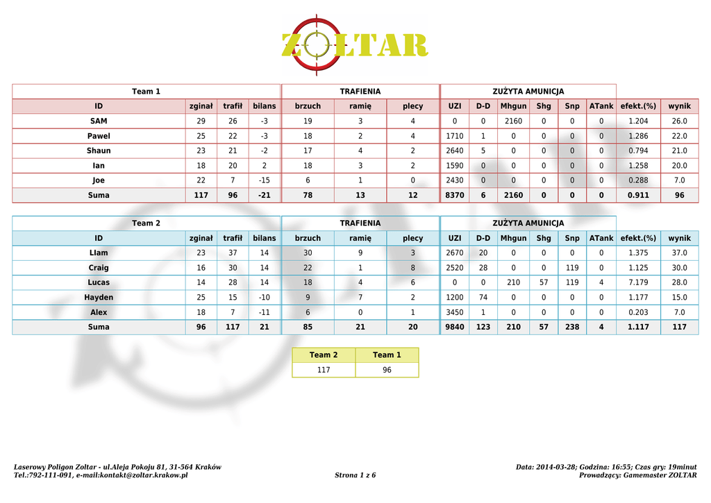 Team 1 TRAFIENIA ZUŻYTA AMUNICJA ID zginał trafił bilans brzuch ramię plecy UZI D-D Mhgun Shg Snp SAM 29 26 -3 19 3 4 0 0 2160 0 0 0 1.204 26.0 Pawel 25 22 -3 18 2 4 1710 1 0 0 0 0 1.286 22.0 Shaun 23 21 -2 17 4 2 2640 5 0 0 0 0 0.794 21.0 Ian 18 20 2 18 3 2 1590 0 0 0 0 0 1.258 20.0 Joe 22 7 -15 6 1 0 2430 0 0 0 0 0 0.288 7.0 Suma 117 96 -21 78 13 12 8370 6 2160 0 0 0 0.911 96 Team 2 TRAFIENIA ATank efekt.(%) wynik ZUŻYTA AMUNICJA ID zginał trafił bilans brzuch ramię plecy UZI D-D Mhgun Shg Snp LIam 23 37 14 30 9 3 2670 20 0 0 0 0 1.375 37.0 Craig 16 30 14 22 1 8 2520 28 0 0 119 0 1.125 30.0 Lucas 14 28 14 18 4 6 0 0 210 57 119 4 7.179 28.0 Hayden 25 15 -10 9 7 2 1200 74 0 0 0 0 1.177 15.0 Alex 18 7 -11 6 0 1 3450 1 0 0 0 0 0.203 7.0 Suma 96 117 21 85 21 20 9840 123 210 57 238 4 1.117 117 Laserowy Poligon Zoltar - ul.Aleja Pokoju 81, 31-564 Kraków Tel.:792-111-091, e-mail:[email protected] Team 2 Team 1 117 96 Strona 1 z 6 ATank efekt.(%) wynik Data: 2014-03-28; Godzina: 16:55; Czas gry: 19minut Prowadzący: Gamemaster ZOLTAR Team 1 TRAFIENIA ZUŻYTA AMUNICJA ID zginał trafił bilans brzuch ramię plecy UZI D-D Mhgun Shg efekt.(%) wynik Shaun 19 48 29 36 6 7 3480 9 0 0 1.376 48.0 Ian 28 22 -6 12 4 8 1650 0 0 0 1.333 22.0 Joe 17 17 0 10 4 3 0 0 2010 0 0.846 17.0 SAM 29 16 -13 8 3 5 0 0 2160 0 0.741 16.0 Pawel 18 14 -4 11 3 1 1680 0 0 0 0.833 14.0 Suma 111 117 6 77 20 24 6810 9 4170 0 1.065 117 Team 2 TRAFIENIA ZUŻYTA AMUNICJA ID zginał trafił bilans brzuch ramię plecy UZI D-D Mhgun Shg efekt.(%) wynik Craig 25 38 13 23 14 12 1530 102 0 0 2.328 38.0 LIam 21 34 13 28 5 5 2550 1 0 0 1.333 34.0 Lucas 21 26 5 15 6 5 4140 0 0 0 0.628 26.0 Hayden 30 8 -22 4 3 1 2220 0 0 0 0.360 8.0 Alex 20 5 -15 4 0 1 0 0 330 53 1.305 5.0 Suma 117 111 -6 74 28 24 10440 103 330 53 1.016 111 Laserowy Poligon Zoltar - ul.Aleja Pokoju 81, 31-564 Kraków Tel.:792-111-091, e-mail:[email protected] Team 1 Team 2 117 111 Strona 2 z 6 Data: 2014-03-28; Godzina: 17:34; Czas gry: 25minut Prowadzący: Gamemaster ZOLTAR Drużyny Miejsce Laserowy Poligon Zoltar - ul.Aleja Pokoju 81, 31-564 Kraków Tel.:792-111-091, e-mail:[email protected] Nazwa Rozgrywki 1 2 Suma Team 2 117 111 228 Team 1 213 96 Strona 3 z 6 117 Data: 2014-03-28 Prowadzący: Gamemaster ZOLTAR Zestawienie wg wyniku Miejsce TRAFIENIA ZUŻYTA AMUNICJA ID zginał trafił bilans brzuch ramię plecy UZI D-D Mhgun Shg Snp aTank efekt.(%) wynik LIam 61.52 99.22 37.71 80.97 20.21 10.74 7275.79 32.78 0.00 0.00 0.00 0.00 1.358 99.22 Craig 55.26 92.97 37.71 62.34 18.38 27.03 5814.95 166.61 0.00 0.00 187.89 0.00 1.507 92.97 Shaun 59.12 90.76 31.64 70.04 13.52 11.56 8344.42 18.69 0.00 0.00 0.00 0.00 1.085 90.76 4 Lucas 47.31 75.41 28.11 46.42 13.52 15.47 4968.00 0.00 331.58 90.00 187.89 6.32 1.351 75.41 5 SAM 80.59 60.25 -20.34 39.60 8.34 12.32 0.00 0.00 6002.53 0.00 0.00 0.00 1.004 60.25 6 Ian 62.02 57.98 -4.04 42.82 9.54 12.76 4490.53 0.00 0.00 0.00 0.00 0.00 1.291 57.98 7 Pawel 61.07 51.54 -9.54 41.62 6.76 7.52 4716.00 1.58 0.00 0.00 0.00 0.00 1.092 51.54 8 Hayden 75.47 33.28 -42.19 19.01 14.65 4.36 4558.74 116.84 0.00 0.00 0.00 0.00 0.712 33.28 9 Joe 55.14 31.45 -23.68 21.47 6.38 3.60 3836.84 0.00 2412.00 0.00 0.00 0.00 0.503 31.45 10 Alex 52.42 17.05 -35.37 14.27 0.00 2.78 5447.37 1.58 396.00 63.60 0.00 0.00 0.289 17.05 Laserowy Poligon Zoltar - ul.Aleja Pokoju 81, 31-564 Kraków Tel.:792-111-091, e-mail:[email protected] Strona 4 z 6 Data: 2014-03-28 Prowadzący: Gamemaster ZOLTAR Zestawienie wg bilansu Miejsce ID zginał trafił Craig 55.26 92.97 LIam 61.52 99.22 Shaun 59.12 90.76 Lucas 47.31 4 Ian 5 TRAFIENIA bilans ZUŻYTA AMUNICJA brzuch ramię plecy UZI D-D Mhgun Shg Snp aTank efekt.(%) wynik 62.34 18.38 27.03 5814.95 166.61 0.00 0.00 187.89 0.00 1.507 92.97 80.97 20.21 10.74 7275.79 32.78 0.00 0.00 0.00 0.00 1.358 99.22 31.64 70.04 13.52 11.56 8344.42 18.69 0.00 0.00 0.00 0.00 1.085 90.76 75.41 28.11 46.42 13.52 15.47 4968.00 0.00 331.58 90.00 187.89 6.32 1.351 75.41 62.02 57.98 -4.04 42.82 9.54 12.76 4490.53 0.00 0.00 0.00 0.00 0.00 1.291 57.98 Pawel 61.07 51.54 -9.54 41.62 6.76 7.52 4716.00 1.58 0.00 0.00 0.00 0.00 1.092 51.54 6 SAM 80.59 60.25 -20.34 39.60 8.34 12.32 0.00 0.00 6002.53 0.00 0.00 0.00 1.004 60.25 7 Joe 55.14 31.45 -23.68 21.47 6.38 3.60 3836.84 0.00 2412.00 0.00 0.00 0.00 0.503 31.45 8 Alex 52.42 17.05 -35.37 14.27 0.00 2.78 5447.37 1.58 396.00 63.60 0.00 0.00 0.289 17.05 9 Hayden 75.47 33.28 -42.19 19.01 14.65 4.36 4558.74 116.84 0.00 0.00 0.00 0.00 0.712 33.28 37.71 Laserowy Poligon Zoltar - ul.Aleja Pokoju 81, 31-564 Kraków Tel.:792-111-091, e-mail:[email protected] Strona 5 z 6 Data: 2014-03-28 Prowadzący: Gamemaster ZOLTAR Zestawienie wg efektywności Miejsce TRAFIENIA ZUŻYTA AMUNICJA ID zginał trafił bilans brzuch ramię plecy UZI D-D Mhgun Shg Snp aTank efekt.(%) wynik Craig 55.26 92.97 37.71 62.34 18.38 27.03 5814.95 166.61 0.00 0.00 187.89 0.00 1.507 92.97 LIam 61.52 99.22 37.71 80.97 20.21 10.74 7275.79 32.78 0.00 0.00 0.00 0.00 1.358 99.22 Lucas 47.31 75.41 28.11 46.42 13.52 15.47 4968.00 0.00 331.58 90.00 187.89 6.32 1.351 75.41 4 Ian 62.02 57.98 -4.04 42.82 9.54 12.76 4490.53 0.00 0.00 0.00 0.00 0.00 1.291 57.98 5 Pawel 61.07 51.54 -9.54 41.62 6.76 7.52 4716.00 1.58 0.00 0.00 0.00 0.00 1.092 51.54 6 Shaun 59.12 90.76 31.64 70.04 13.52 11.56 8344.42 18.69 0.00 0.00 0.00 0.00 1.085 90.76 7 SAM 80.59 60.25 -20.34 39.60 8.34 12.32 0.00 0.00 6002.53 0.00 0.00 0.00 1.004 60.25 8 Hayden 75.47 33.28 -42.19 19.01 14.65 4.36 4558.74 116.84 0.00 0.00 0.00 0.00 0.712 33.28 9 Joe 55.14 31.45 -23.68 21.47 6.38 3.60 3836.84 0.00 2412.00 0.00 0.00 0.00 0.503 31.45 10 Alex 52.42 17.05 -35.37 14.27 0.00 2.78 5447.37 1.58 396.00 63.60 0.00 0.00 0.289 17.05 Laserowy Poligon Zoltar - ul.Aleja Pokoju 81, 31-564 Kraków Tel.:792-111-091, e-mail:[email protected] Strona 6 z 6 Data: 2014-03-28 Prowadzący: Gamemaster ZOLTAR
