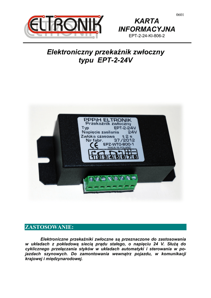 0601 KARTA INFORMACYJNA EPT-2-24-KI-806-2 Elektroniczny przekaźnik zwłoczny typu EPT-2-24V ZASTOSOWANIE: Q Elektroniczne przekaźniki zwłoczne są przeznaczone do zastosowania w układach z pokładową siecią prądu stałego, o napięciu 24 V. Służą do cyklicznego przełączania styków w układach automatyki i sterowania w pojazdach szynowych. Do zamontowania wewnątrz pojazdu, w komunikacji krajowej i międzynarodowej. 0601 OPIS: Przekaźnik zwłoczny jest wykonany z wykorzystaniem cyfrowych układów scalonych serii CMOS. Napięcie zasilania jest dostarczane do układu stabilizatora zapewniającego stałe warunki zasilania, niezależne od wahań napięcia zasilania wagonu i temperatury otoczenia. Układ zasilania jest zabezpieczony przed uszkodzeniem wskutek przyłączenia zasilania o niewłaściwej biegunowości. Elementem wykonawczym jest przekaźnik elektromagnetyczny. Na obudowie są umieszczone zaciski do przyłączenia zasilania i obwodów wykonawczych. Oznaczenia zacisków są przedstawione na rysunku. Ustawienie styków przedstawiono w sytuacji, gdy przekaźnik nie jest zasilany. W przekaźniku EPT ze stałym czasem zadziałania przyłączenie do zacisków „+” i „-” napięcia zasilania spowoduje uaktywnienie i przełączenie styków wykonawczych przekaźnika oraz uaktywnienie układu czasowego, określającego czas zadziałania. Po tym czasie przekaźnik powróci do stanu wyjściowego tzn. styki przekaźnika wykonawczego znajdą się w pozycji jak na rysunku (na obudowie). Przekaźnik powróci do stanu wyjściowego także w sytuacji, gdy nie upłynął jeszcze czas zadziałania, ale nastąpi w międzyczasie wyłączenie napięcia zasilania. Uaktywnienie przekaźnika odbywa się przez ponowne załączenie napięcia zasilania. 37.0 92.0 120.0 47.0 105.0 DANE TECHNICZNE: znamionowe napięcie zasilania UN………………….….…...…...……...24 V d.c. dopuszczalny zakres zmian napięcia zasilania ……....……(od 0,6 do 1,25) UN znamionowy prąd obciążenia styków …………….….………………...16 A/24 V zwłoka czasowa …………………………...….…………….…… wg zamówienia dokładność zadziałania zwłoki czasowej …….……......………………... 10 % pobór prądu zasilania …………………….………………………...………< 0.2 A obciążalność obwodów wykonawczych………………..………………………8 A zewnętrzna temperatura pracy …………..…...….…klasa T3 wg PN-EN 50155 masa ………………………………………………….………………………...200 g wymiary ……………………………………………..…..20 mm x 48 mm x 61 mm Warunki Techniczne Wykonania i Odbioru ….....……………..EPZ-WTO-800-1 PPPiH ELTRONIK Sp. z o.o. ul. Lelewela 4B 61-409 POZNAŃ tel. (+48) 61 830 42 01, 61 839 92 44, 61 839 92 49, fax. 61 830 65 02 http://www.eltronik.pl e-mail: [email protected]