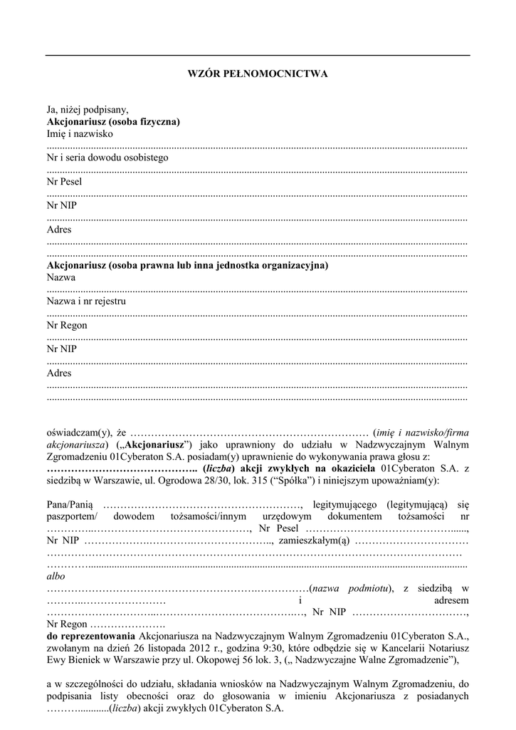 WZÓR PEŁNOMOCNICTWA Ja, niżej podpisany, Akcjonariusz (osoba fizyczna) Imię i nazwisko .................................................................................................................................................................. Nr i seria dowodu osobistego .................................................................................................................................................................. Nr Pesel .................................................................................................................................................................. Nr NIP .................................................................................................................................................................. Adres .................................................................................................................................................................. .................................................................................................................................................................. Akcjonariusz (osoba prawna lub inna jednostka organizacyjna) Nazwa .................................................................................................................................................................. Nazwa i nr rejestru .................................................................................................................................................................. Nr Regon .................................................................................................................................................................. Nr NIP .................................................................................................................................................................. Adres .................................................................................................................................................................. .................................................................................................................................................................. oświadczam(y), że …………………………………………………………… (imię i nazwisko/firma akcjonariusza) („Akcjonariusz”) jako uprawniony do udziału w Nadzwyczajnym Walnym Zgromadzeniu 01Cyberaton S.A. posiadam(y) uprawnienie do wykonywania prawa głosu z: …………………………………….. (liczba) akcji zwykłych na okaziciela 01Cyberaton S.A. z siedzibą w Warszawie, ul. Ogrodowa 28/30, lok. 315 (“Spółka”) i niniejszym upoważniam(y): Pana/Panią …………………………………………………, legitymującego (legitymującą) się paszportem/ dowodem tożsamości/innym urzędowym dokumentem tożsamości nr …………..………………………………………, Nr Pesel ……………………………………......, Nr NIP ……………….………….………………….., zamieszkałym(ą) …………………………… ………………………………………………………………………………………………………… ………….................................................................................................................................................. albo …………………………………………………….……………(nazwa podmiotu), z siedzibą w ………..…………………… i adresem …………………………..………………………………….…, Nr NIP ……………………………, Nr Regon …………………. do reprezentowania Akcjonariusza na Nadzwyczajnym Walnym Zgromadzeniu 01Cyberaton S.A., zwołanym na dzień 26 listopada 2012 r., godzina 9:30, które odbędzie się w Kancelarii Notariusz Ewy Bieniek w Warszawie przy ul. Okopowej 56 lok. 3, („ Nadzwyczajne Walne Zgromadzenie”), a w szczególności do udziału, składania wniosków na Nadzwyczajnym Walnym Zgromadzeniu, do podpisania listy obecności oraz do głosowania w imieniu Akcjonariusza z posiadanych ………............(liczba) akcji zwykłych 01Cyberaton S.A. Pełnomocnictwo jest ważne do dnia zakończenia Walnego Zgromadzenia. Pełnomocnik nie może udzielać dalszych pełnomocnictw. ______________________________ (podpis) ______________________________ (podpis) Miejscowość: ................................ Miejscowość: ................................ Data: .............................................. Data: …………………………….. _________________________________________________________________________________ * niepotrzebne skreślić. WAŻNE INFORMACJE: Identyfikacja Akcjonariusza W celu identyfikacji Akcjonariusza udzielającego pełnomocnictwa, do niniejszego pełnomocnictwa powinna zostać załączona: (i) W przypadku akcjonariusza będącego osobą fizyczną - kopia dowodu osobistego, paszportu lub innego urzędowego dokumentu tożsamości akcjonariusza. Dodatkowo akcjonariusz będący osobą fizyczną winien załączyć oświadczenie o wyrażeniu zgody na przetwarzanie przez Spółkę danych osobowych w celu identyfikacji akcjonariusza na potrzeby weryfikacji ważności pełnomocnictwa udzielonego w postaci elektronicznej, (ii) W przypadku akcjonariusza innego niż osoba fizyczna – kopia odpisu z właściwego rejestru lub innego dokumentu potwierdzającego umocowanie do udzielenia upoważnienia pełnomocnikowi do reprezentowania akcjonariusza na Walnym Zgromadzeniu. W przypadku wątpliwości co do prawdziwości kopii wyżej wymienionych dokumentów, Zarząd Spółki zastrzega sobie prawo do żądania od pełnomocnika okazania przy sporządzaniu listy obecności: (i) W przypadku akcjonariusza będącego osobą fizyczną – kopii potwierdzonej za zgodność z oryginałem przez notariusza lub inny podmiot uprawniony do potwierdzania za zgodność z oryginałem ko