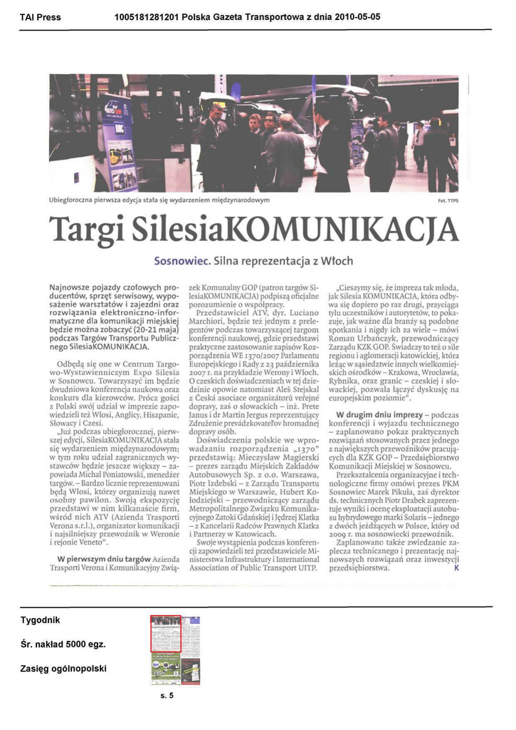 TAI Press 1005181281201 Polska Gazeta Transportowa z dnia 2010-05-05 Ubiegłoroczna pierwsza edycja stata się wydarzeniem międzynarodowym Targi SilesiaKOMUNIKACJA Sosnowiec. Silna reprezentacja z Włoch Najnowsze pojazdy czołowych producentów, sprzęt serwisowy, wyposażenie warsztatów i zajezdni oraz rozwiązania elektroniczno-informatyczne dla komunikacji miejskiej będzie można zobaczyć (20-21 maja) podczas Targów Transportu Publicznego SilesiaKOMUNIKACJA. Odbędą się one w Centrum Targowo-Wystawienniczym Expo Silesia w Sosnowcu. Towarzyszyć im będzie dwudniowa konferencja naukowa oraz konkurs dla kierowców. Prócz gości z Polski swój udział w imprezie zapowiedzieli też Włosi, Anglicy, Hiszpanie, Słowacy i Czesi. „Już podczas ubiegłorocznej, pierwszej edycji, SilesiaKOMUNIKACJA stalą się wydarzeniem międzynarodowym; w tym roku udział zagranicznych wystawców będzie jeszcze większy - zapowiada Michał Poniatowski, menedżer targów. - Bardzo licznie reprezentowani będą Włosi, którzy organizują nawet osobny pawilon. Swoją ekspozycję przedstawi w nim kilkanaście firm, wśród nich ATV (Azienda Trasporti Yerona s.r.l.), organizator komunikacji i najsilniejszy przewoźnik w Weronie i rejonie Veneto". W pierwszym dniu targów Azienda Trasporti Yerona i Komunikacyjny Zwią- Tygodnik Śr. nakład 5000 egz. Zasięg ogólnopolski s. 5 zek Komunalny GOP (patron targów Si„Cieszymy się, że impreza tak młoda, lesiaKOMUNIKACJA) podpiszą oficjalne jak Silesia KOMUNIKACJA, która odbyporozumienie o współpracy. wa się dopiero po raz drugi, przyciąga Przedstawiciel ATV, dyr. Luciano tylu uczestników i autorytetów, to pokaMarchiori, będzie też jednym z prele- zuje, jak ważne dla branży są podobne gentów podczas towarzyszącej targom spotkania i nigdy ich za wiele - mówi konferencji naukowej, gdzie przedstawi Roman Urbańczyk, przewodniczący praktyczne zastosowanie zapisów Roz- Zarządu KZK GOP. Świadczy to też o sile porządzenia WE 1370/2007 Parlamentu regionu i aglomeracji katowickiej, która Europejskiego i Rady z 23 października leżąc w sąsiedztwie innych wielkomiej2007 r. na przykładzie Werony i Włoch. skich ośrodków-Krakowa, Wrocławia, 0 czeskich doświadczeniach w tej dzie- Rybnika, oraz granic - czeskiej i słodzinie opowie natomiast Aleś Stejskal wackiej, pozwala łączyć dyskusję na z Ćeska asociace organizatoru vefejne europejskim poziomie". dopravy, zaś o słowackich - inż. Prete W drugim dniu imprezy - podczas Janus i dr Martin Jergus reprezentujący Zdrużenie prevadzkovatel'ov hromadnej konferencji i wyjazdu technicznego dopravy osób. - zaplanowano pokaz praktycznych Doświadczenia polskie we wpro- rozwiązań stosowanych przez jednego wadzaniu rozporządzenia „1370" z największych przewoźników pracująprzedstawią: Mieczysław Magierski cych dla KZK GOP - Przedsiębiorstwo - prezes zarządu Miejskich Zakładów Komunikacji Miejskiej w Sosnowcu. Autobusowych Sp. z o.o. Warszawa, Przekształcenia organizacyjne i techPiotr Izdebski - z Zarządu Transportu nologiczne firmy omówi prezes PKM Miejskiego w Warszawie, Hubert Ko- Sosnowiec Marek Pikuła, zaś dyrektor łodziejski - przewodniczący zarządu ds. technicznych Piotr Drabek zaprezenMetropolitalnego Związku Komunika- tuje wyniki i ocenę eksploatacji autobucyjnego Zatoki Gdańskiej i Jędrzej Klatka su hybrydowego marki Solaris -jednego - z Kancelarii Radców Prawnych Klatka z dwóch jeżdżących w Polsce, który od 1 Partnerzy w Katowicach. 2009 r. ma sosnowiecki przewoźnik. Zaplanowane także zwiedzanie zaSwoje wystąpienia podczas konferencji zapowiedzieli też przedstawiciele Mi- plecza technicznego i prezentację najnisterstwa Infrastruktury i International nowszych rozwiązań oraz inwestycji Association of Public Transport UITP. przedsiębiorstwa. K