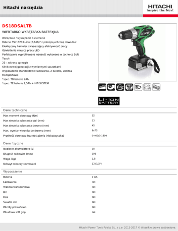 Hitachi narzędzia DS18DSALTB WIERTARKO-WKRĘTARKA BATERYJNA Wkręcanie / wykręcanie / wiercenie Baterie BSL1820 Li-ion (2,0Ah)* z potrójną ochroną obwodów Elektryczny hamulec zwiększający efektywność pracy Oświetlenie miejsca pracy LED Perfekcyjnie wyprofilowana rękojeść wykonana w technice Soft Touch 22 - zakresy sprzęgła Silnik nowej generacji z wymiennymi szczotkami Wyposażenie standardowe: ładowarka, 2 baterie, walizka transportowa *spec. TB baterie 2Ah, *spec. TE baterie 2,5Ah + HIT-SYSTEM Dane techniczne Max moment obrotowy (Nm) 52 Max średnica wiercenia stal (mm) 13 Max średnica wiercenia drewno (mm) 45 Max. wymiar wkrętów do drewna (mm) 8x75 Prędkość obrotowa bez obciążenia (niska/wysoka) 0-400/0-1500 Dane fizyczne Napięcie akumulatora (V) 18 Długość całkowita (mm) 196 Waga (kg) 1,8 Uchwyt roboczy (mm/cale) 13 (1/2") Wyposażenie Bateria 2 szt. Ładowarka tak Walizka transportowa tak Bit tak Hak tak Światło led tak Obroty prawo/lewo tak Obudowa soft grip tak Hitachi Power Tools Polska Sp. z o.o. 2013-2017 © Wszelkie prawa zastrzeżone.