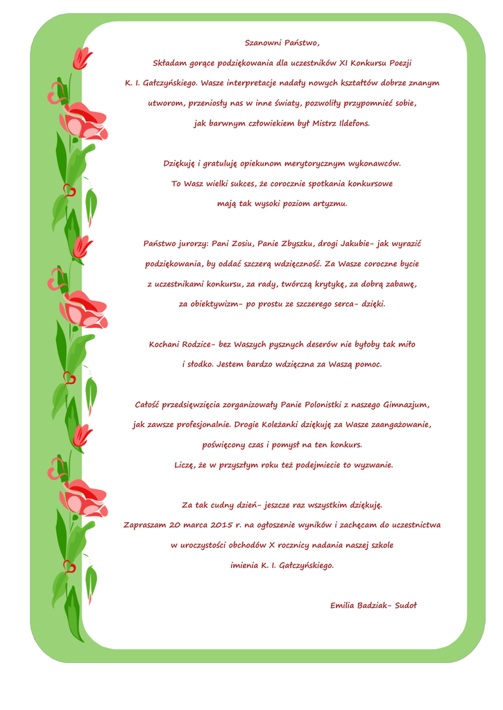 Szanowni Państwo, Składam gorące podziękowania dla uczestników XI Konkursu Poezji K. I. Gałczyńskiego. Wasze interpretacje nadały nowych kształtów dobrze znanym utworom, przeniosły nas w inne światy, pozwoliły przypomnieć sobie, jak barwnym człowiekiem był Mistrz Ildefons. Dziękuję i gratuluję opiekunom merytorycznym wykonawców. To Wasz wielki sukces, że corocznie spotkania konkursowe mają tak wysoki poziom artyzmu. Państwo jurorzy: Pani Zosiu, Panie Zbyszku, drogi Jakubie- jak wyrazić podziękowania, by oddać szczerą wdzięczność. Za Wasze coroczne bycie z uczestnikami konkursu, za rady, twórczą krytykę, za dobrą zabawę, za obiektywizm- po prostu ze szczerego serca- dzięki. Kochani Rodzice- bez Waszych pysznych deserów nie byłoby tak miło i słodko. Jestem bardzo wdzięczna za Waszą pomoc. Całość przedsięwzięcia zorganizowały Panie Polonistki z naszego Gimnazjum, jak zawsze profesjonalnie. Drogie Koleżanki dziękuję za Wasze zaangażowanie, poświęcony czas i pomysł na ten konkurs. Liczę, że w przyszłym roku też podejmiecie to wyzwanie. Za tak cudny dzień- jeszcze raz wszystkim dziękuję. Zapraszam 20 marca 2015 r. na ogłoszenie wyników i zachęcam do uczestnictwa w uroczystości obchodów X rocznicy nadania naszej szkole imienia K. I. Gałczyńskiego. Emilia Badziak- Sudoł