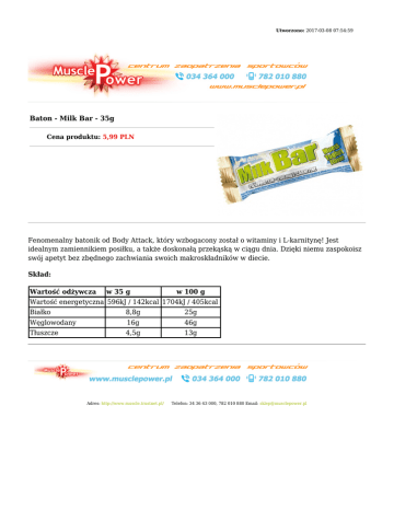 Utworzono: 2017-03-08 07:54:59 Baton - Milk Bar - 35g Cena produktu: 5,99 PLN Fenomenalny batonik od Body Attack, który wzbogacony został o witaminy i L-karnitynę! Jest idealnym zamiennikiem posiłku, a także doskonałą przekąską w ciągu dnia. Dzięki niemu zaspokoisz swój apetyt bez zbędnego zachwiania swoich makroskładników w diecie. Skład: Wartość odżywcza w 35 g w 100 g Wartość energetyczna 596kJ / 142kcal 1704kJ / 405kcal Białko 8,8g 25g Węglowodany 16g 46g Tłuszcze 4,5g 13g Adres: http://www.muscle.trustnet.pl/ Telefon: 34 36 43 000, 782 010 880 Email: [email protected]