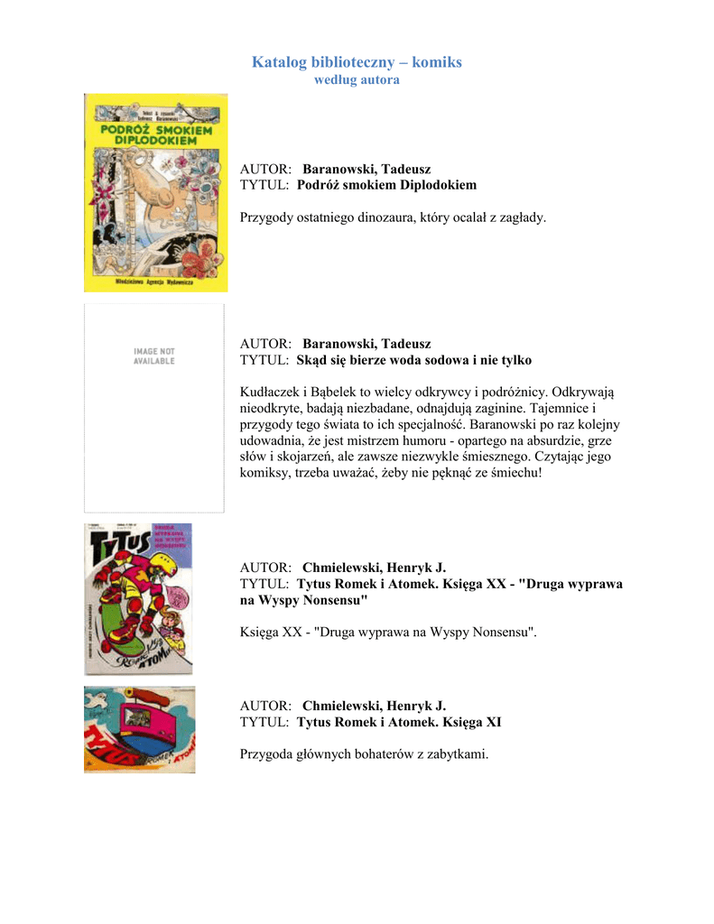 Katalog biblioteczny – komiks według autora AUTOR: Baranowski, Tadeusz TYTUL: Podróż smokiem Diplodokiem Przygody ostatniego dinozaura, który ocalał z zagłady. AUTOR: Baranowski, Tadeusz TYTUL: Skąd się bierze woda sodowa i nie tylko Kudłaczek i Bąbelek to wielcy odkrywcy i podróżnicy. Odkrywają nieodkryte, badają niezbadane, odnajdują zaginine. Tajemnice i przygody tego świata to ich specjalność. Baranowski po raz kolejny udowadnia, że jest mistrzem humoru - opartego na absurdzie, grze słów i skojarzeń, ale zawsze niezwykle śmiesznego. Czytając jego komiksy, trzeba uważać, żeby nie pęknąć ze śmiechu! AUTOR: Chmielewski, Henryk J. TYTUL: Tytus Romek i Atomek. Księga XX - "Druga wyprawa na Wyspy Nonsensu" Księga XX - "Druga wyprawa na Wyspy Nonsensu". AUTOR: Chmielewski, Henryk J. TYTUL: Tytus Romek i Atomek. Księga XI Przygoda głównych bohaterów z zabytkami. AUTOR: Chmielewski, Henryk J. TYTUL: Tytus Romek i Atomek księga I Dwaj przyjaciele – harcerze, Romek i A'tomek – starają się uczłowieczyć człekokształtną małpę – Tytusa de Zoo, posiadającego, wbrew pozorom, więcej cech ludzkich niż małpich. AUTOR: Chmielewski, Henryk J. TYTUL: Tytus Romek i Atomek - księga I Dwaj przyjaciele – harcerze, Romek i A'tomek – starają się uczłowieczyć człekokształtną małpę – Tytusa de Zoo, posiadającego, wbrew pozorom, więcej cech ludzkich niż małpich. AUTOR: Christa, Janusz TYTUL: Kajko i Kokosz. Cudowny lek Zbójcerze wymyślają plan zdobycia Mirmiłowa - używają swego chorego Kaprala jako broni biologicznej. Dla zarażonego Kasztelana jedynym ratunkiem jest cudowna woda ze źródła Pochwista. Po wodę wyruszają Kajko i Kokosz w towarzystwie smoka Milusia. Niestety źródło jest zatrute i aby przełamać czar, trzeba pokonać wiele przeszkód. AUTOR: Christa, Janusz TYTUL: Kajko i Kokosz na wczasach "Do grodu kasztelana Mirmiła przybył książęcy rerent do spraw turystyki i wypoczynku...." Tak się zaczyna kolejny komiks znanego rysownika Janusza Christy "Na wczasach". Okazało się, że Mirmiłowo otrzymało tylko jedno skierowanie. Los zadecydował, że skierowanie dostanie Kajko, ale co począć z nieodłącznym przyjacielem Kokoszem? AUTOR: Christa, Janusz TYTUL: Kajko i Kokosz - rozprawa z Dajmiechem" Jest to dalszy ciąg niezwykłych przygód Kajka i Kokosza, zbójadżentelmena Łamignata, jego żony - czarownicy Jagi i kasztelana Mirmiła, barwnie opisanych i narysowanych. AUTOR: Christa, Janusz TYTUL: Kajko i Kokosz. Zamach na Milusia Co można znaleźć w lesie? Jajko. Co może wykluć się z jajka? Smok. Smok o imieniu Miluś. Sympatyczny jarosz, który panicznie boi się myszy i jest strasznym psotnikiem. Nad wybrykami Milusia nie potrafią zapanować nawet jego przybrani rodzice - Kajko i Kokosz. A jeśli dorzucimy do tego Zbójcerzy, którzy nie są zachwyceni pojawieniem się dzikiej bestii w Mirmiłowie otrzymamy komiks, który rozbawi wszystkich do łez. AUTOR: Goscinny, Rene TYTUL: Asteriks - Album 18 Dzięki dobrym pomysłom, sprytowi i łykowi magicznego napoju, Asteriks szczęśliwie wypełnia swą misję w najcudowniejszym mieście świata. Objawia też przed Rzymianami swe nowe talenty retoryczny w sądzie i kulinarny w kuchni Klaudiusza. AUTOR: Makuszyński, Kornel TYTUL: Za króla Piasta Polska wyrasta Komiks Kornela Makuszyńskiego w bardzo prosty i zabawny sposób opowiada o legendarnych dziejach Polski, przekazując jednocześnie zachwyt nad jej pięknem i tradycjami. Rysunki wykonała Szarlota Pawel – znana współczesna rysowniczka; największą popularność przyniosły jej serie komiksowe „Jonka, Jonek i Kleks” oraz „Kubuś Piekielny”. AUTOR: Nehrebecki, R. TYTUL: Sensacyjne odkrycie Jest to bardzo lubiana przez dzieci forma przedstawienia akcji jaką jest komiks. Głównymi bohaterami komiksu są znane postacie filmółw animowanych: Bolek i Lolek. AUTOR: Pagot, Ton TYTUL: Jan Paweł II. Papież trzeciego tysiąclecia Świetnie napisana biografia polskiego papieża Jana Pawła II. Autor używa języka młodzieżowego, teksty są ciekawe a zarazem zawierające dużo informacji. Poznajemy losy polskiego papieża od czasów jego narodzenia aż po wizytę na Kubie. Pozycja warta polecenia… AUTOR: Riyoko, Ikeda TYTUL: Aż do nieba t. 2. Tajemnicza historia Polski Autorka Rioyko Ikeda sięgnęła do pasjonujących kart historii Polski, ukazując niezwykle ważne, a jednocześnie tragiczne w dziejach Rzeczypospolitej, wydarzenia z przełomu XVIII i XIX wieku. Bohaterem serii jest książę Józef Poniatowski. AUTOR: Sieniutycz, Anna TYTUL: Bob & Bill. Oto i oni Komiks “Bob & Bill” to wesołe przygody dla całej Rodziny, śmieszny, mądry i sympatyczny. Bob & Bill. Oto i oni to komiks dla tych co lubią psy (a szczególnie cocker spaniele), inteligentny dowcip i sympatyczne rysunki. AUTOR: Skarżycki, Rafał TYTUL: W pustyni i w puszczy Komiks "W pustyni i w puszczy" to adaptacja powieści Henryka Sienkiewicza pod tym samym tytułem. Jest to piękna opowieść o dwójce dzieci, Stasiu i Nel, zagubionych w sercu dzikiej Afryki. Komiksowa adaptacja tej historii opowiada o ich porwaniu i ucieczce, walce z dzikimi zwierzętami, chorobami i samotnością. AUTOR: Widenlocher, Herle TYTUL: Nabuchodinozaur. Wstęp do niby-prehistorii Świetny komiks, którego bohaterem jest pierwszy w historii myślący i rozumny dinozaur nazywany Nabuchodinozaurem. Ten zabawny komiks przeznaczony jest dla tych wszystkich, którzy lubią dinozaury i przygody.