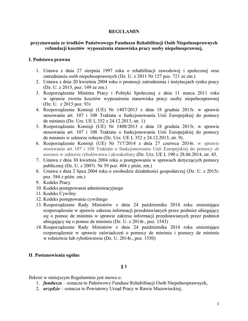 REGULAMIN przyznawania ze środków Państwowego Funduszu Rehabilitacji Osób Niepełnosprawnych refundacji kosztów wyposażenia stanowiska pracy osoby niepełnosprawnej. I. Podstawa prawna 1. Ustawa z dnia 27 sierpnia 1997 roku o rehabilitacji zawodowej i społecznej oraz zatrudnianiu osób niepełnosprawnych (Dz. U. z 2011 Nr 127 poz. 721 ze zm.) 2. Ustawa z dnia 20 kwietnia 2004 roku o promocji zatrudnienia i instytucjach rynku pracy (Dz. U. z 2015, poz. 149 ze zm.) 3. Rozporządzenie Ministra Pracy i Polityki Społecznej z dnia 11 marca 2011 roku w sprawie zwrotu kosztów wyposażenia stanowiska pracy osoby niepełnosprawnej (Dz. U. z 2015 poz. 93) 4. Rozporządzenie Komisji (UE) Nr 1407/2013 z dnia 18 grudnia 2013r. w sprawie stosowania art. 107 i 108 Traktatu o funkcjonowaniu Unii Europejskiej do pomocy de minimis (Dz. Urz. UE L 352 z 24.12.2013, str. 1) 5. Rozporządzenie Komisji (UE) Nr 1408/2013 z dnia 18 grudnia 2013r. w sprawie stosowania art. 107 i 108 Traktatu o funkcjonowaniu Unii Europejskiej do pomocy de minimis w sektorze rolnym (Dz. Urz. UE L 352 z 24.12.2013, str. 9). 6. Rozporządzenie Komisji (UE) Nr 717/2014 z dnia 27 czerwca 2014r. w sprawie stosowania art. 107 i 108 Traktatu o funkcjonowaniu Unii Europejskiej do pomocy de minimis w sektorze rybołówstwa i akwakultury (Dz. Urz. UE L 190 z 28.06.2014, str. 45. 7. Ustawa z dnia 30 kwietnia 2004 roku o postępowaniu w sprawach dotyczących pomocy publicznej (Dz. U. z 2007r. Nr 59 poz. 404 z późn. zm.) 8. Ustawa z dnia 2 lipca 2004 roku o swobodzie działalności gospodarczej (Dz. U. z 2015r. poz. 584 z późn. zm.) 9. Kodeks Pracy 10. Kodeks postępowania administracyjnego 11. Kodeks Cywilny 12. Kodeks postępowania cywilnego 13. Rozporządzenie Rady Ministrów z dnia 24 października 2014 roku zmieniające rozporządzenie w sprawie zakresu informacji przedstawianych przez podmiot ubiegający się o pomoc de minimis w sprawie zakresu informacji przedstawianych przez podmiot ubiegający się o pomoc de minimis (Dz. U. z 2014r., poz. 1543) 14. Rozporządzenie Rady Ministrów z dnia 24 października 2014 roku zmieniające rozporządzenie w sprawie zaświadczeń o pomocy de minimis i pomocy de minimis w rolnictwie lub rybołówstwie (Dz. U. 2014r., poz. 1550) II. Postanowienia ogólne §1 Ilekroć w niniejszym Regulaminie jest mowa o: 1. funduszu – oznacza to Państwowy Fundusz Rehabilitacji Osób Niepełnosprawnych, 2. urzędzie – oznacza to Powiatowy Urząd Pracy w Rawie Mazowieckiej, 1 3. dyrektorze – oznacza to Dyrektora Powiatowego Urzędu Pracy w Rawie Mazowieckiej, działającego w imieniu Starosty Rawskiego, 4. wnioskodawcy – oznacza to pracodawcę, który zatrudni osobę niepełnosprawną, 5. osobie niepełnosprawnej – oznacza to osobę niepełnosprawną, zarejestrowaną w powiatowym urzędzie pracy w Rawie Mazowieckiej, jako osoba bezrobotna albo poszukująca pracy niepozostająca w zatrudnieniu, 6. refundacji kosztów – oznacza to zwrot kosztów wyposażenia stanowiska pracy osoby niepełnosprawnej, zatrudnionej na co najmniej 36 miesięcy 7. wniosku o przyznanie refundacji kosztów – oznacza to Wniosek o przyznanie refundacji kosztów wyposażenia stanowiska pracy osoby niepełnosprawnej wraz z załącznikami (Wn-W (1)), 8. zestawieniu poniesionych kosztów – oznacza to Wniosek o przyznanie refundacji kosztów wyposażenia stanowiska pracy osoby niepełnosprawnej wraz z załącznikami (Wn-W (2)), 9. przeciętnym wynagrodzeniu – oznacza to przeciętne miesięczne wynagrodzenie w gospodarce narodowej w poprzednim kwartale licząc od pierwszego dnia następnego miesiąca po ogłoszeniu przez Prezesa Głównego Urzędu Statystycznego w Dzienniku Urzędowym Rzeczpospolitej Polskiej „Monitor Polski”. §2 Czynności administracyjne związane z przyznawaniem zwrotu kosztów polegają w szczególności na udzielaniu informacji, rejestracji wniosków, merytorycznej i rachunkowej ocenie zgłoszonych wniosków, rejestracji i realizacji zawartych umów oraz prowadzeniu korespondencji w powyższych sprawach. §3 W uzasadnionych przypadkach, gdy liczba składanych wniosków zakłóci prawidłowy tok ich terminowego rozpatrywania, Urząd zastrzega sobie możliwość przedłużenia terminu rozpatrzenia wniosku i powiadomienia o tym fakcie Wnioskodawcy, wskazując nowy termin, zgodnie z Kodeksem Postępowania Administracyjnego. III. Wysokość wnioskowanych środków §4 Wnioskodawcy może być przyznany zwrot kosztów do wysokości piętnastokrotności przeciętnego wynagrodzenia obowiązującego w dniu podpisania umowy. 2 IV. Warunki ubiegania się i przyznawania środków §5 1. Wnioskodawca zobowiązany jest do pobrania wniosku o przyznanie refundacji – druk Wn-W z Urzędu lub strony internetowej http://pup.rawamazowiecka.ibip.pl i złożenia go w Urzędzie w sposób prawidłowo wypełniony. 2. W przypadku stwierdzenia nieprawidłowości rachunkowych lub formalnych w złożonym wniosku, Urząd: 1) w terminie 14 dni od dnia jego złożenia informuje Wnioskodawcę o stwierdzonych nieprawidłowościach, 2) wzywa Wnioskodawcę do usunięcia nieprawidłowości w terminie 14 dni od dnia doręczenia wezwania. 3. Termin, o którym mowa w ust. 2 pkt. 2) podlega przedłużeniu na pisemny wniosek Wnioskodawcy złożony przed jego upływem, jeżeli usunięcie nieprawidłowości nie może nastąpić w terminie, z przyczyn nieleżących po stronie Wnioskodawcy. 4. W przypadku niezachowania terminu, o którym mowa w ust. 2 pkt. 2, lub terminu określonego zgodnie z ust. 3, Urząd informuje Wnioskodawcę o pozostawieniu wniosku bez rozpatrzenia. 5. W terminie 30 dni od dnia otrzymania kompletnego wniosku, jednak nie wcześniej niż w dniu otrzymania przez Urząd uchwały Rady Powiatu Rawskiego o podziale środków Funduszu, Dyrektor pisemnie informuje Wnioskodawcę o sposobie jego rozpatrzenia: w przypadku negatywnego rozpatrzenia sporządza uzasadnienie, w przypadku pozytywnego rozpatrzenia wzywa Wnioskodawcę 