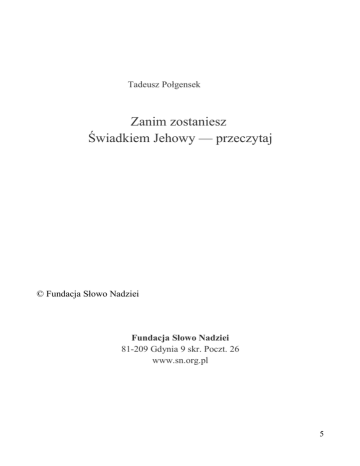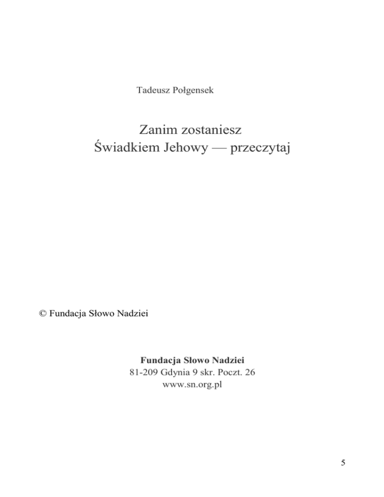 Tadeusz Połgensek Zanim zostaniesz Świadkiem Jehowy — przeczytaj © Fundacja Słowo Nadziei Fundacja Słowo Nadziei 81-209 Gdynia 9 skr. Poczt. 26 www.sn.org.pl 5 PIERWSZE SPOTKANIE Wszystko zaczęło się w pewne piątkowe popołudnie. Dorota właśnie wróciła ze szkoły. Maria, jej matka czekała już z obiadem. Po posiłku dwie kobiety odpoczywały przy kawie. Nagle rozległ się dźwięk dzwonka. — Otwórz Dorotko — odezwała się Maria — to pewnie znowu ktoś do ciebie. — Och mamo, powiedz, że mnie nie ma — spojrzała prosząco — wiesz w poniedziałek mamy klasówkę z fizyki. — No tak... i spróbuj się tu człowieku wyręczyć dziećmi. Ech! Dzwonek zabrzmiał ponownie. Maria nie spodziewała się o tej porze żadnej wizyty. Przez ułamek sekundy pomyślała, że może to listonosz, albo ktoś z gazowni. Kiedy podeszła do drzwi ujrzała dwóch mężczyzn. Wyglądali bardzo porządnie. Jeden z nich trzymał w ręku jakąś czerwoną książkę. Maria na wszelki wypadek założyła łańcuch na drzwi. — Panowie w jakiej sprawie ? — Goście! — Jacy goście? Nie przypominam sobie, abym kogoś na dziś zapraszała — Prawdę mówiąc nie była zachwycona tym najściem. W domu jak zawsze w środku tygodnia panował mały bałagan. Z niepokojem stwierdziła, że nie ma właściwie niczego specjalnego do jedzenia. Pozostała jej jeszcze nadzieja, że ci mężczyźni się pomylili. — Panowie wybaczą, ale naprawdę nie sądzę abyśmy się znali. A może pochodzicie z dalszej rodziny? — Nie z tak dalekiej, mamy wspólnego ojca i matkę. — No wie pan! Ten żart był nie na miejscu. Przecież doskonale znam swoje rodzeństwo! — Niewątpliwie. Jednak nie pani ojca ani matkę mieliśmy na uwadze, lecz naszych prarodziców Adama i Ewę, których stworzył Bóg. Przyzna pani, że od tego czasu upłynęło wiele lat i dużo się w dzisiejszym świecie zmieniło. Na każdym kroku daje się zauważyć to, o czym pisał jeden z apostołów: Poza tym wiedz Tymoteuszu, że w czasach ostatecznych nadejdą dni, w których niełatwo będzie być chrześcijaninem. Ludzie będą kochać tylko siebie i pieniądze. Pyszałkowie i zarozumialcy, nieposłuszni rodzicom, niewdzięczni i zepsuci, będą drwić z Boga. Nieczuli i nieustępliwi, niepoprawni kłamcy, wywoływać będą zamieszki, a zasady moralności utracą dla nich wszelkie znaczenie. Szorstcy i okrutni, będą drwić z ludzi czyniących dobro. 6 Niezrównoważeni i zarozumiali, zdradzający swych przyjaciół, będą stawiać przyjemność ponad Boga. Do kościoła oczywiście będą chodzić, ale faktycznie nie będą wierzyć niczemu, co tam usłyszą. Wystrzegaj się takich ludzi. Napisał to apostoł Paweł w Drugim Liście do Tymoteusza 3:1-5. — Istotnie tacy są dzisiaj ludzie. Ale, kim wy właściwie jesteście? — Ja nazywam się Adam Nowacki, a to mój brat, Roman. Jesteśmy chrześcijanami, którzy zwiastują ludziom dobrą nowinę o tym, że Pan Jezus w roku 1914 objął panowanie w niebie, a niebawem Jehowa przyjdzie rozliczyć się z wszystkimi ludźmi, którzy nie są mu posłuszni, nie uznają Jego świętego Imienia i Jego Organizacji, którą kieruje. — Co to znaczy, że objął panowanie w niebie'] Mnie uczono, że kiedy Pan Jezus przyjdzie, to będzie oznaczało koniec świata. Jak mam to rozumieć? — Widać, że jest pani osobą myślącą i stawia całkiem logiczne pytania. Pozwoli pani, że wręczymy jej to wspaniale czasopismo, które wyjaśni powstałe wątpliwości. Z pewnością przy czytaniu nasuwać się będzie wiele innych pytań i w tym celu chcielibyśmy zaproponować bezpłatne studium Biblii raz w tygodniu. Co pani na to? — Zaskoczył mnie pan tą propozycją. Wiecie panowie, jestem osobą wierzącą i nie mam zamiaru zmieniać swej religii. — Kto tu mówi o zmianie religii?! My proponujemy bezpłatne studium Biblii za pomocą książki pt.: Będziesz mógł tyć wiecznie w raju na ziemi. Jej zaletą jest to, że odpowiada niemal na wszystkie pytania, nurtujące przeciętnego człowieka. Sama pani przyznaje, że to, co czytaliśmy znajduje odzwierciedlenie w życiu. Czy człowiek, który chodzi do kościoła powinien kłamać, cudzołożyć, kraść? — Chyba nie muszę odpowiadać na to pytanie. A jeśli chodzi o waszą propozycję bezpłatnego poznawania Biblii, to warto się nad tym zastanowić. No cóż, sama nie wiem. A kiedy mielibyśmy się spotkać? — Może w czwartek, około godziny osiemnastej, wtedy mam najwięcej wolnego czasu? —Zaraz spojrzę do swoich notatek... - Roman zaczął wertować notesmoże być, ja też mam o tej godzinie wolny czas. Jestem umówiony na szesnastą trzydzieści, ale mamy do rozważenia krótki rozdział z tej wspomnianej książki. Myślę, że powinienem się czasowo wyrobić. — To panowie tak każdemu proponują studium tej książki? — Każdemu kto wyraża na to ochotę... — Czy to znaczy, że wy nie pracujecie zawodowo? 7 — Ależ tak, ja i Roman pracujemy po osiem godzin. Po południu, kiedy nie mamy zebrań, odwiedzamy naszych mieszkańców. Proponujemy im swój czas, a przede wszystkim poznanie zamierzeń Boga, tak jak to uczyniliśmy u pani. Ale chcielibyśmy odwiedzić resztę mieszkańców tej kamienicy, dlatego zachęcam panią do przeczytania tej publikacji, całkowicie opartej na Piśmie Świętym. Jeżeli nasuną się jakieś pytania odpowiemy na nie, gdy się spotkamy w czwartek. Gdyby ktoś okazał zainteresowanie tą publikacją, proszę ją wypożyczyć bez obaw. Mamy nadzieję, że czas poświęcony na tę rozmowę nie był stracony! Zatem do zobaczenia w czwartek o godzinie osiemnastej. Do widzenia Pani. — Do widzenia. Kiedy Maria zamknęła drzwi zaczęła się zastanawiać, po co właściwie dała się w to wciągnąć. Jeden rzut oka na czasopismo, które trzymała w ręku przekonał ją, że odwiedzili ją Świadkowie Jehowy. Dużo już o nich słyszała i nie zawsze były to pochlebne opi